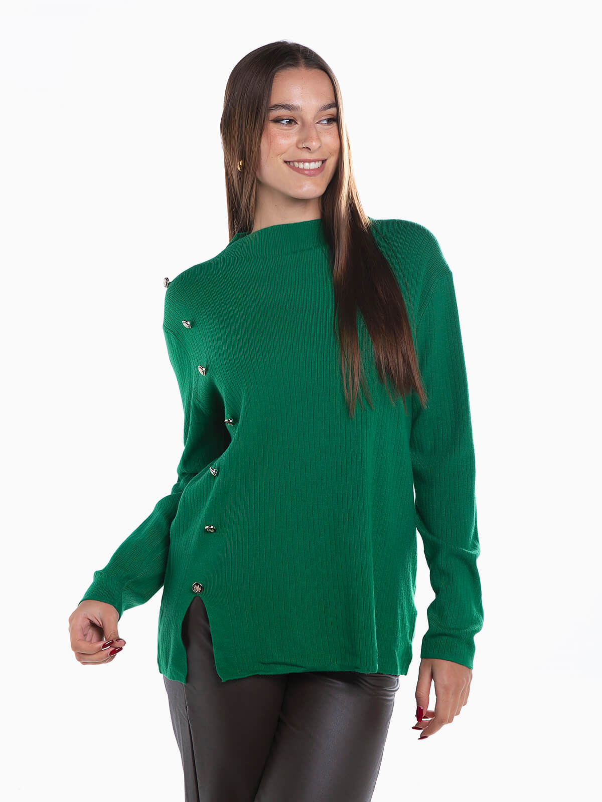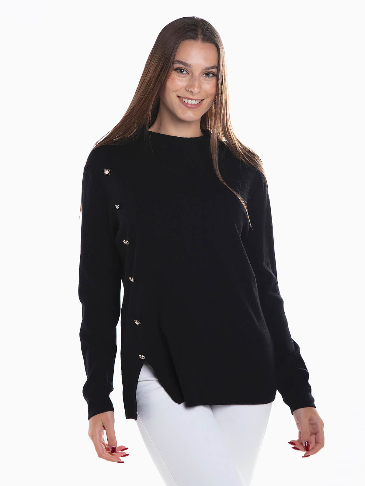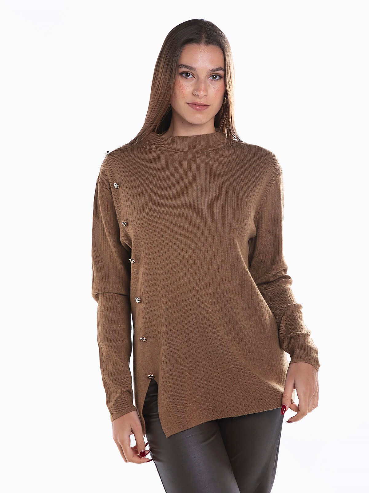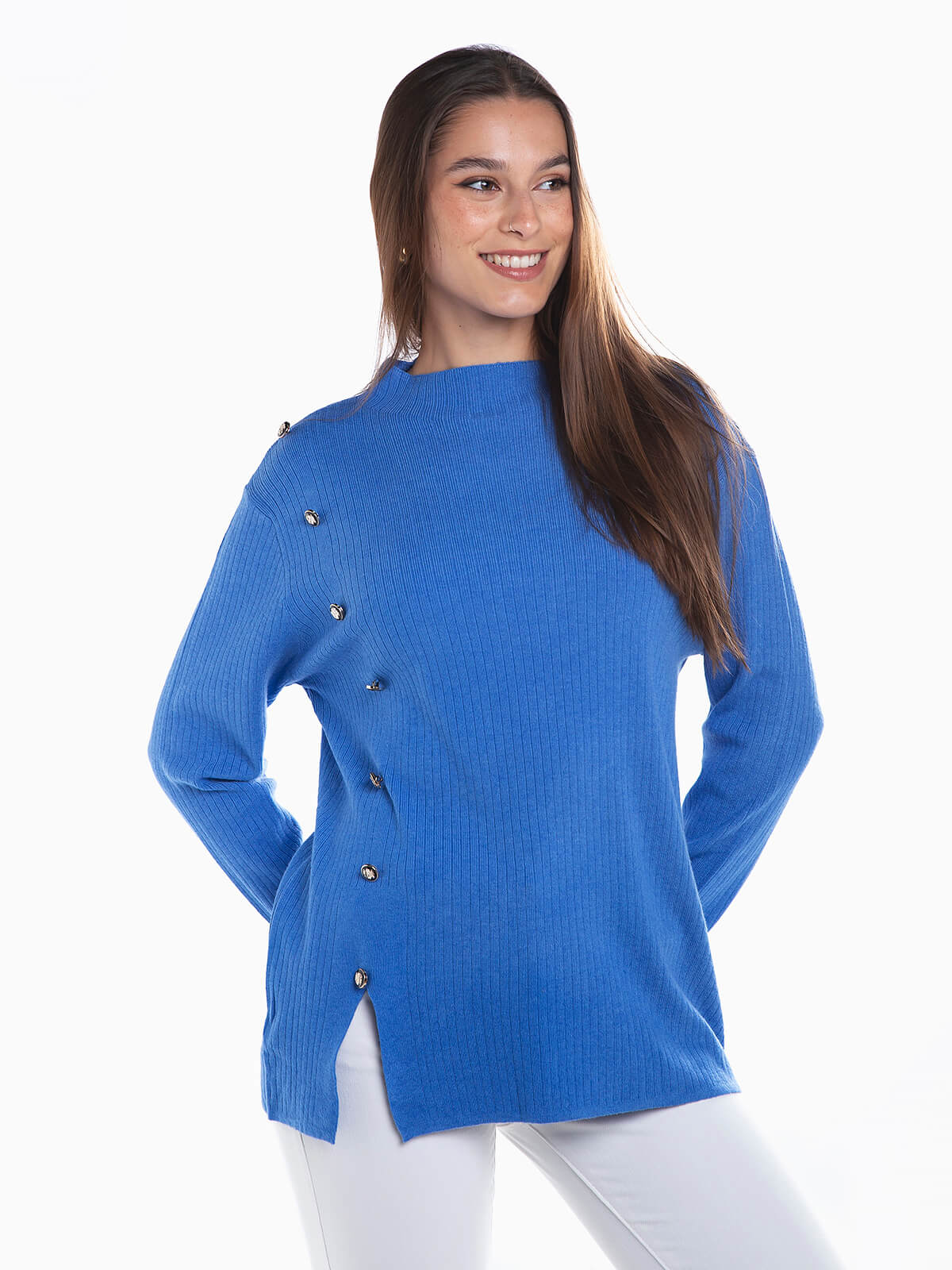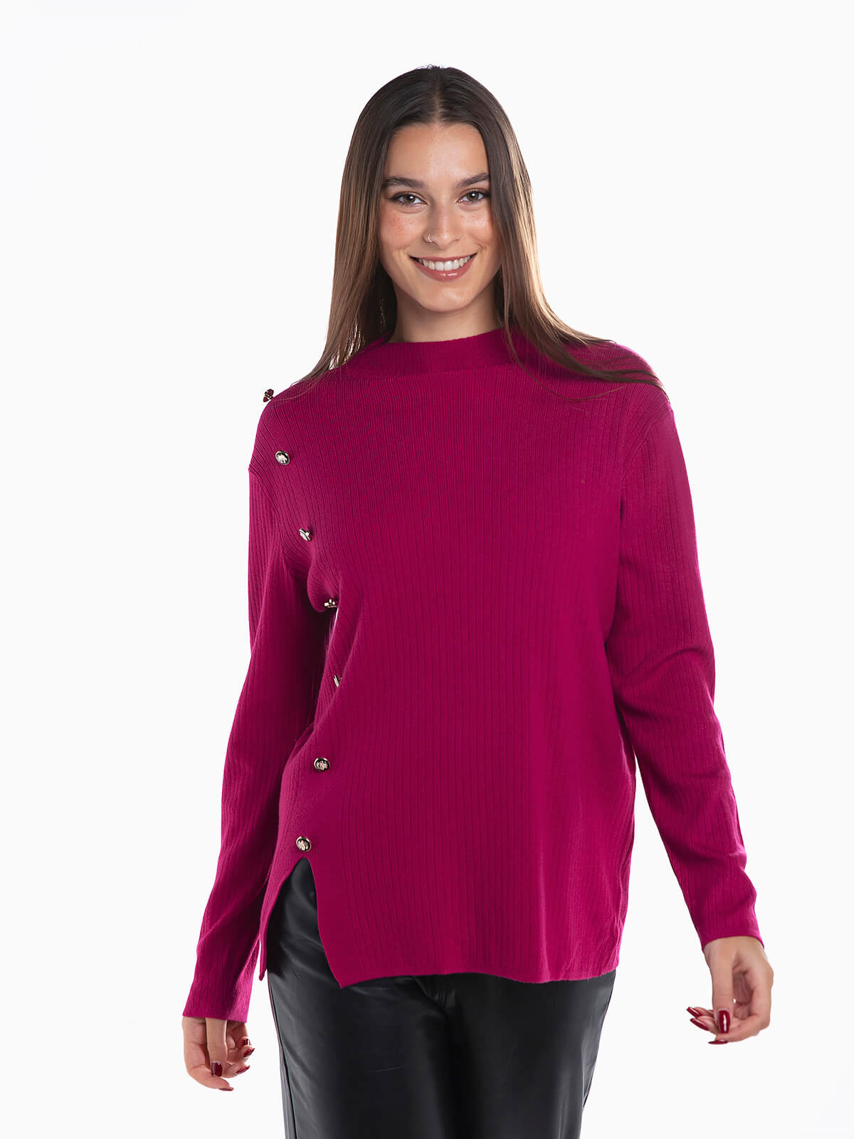 Camisola com botões em malha canelada. Camisola para senhora com manga comprida e gola perkins. Botões decorativos aplicados de lado e abertura.