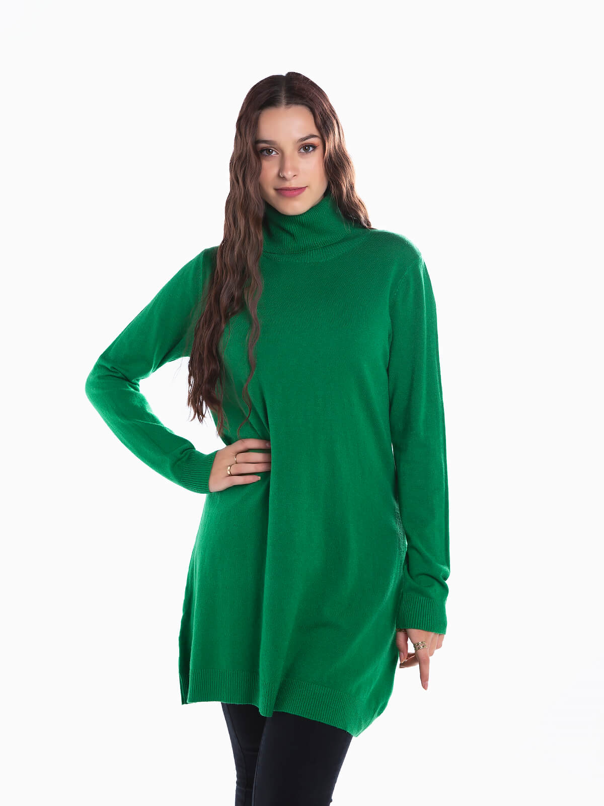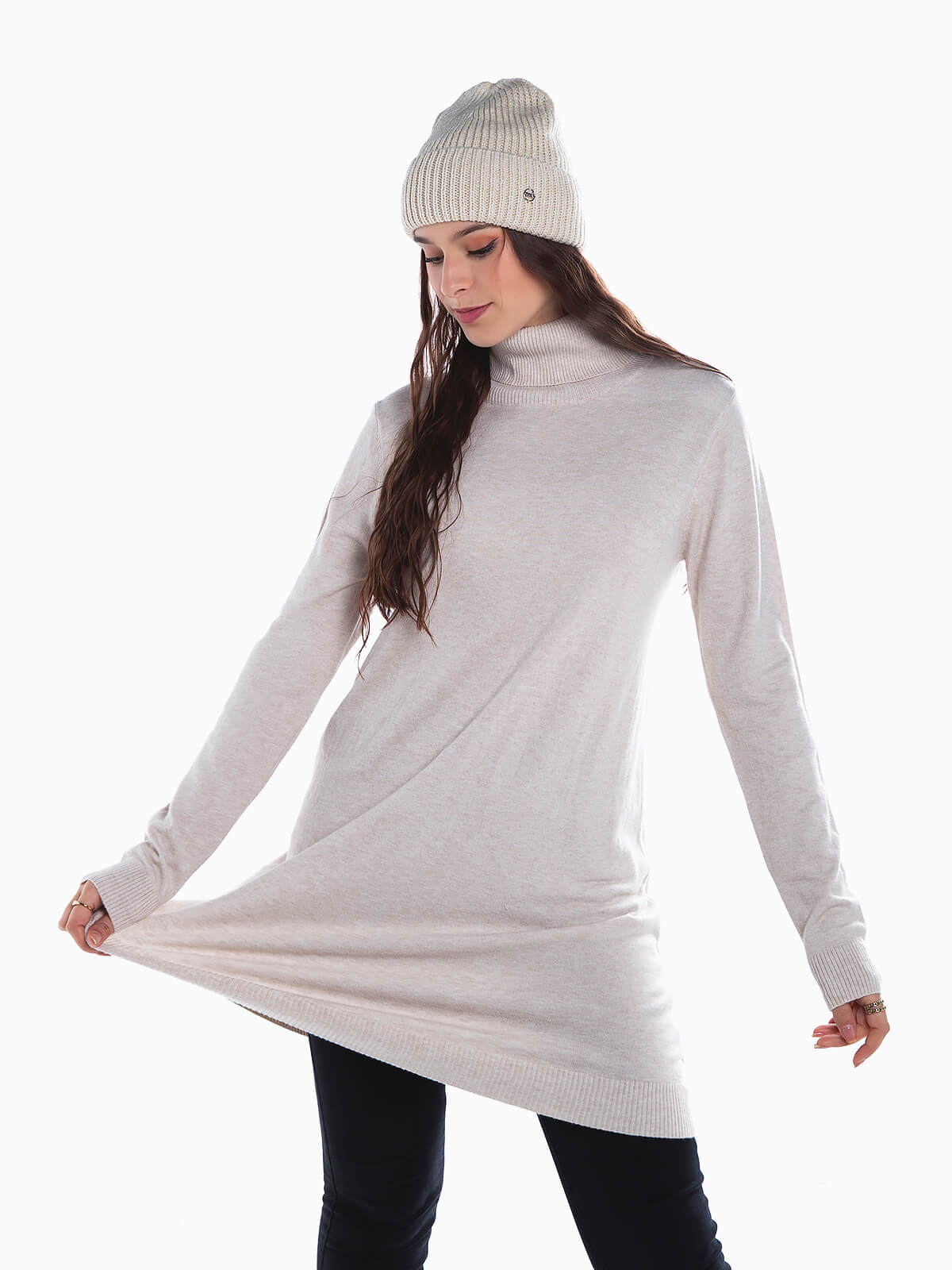 Camisola comprida de malha com gola alta para senhora. Camisola de manga comprida com extremidades caneladas. Malha fina.