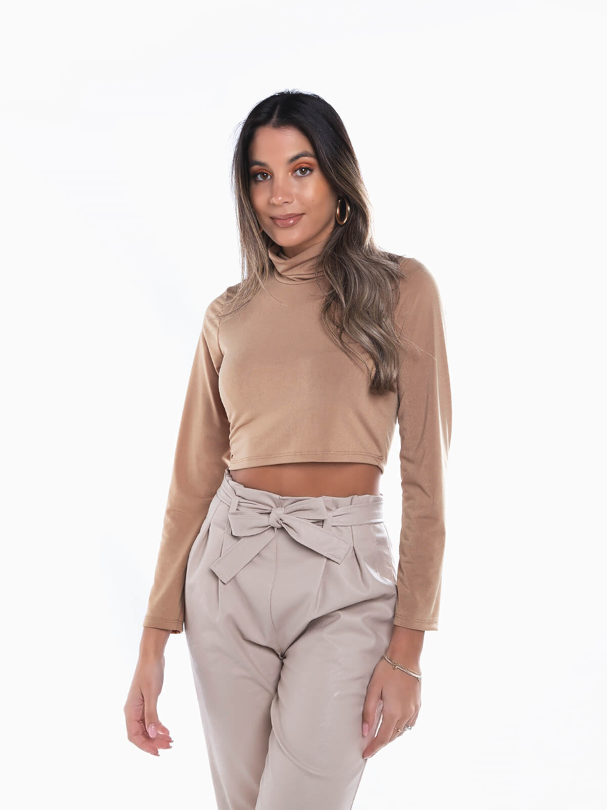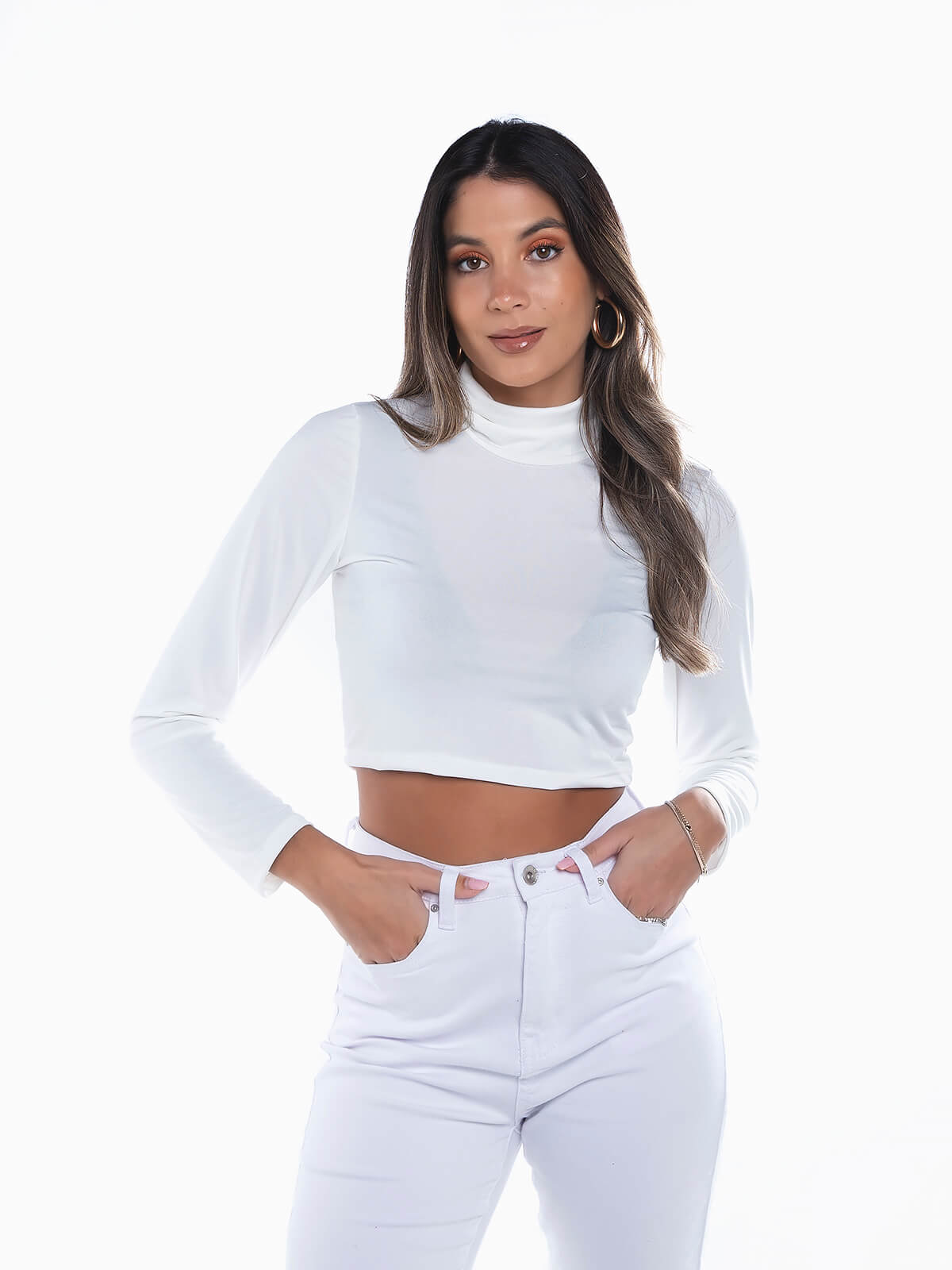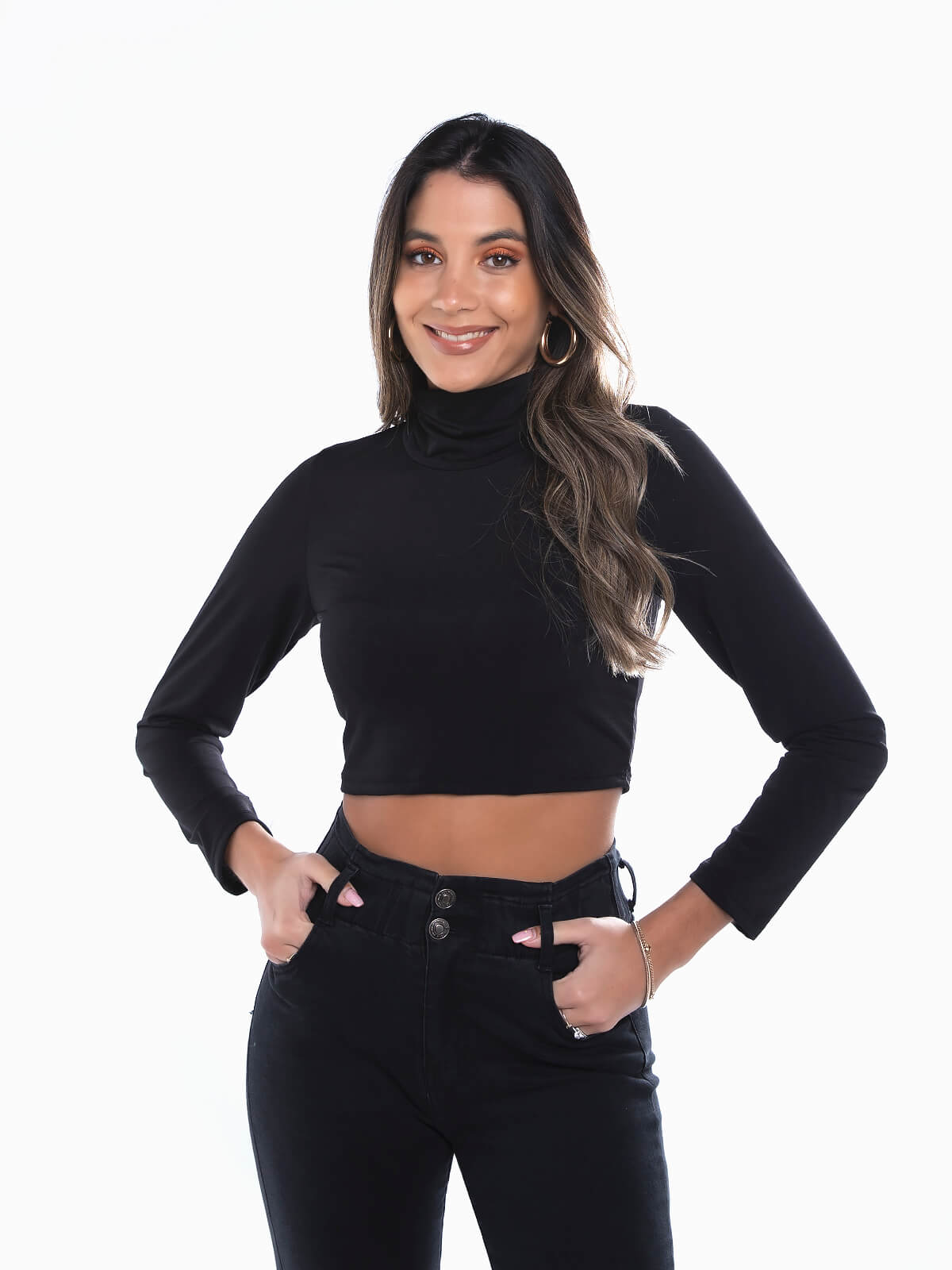 Camisola cropped de gola alta para senhora. Camisola de manga comprida em tecido tipo lycra.