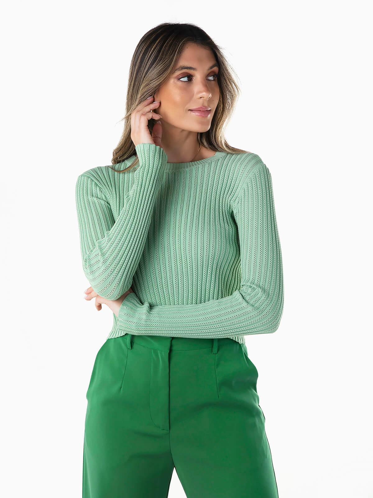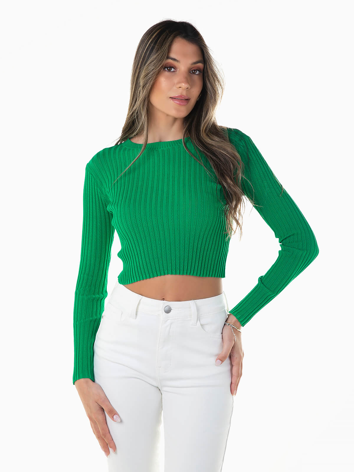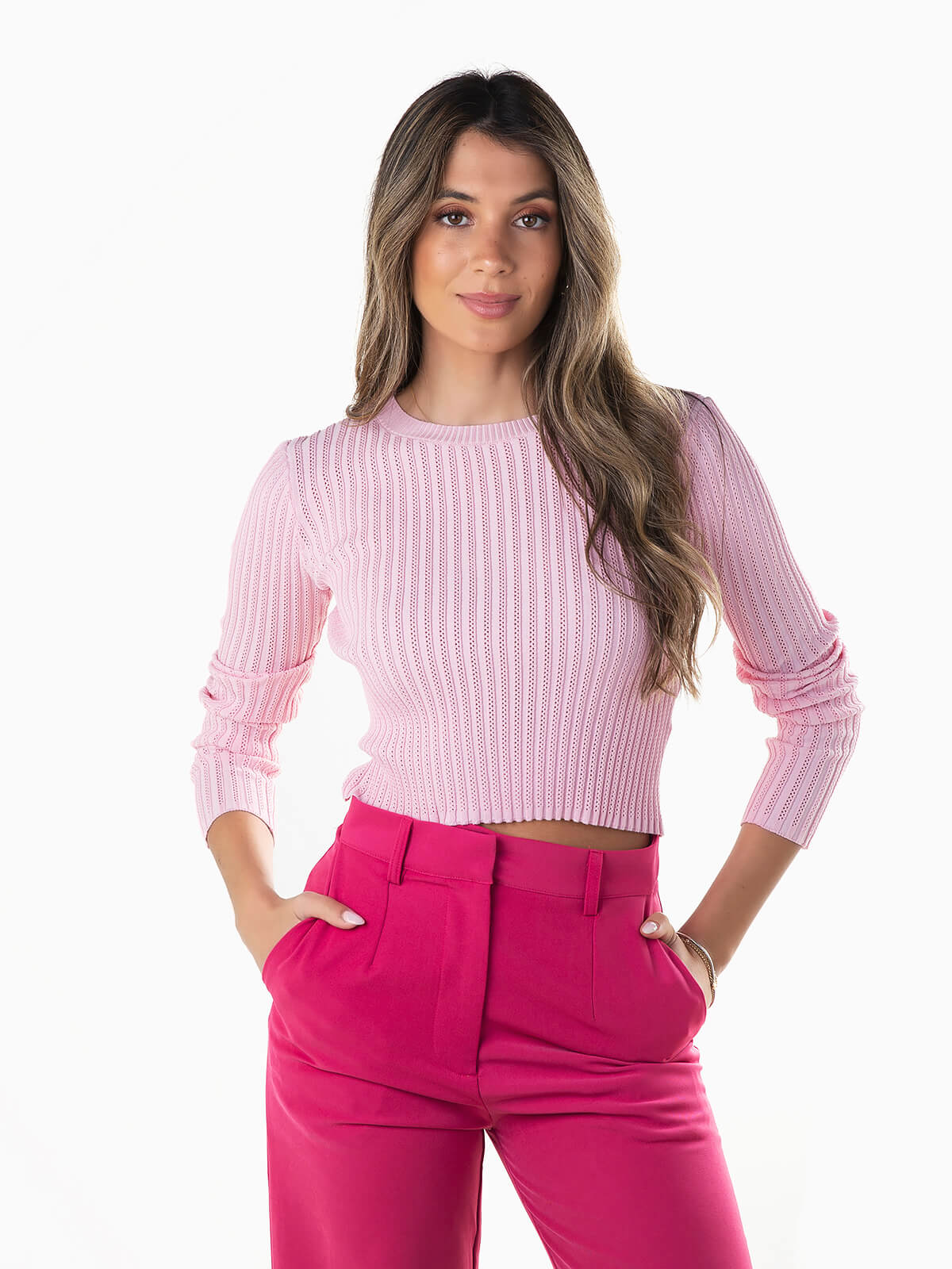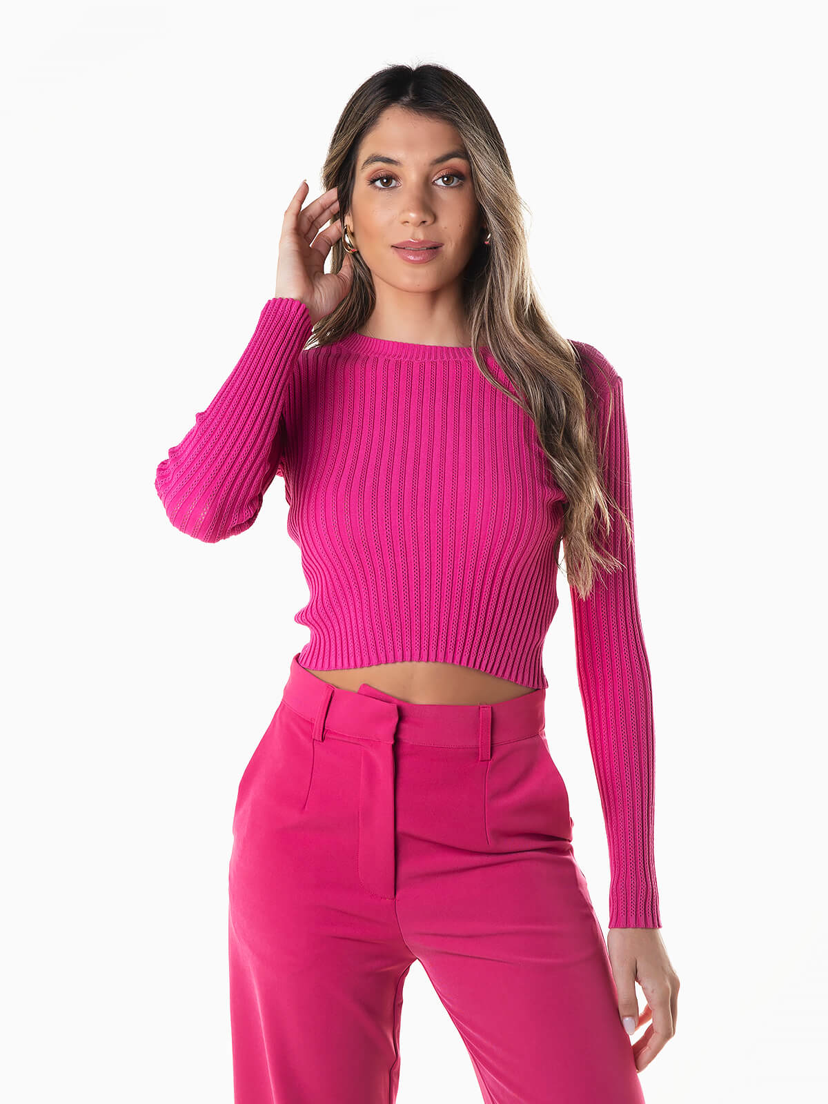 Camisola cropped em malha com relevo para senhora. Camisola manga comprida com decote redondo. Acabamentos em nervuras.