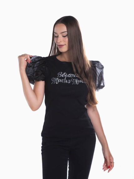 Camisola curta com laço e pérolas aplicados. Camisola com manga 3/4 de gola redonda com pormenor de abertura na frente.