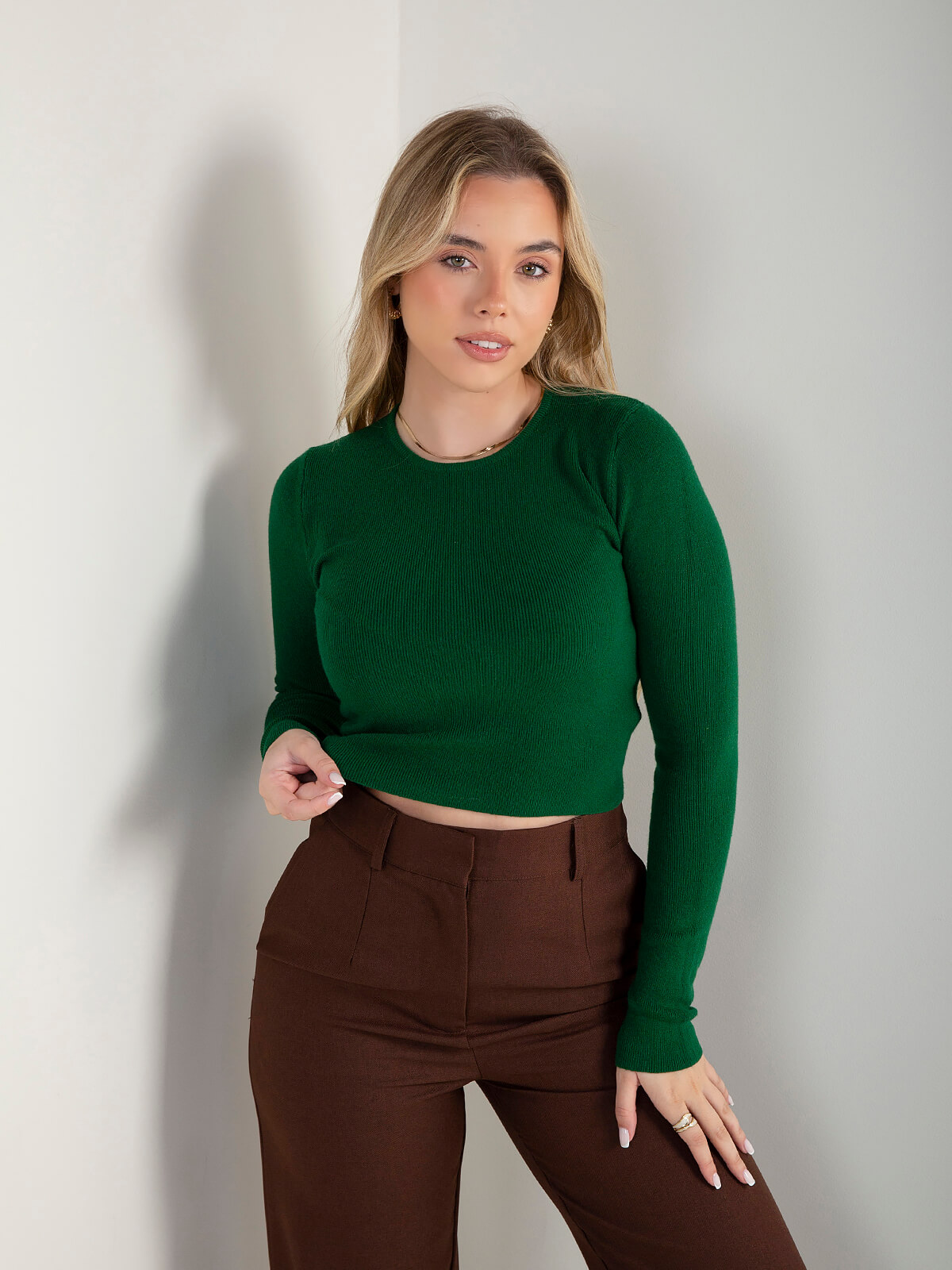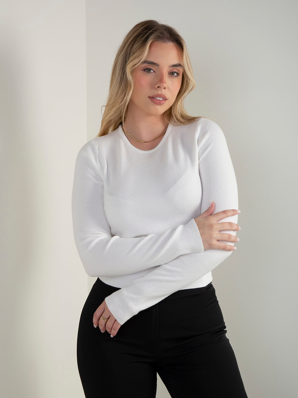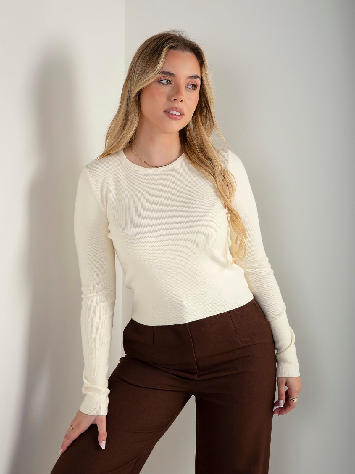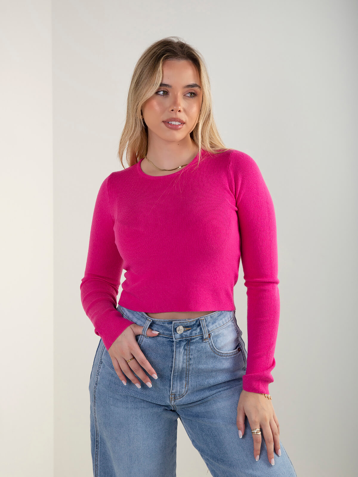 Camisola de malha canelada com decote redondo e manga comprida. Modelo justo e cropped, perfeita para looks do dia a dia com um toque moderno.