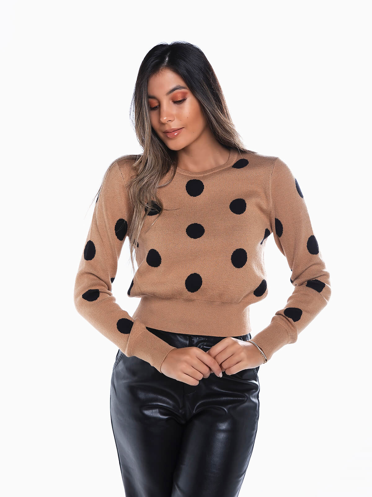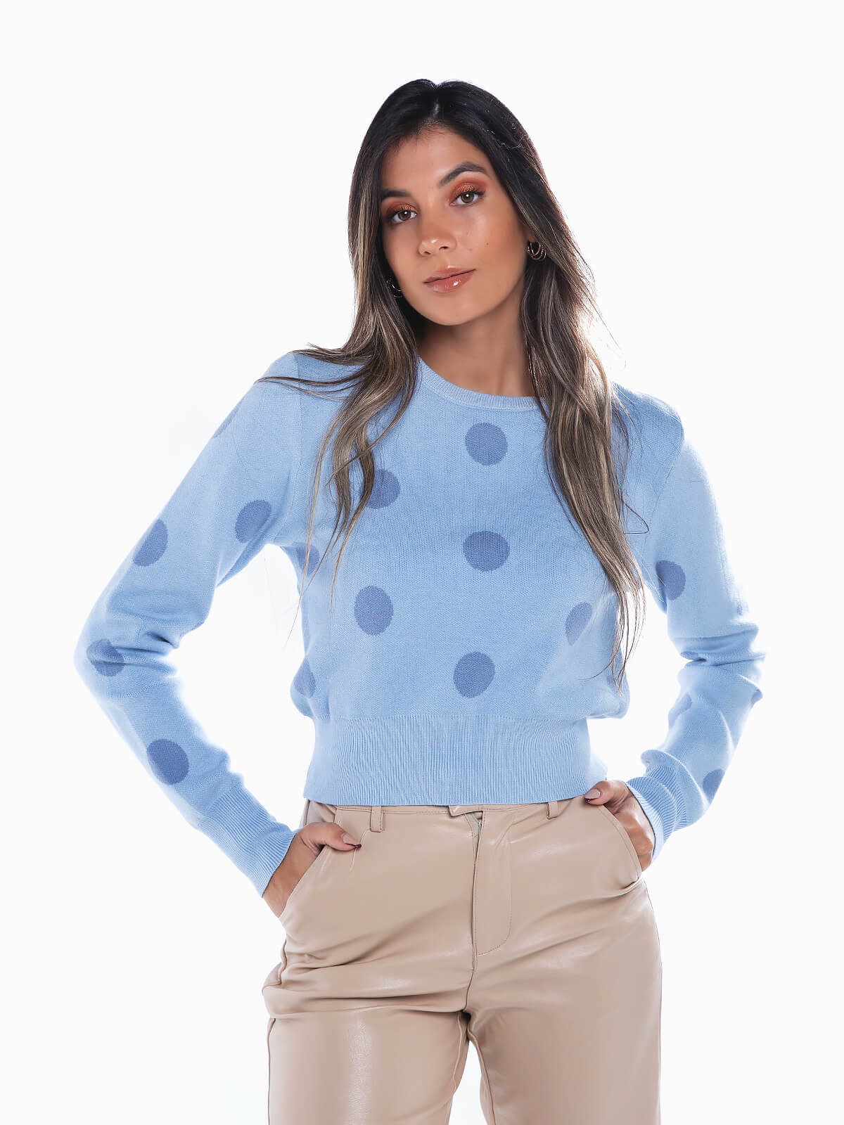 Camisola de malha às bolas para senhora. Camisola de manga comprida de toque suave com cós acabado em tecido canelado. Decote redondo.