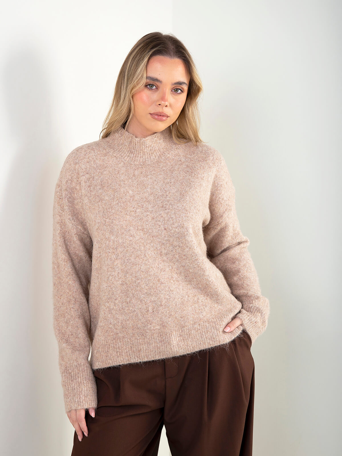 Camisola de malha em tom bege mesclado, com gola subida e acabamento simples. Fácil de conjugar com calças de alfaiataria, ganga ou modelos fluidos. Uma peça essencial de inverno, pensada para looks práticos, atuais e versáteis.