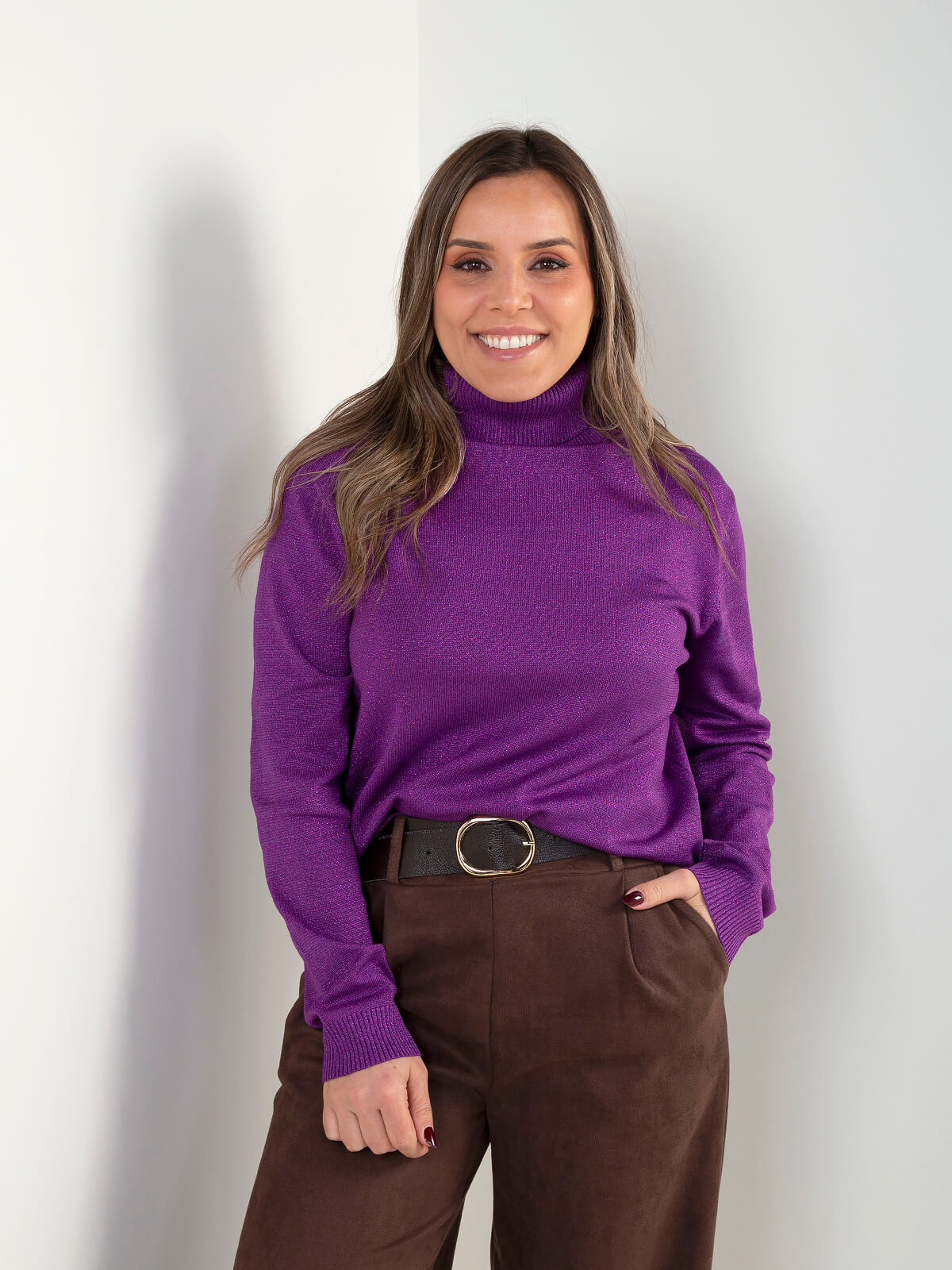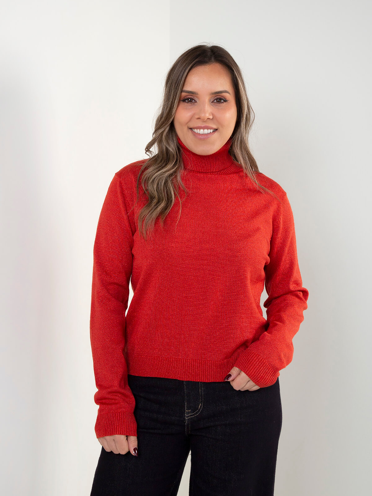 Camisola de malha com acabamento ligeiramente brilhante e gola alta. Modelo de manga comprida com punhos e base canelados, ideal para looks de inverno com um toque elegante.
