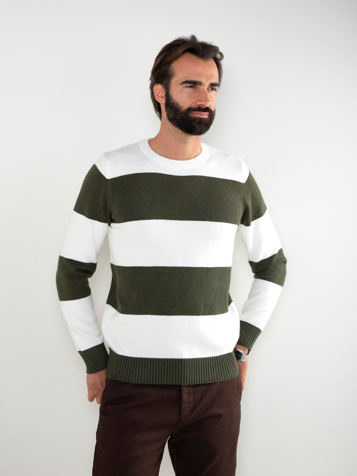 Camisola de malha para homem com design color block. Modelo confortável e atual, com gola redonda e acabamentos canelados. Ideal para looks casuais modernos. Combina com jeans ou calças chino lisas para equilibrar o look e destacar o contraste de cores.