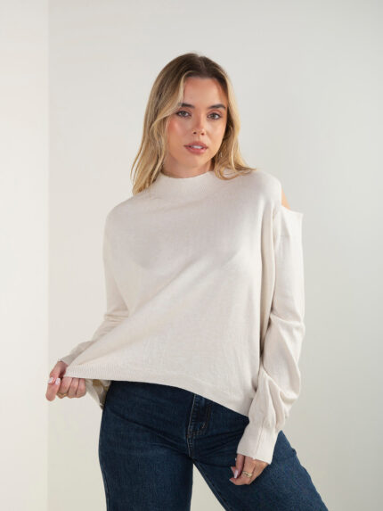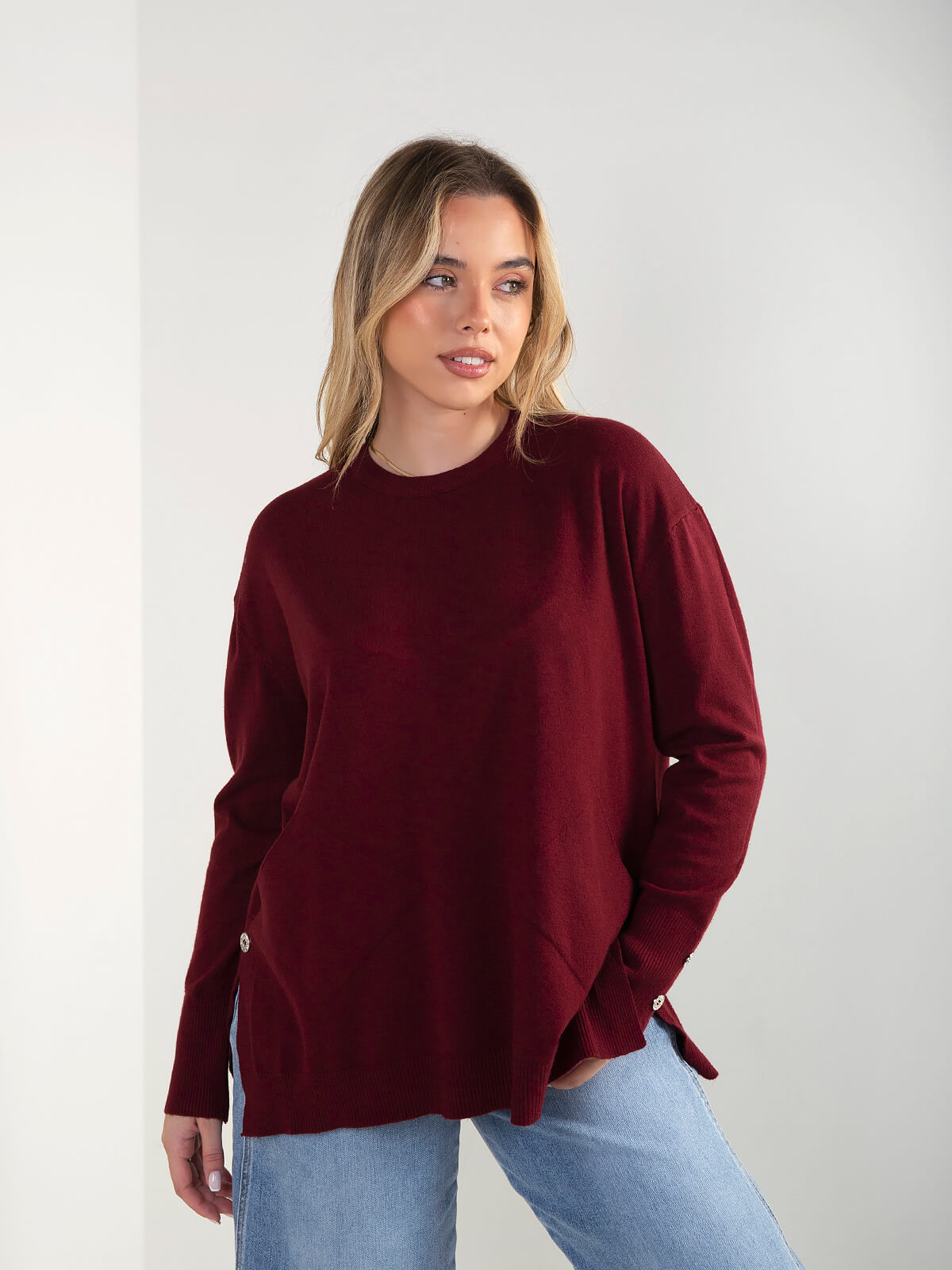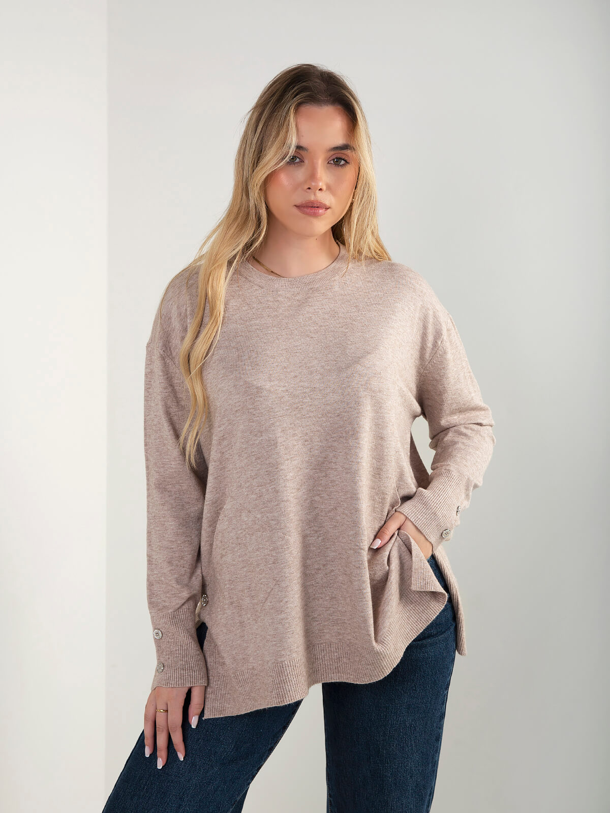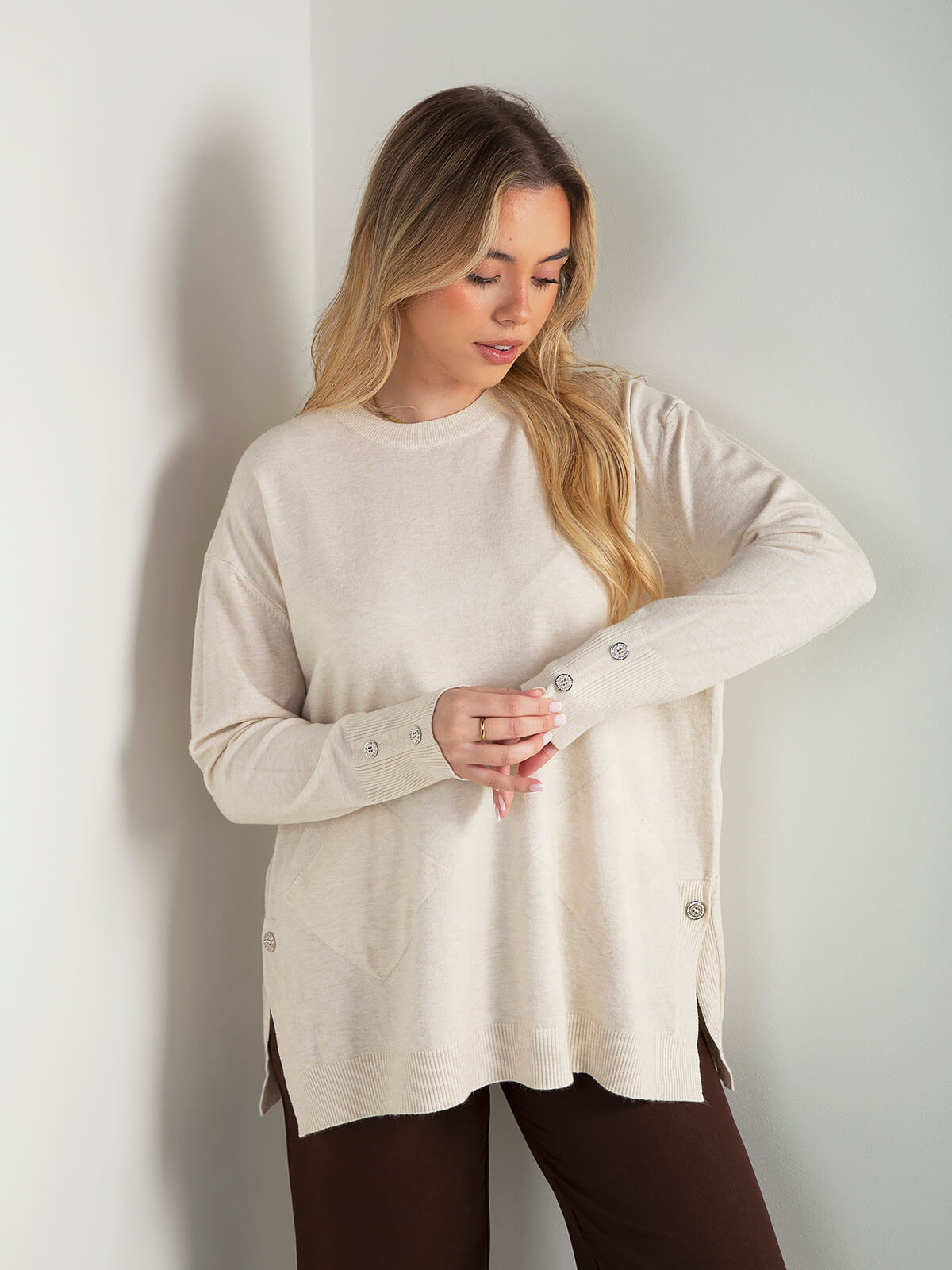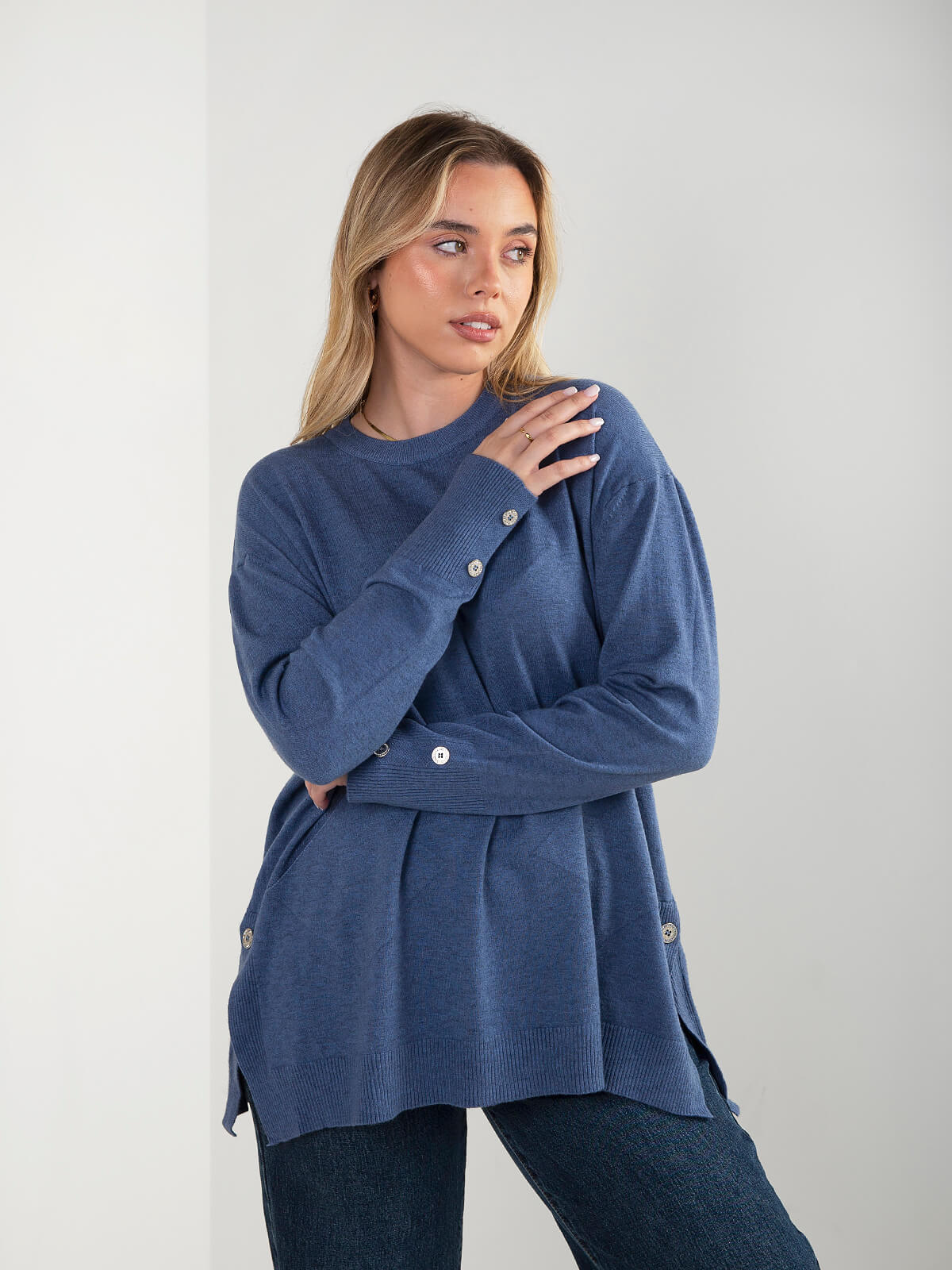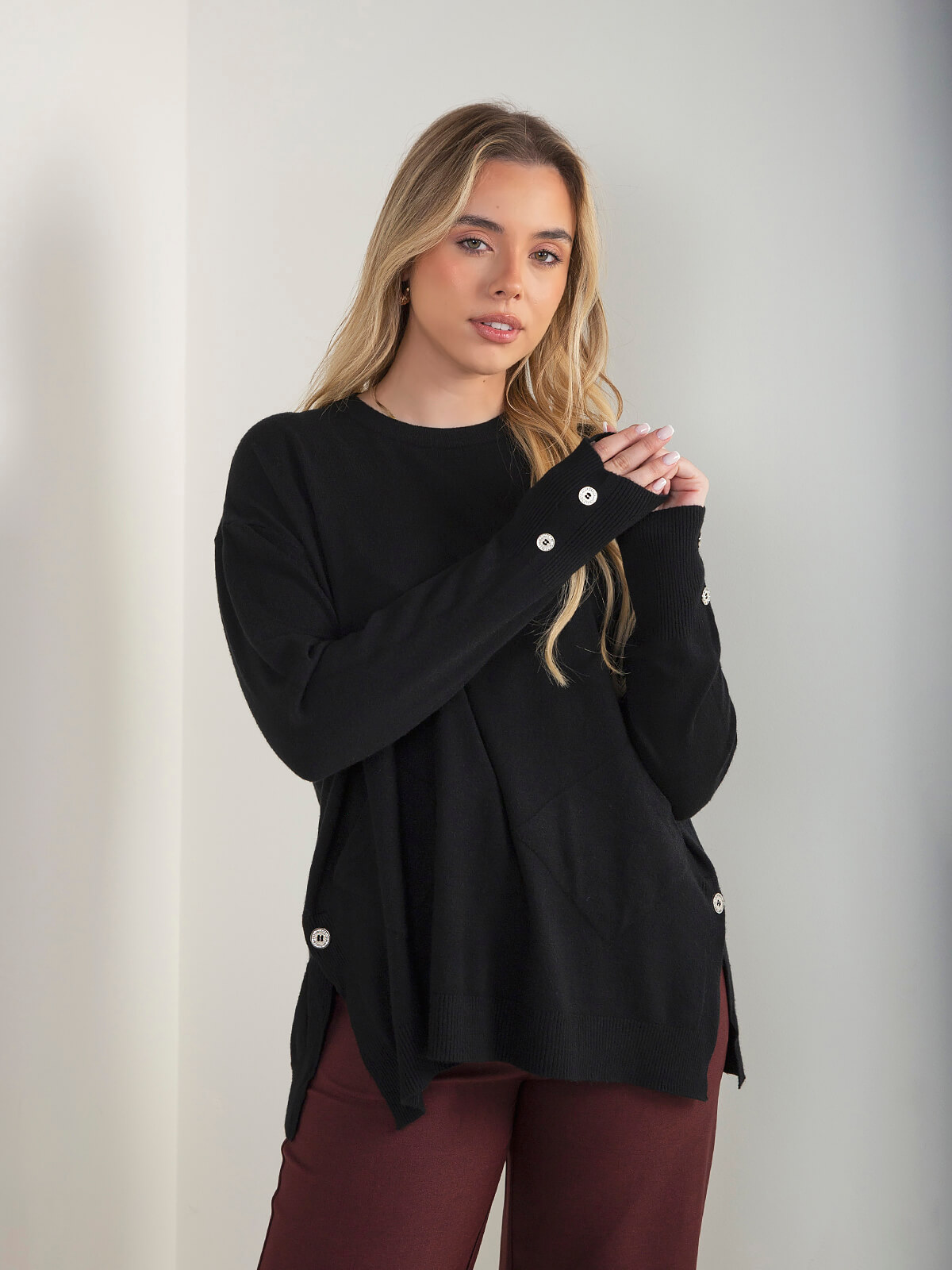 Camisola de malha com bolsos, decote redondo e aberturas com botões decorativos. Confortável, prática e perfeita para looks casuais dentro da moda acessível.