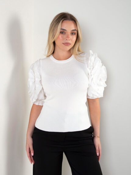 Camisola de malha com folhos e aplicação de pérolas na zona da cava. Modelo de manga comprida com decote redondo. Uma peça feminina e elegante, ideal para dar um toque especial aos looks do dia a dia.