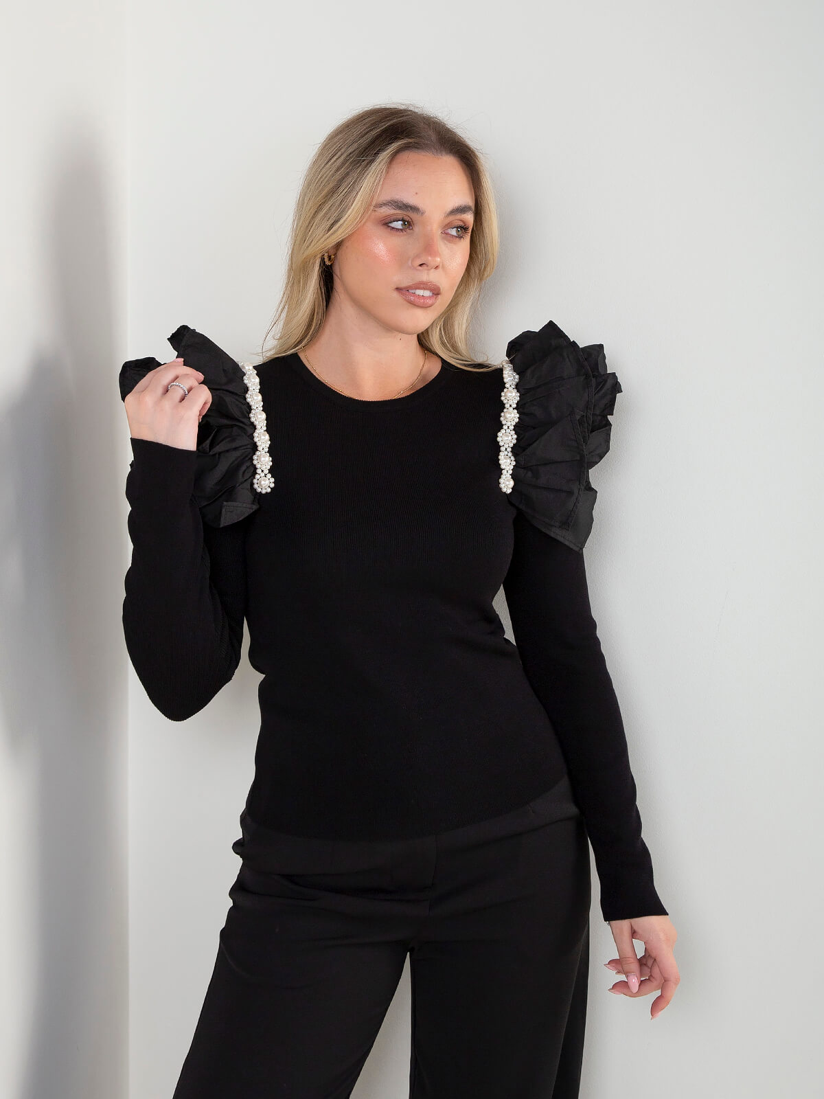 Camisola de malha com folhos e pérolas
