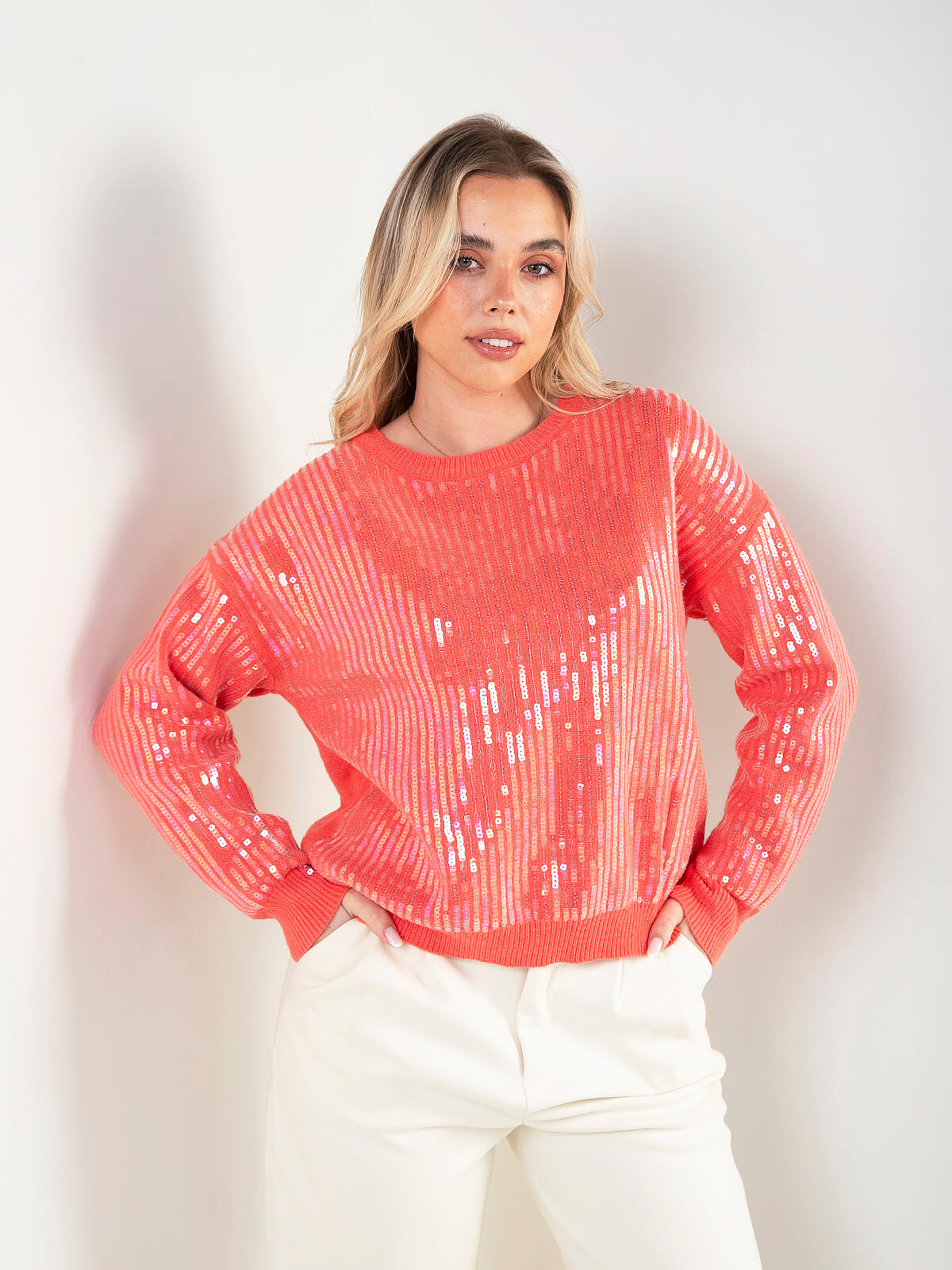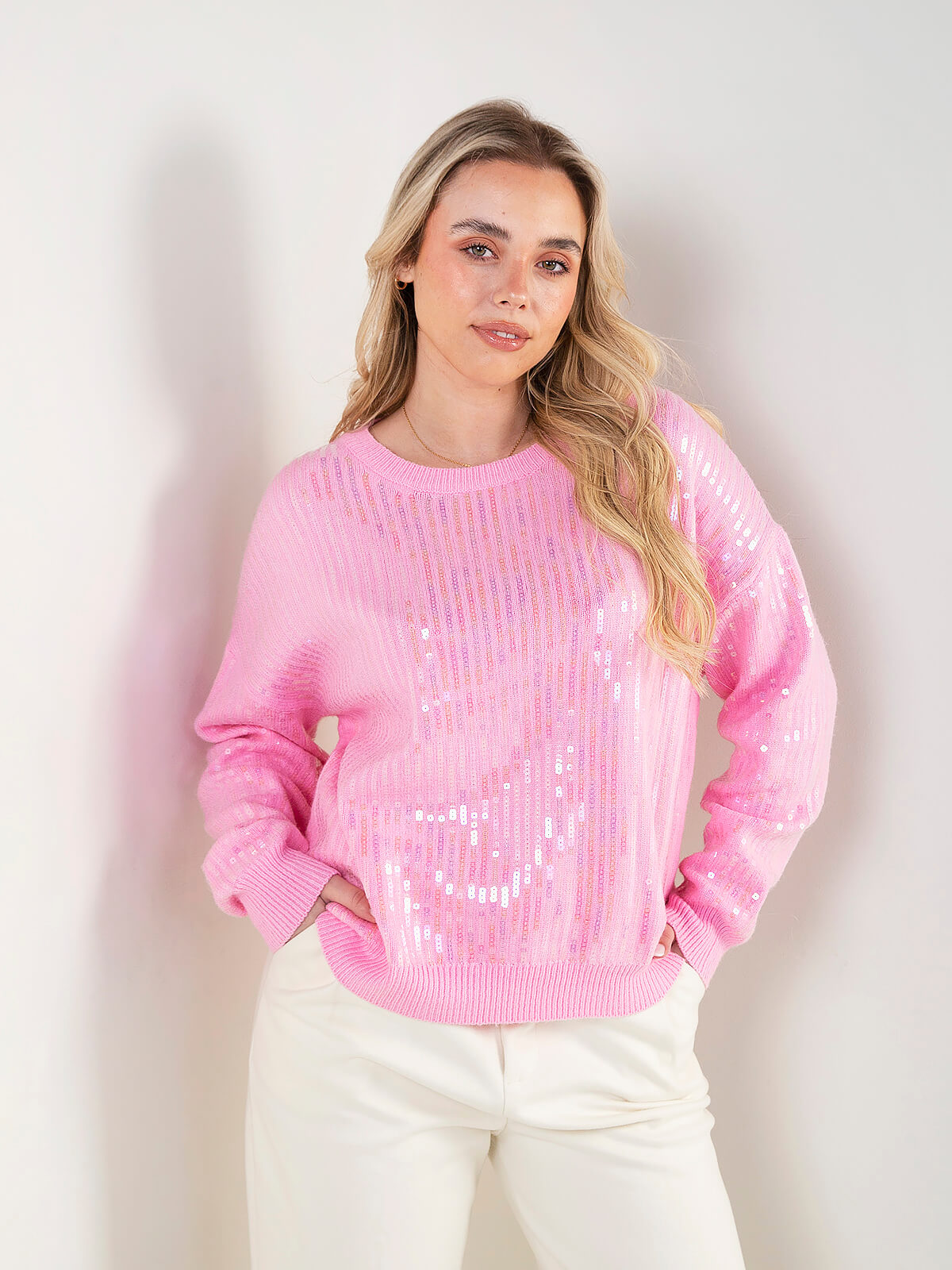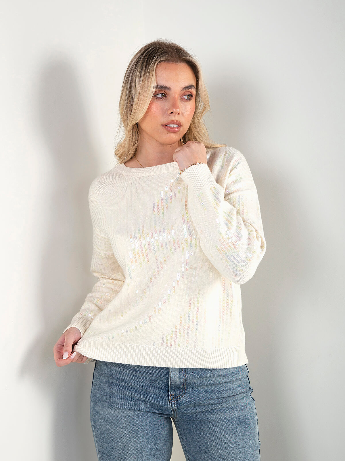 Camisola de malha com aplicação de lantejoulas, ideal para dar brilho aos looks de inverno. Decote redondo. Um modelo confortável, com um toque sofisticado, perfeito para usar tanto de dia como à noite.