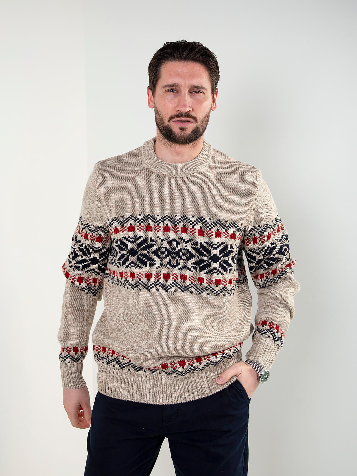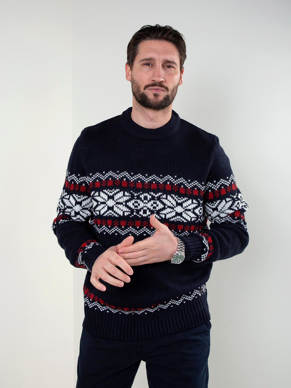 Camisola de homem em malha com padrão jacquard contrastante. Modelo de manga comprida, gola redonda e acabamentos canelados no decote, punhos e base. Ideal para looks de inverno, combina facilmente com calças de ganga ou chino para um visual casual e confortável.
