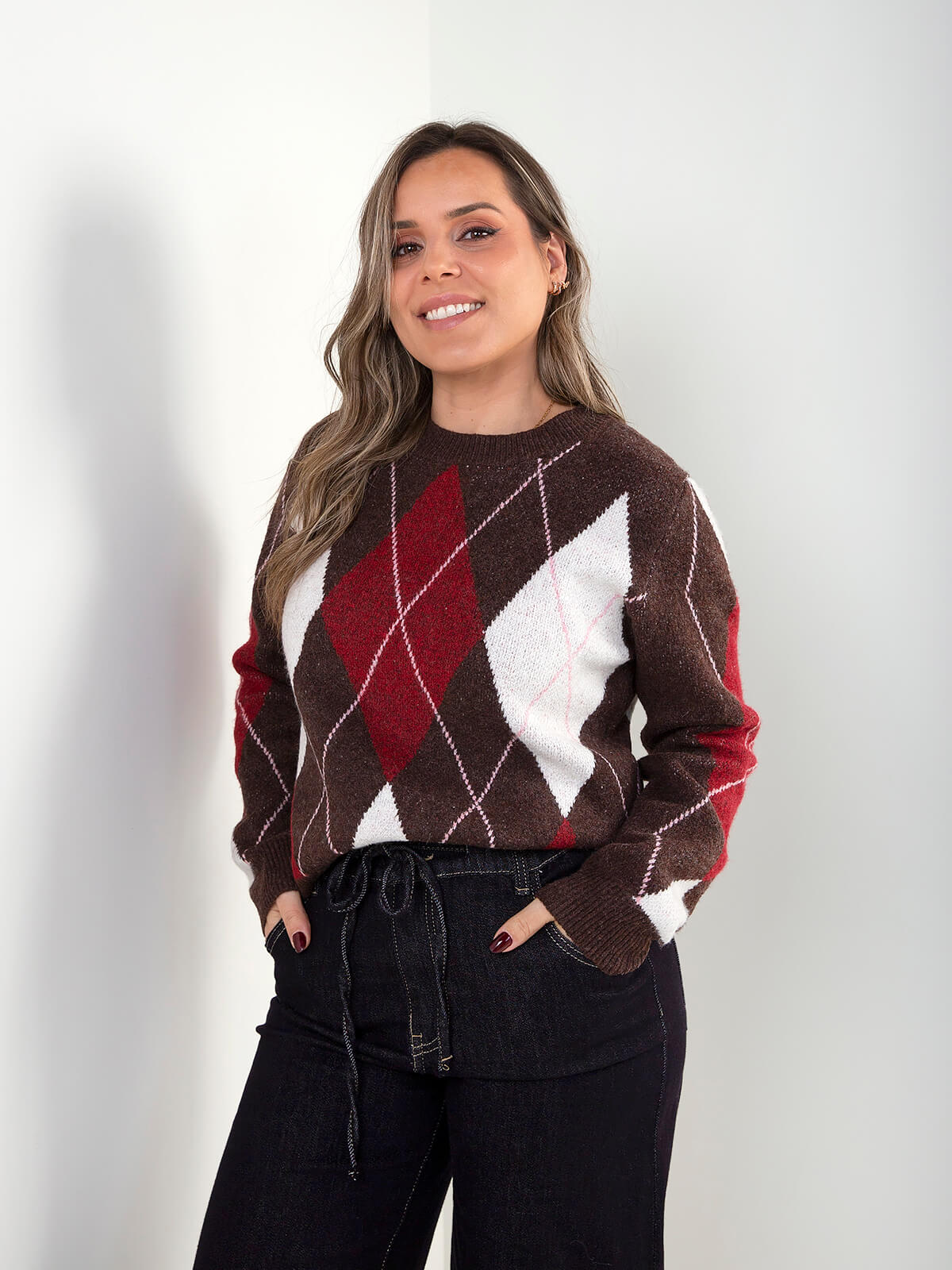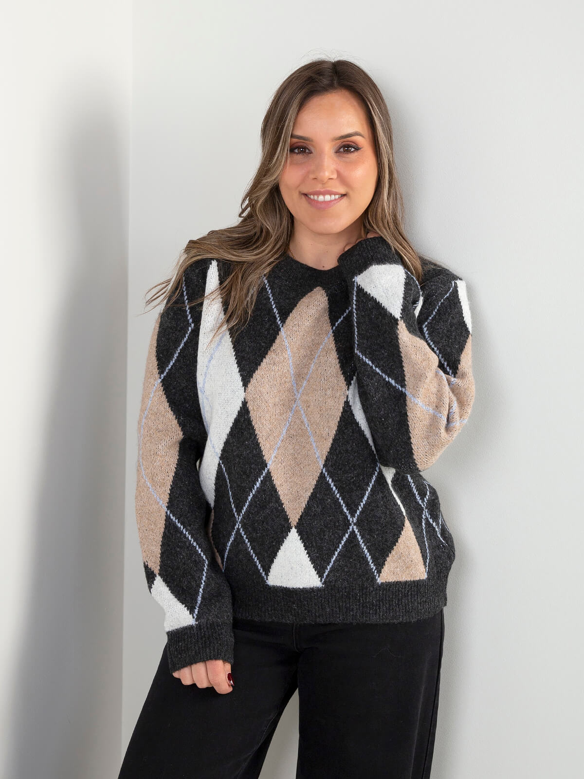 Camisola de senhora em malha com padrão de losangos em contraste. Modelo de manga comprida, com gola redonda e acabamentos canelados. Uma peça de estilo clássico, fácil de conjugar em looks casuais ou mais cuidados.