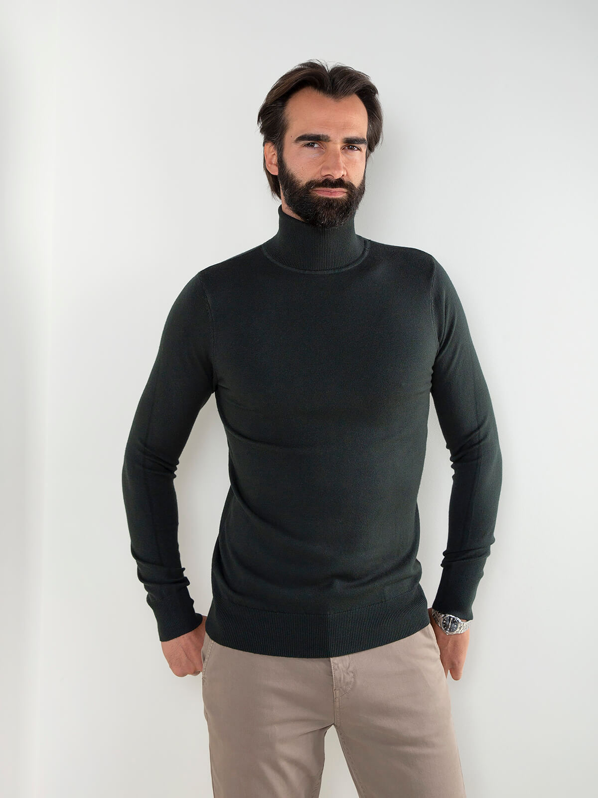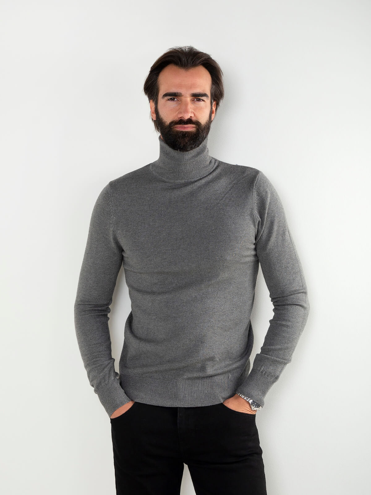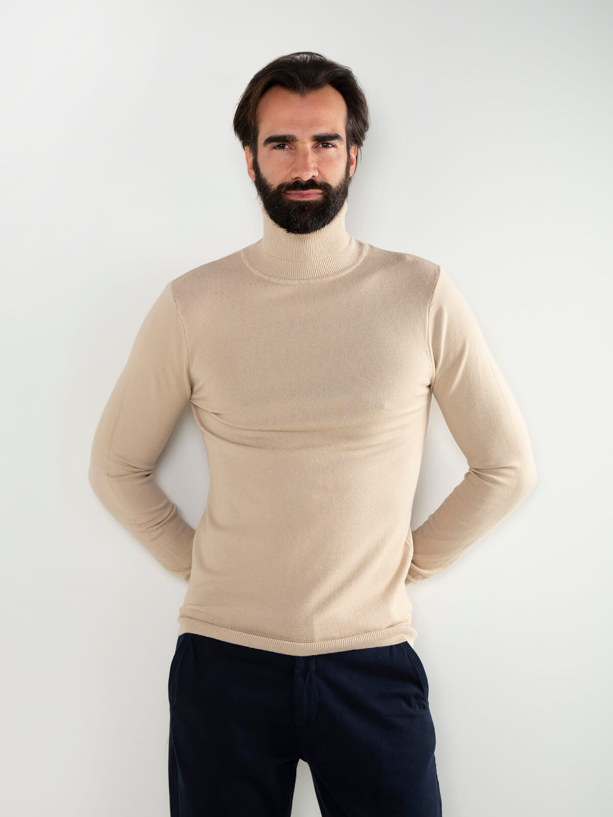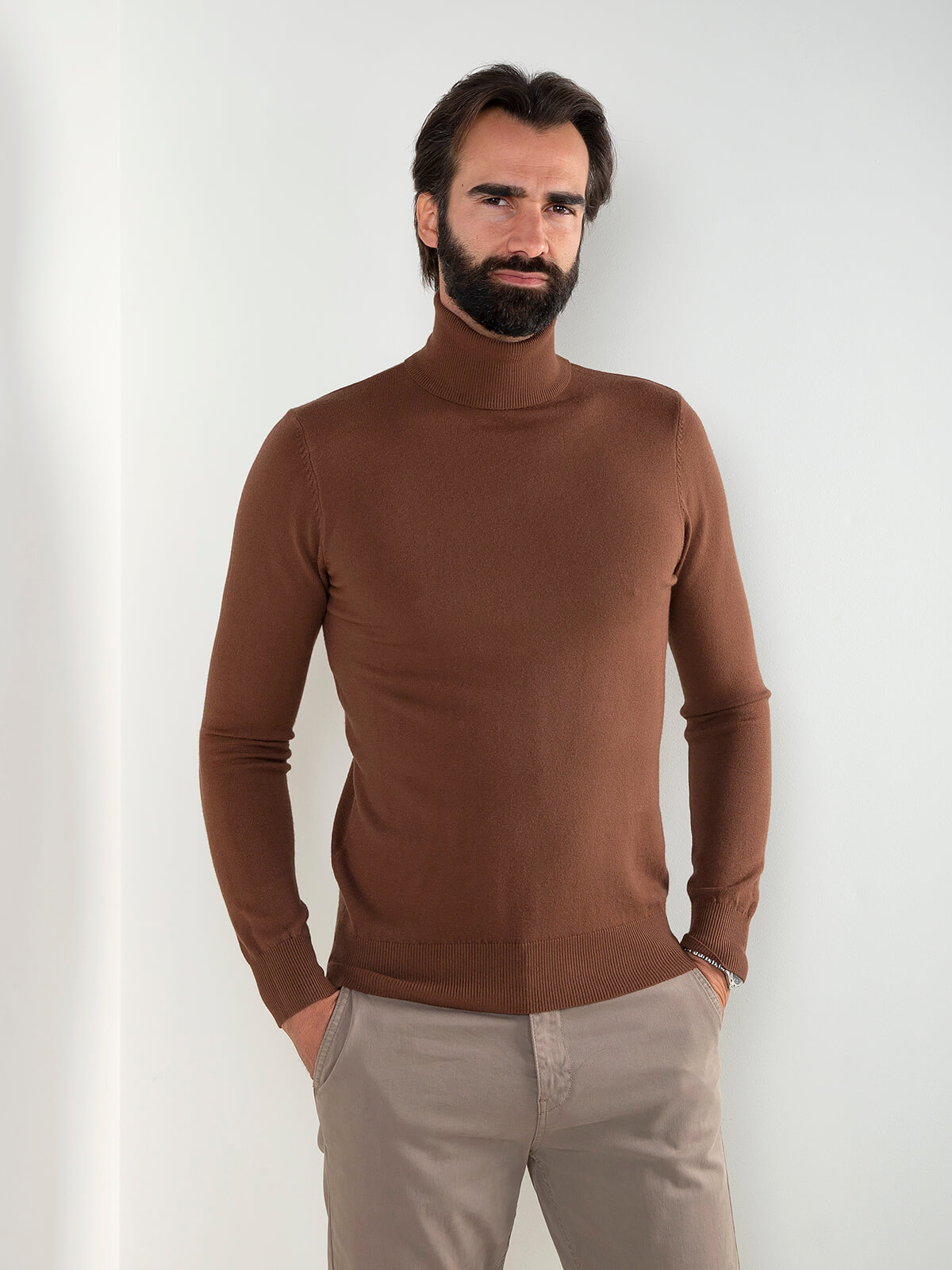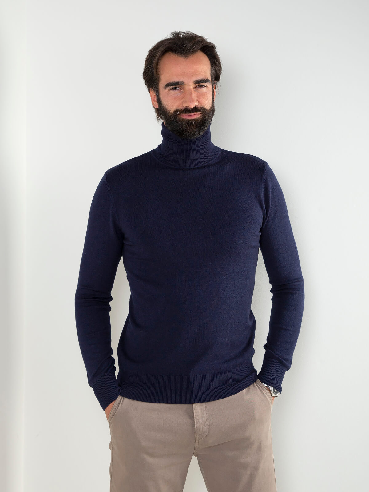 Camisola de malha fina para homem com gola alta. Modelo confortável e versátil, ideal para usar com calças de alfaiataria ou jeans escuros para um visual moderno e elegante.