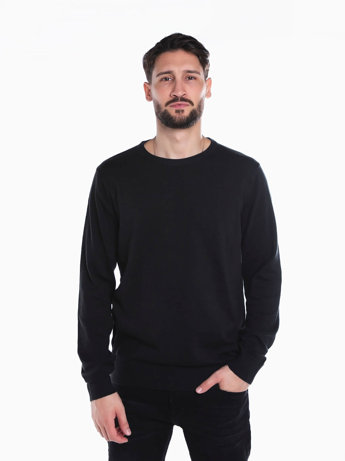 Camisola de malha fina para homem. Camisola de manga comprida em tecido de algodão com gola redonda. Acabamentos canelados.