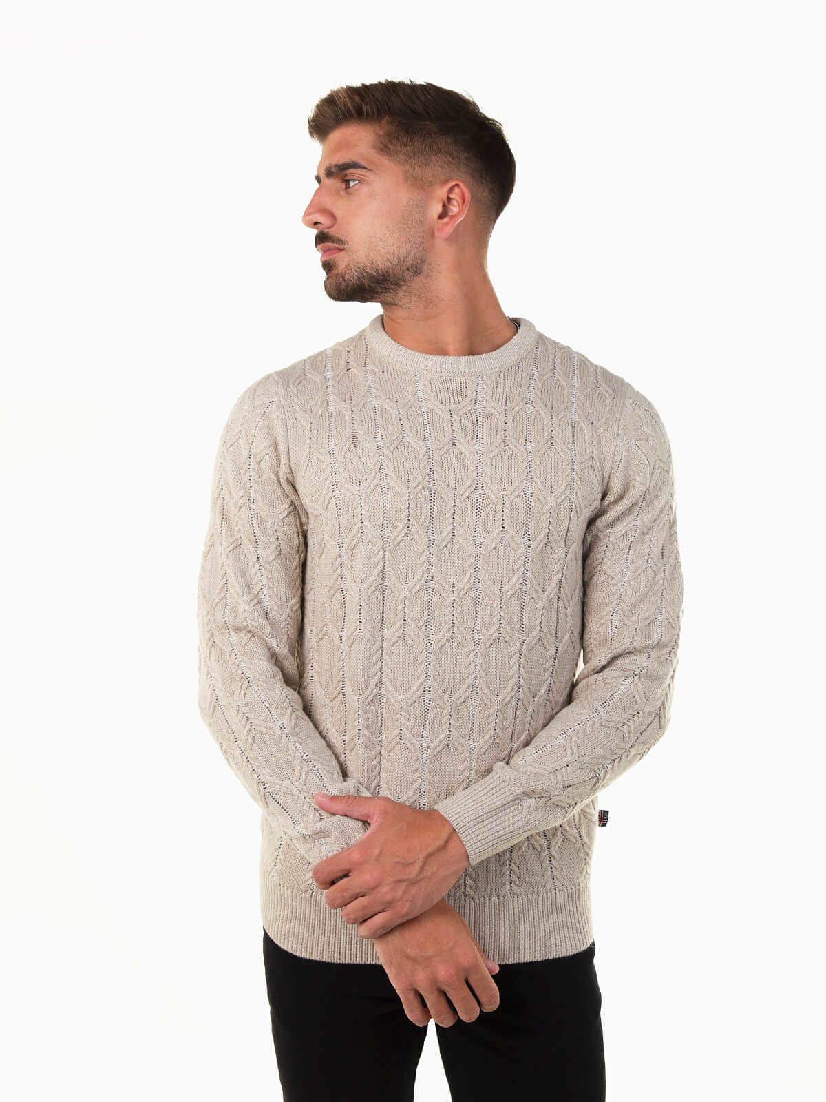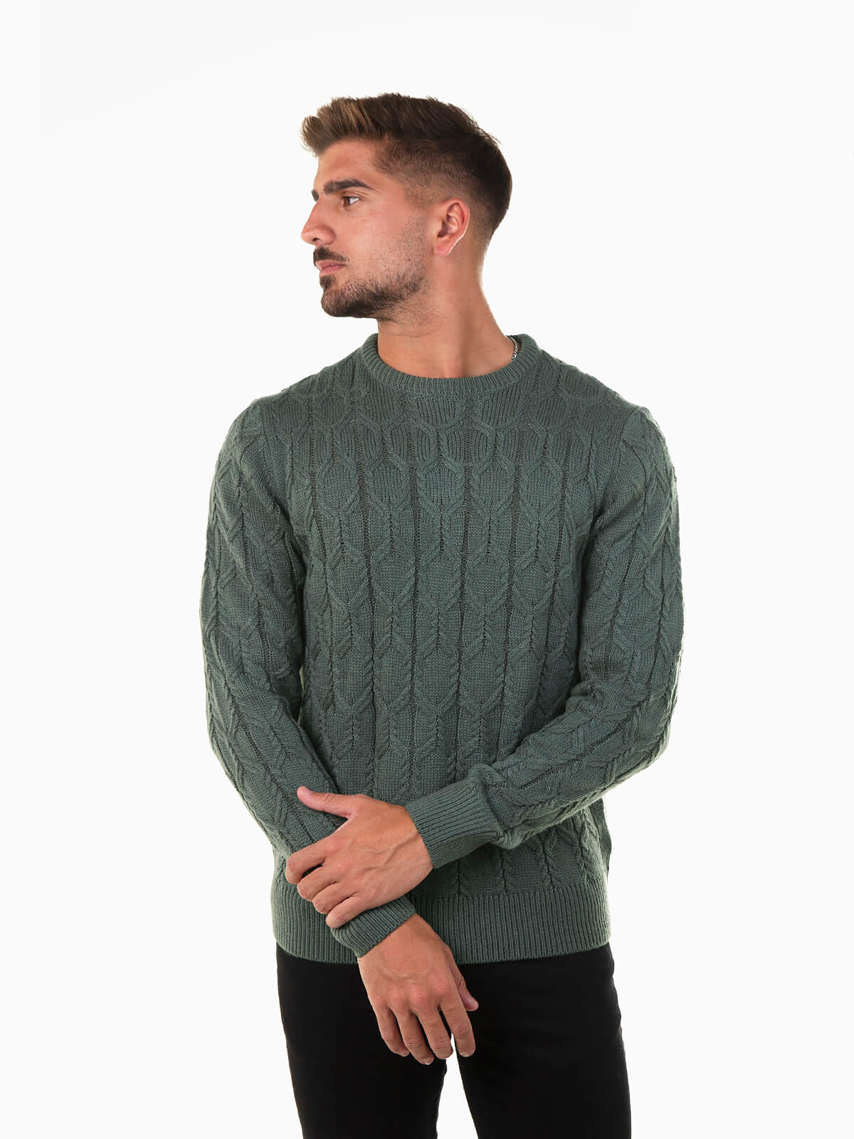 Camisola de malha trançada masculina, com gola redonda e acabamentos canelados. Uma peça intemporal que combina conforto e estilo, perfeita para looks de dia a dia ou coordenados mais clássicos. Disponível em várias cores.