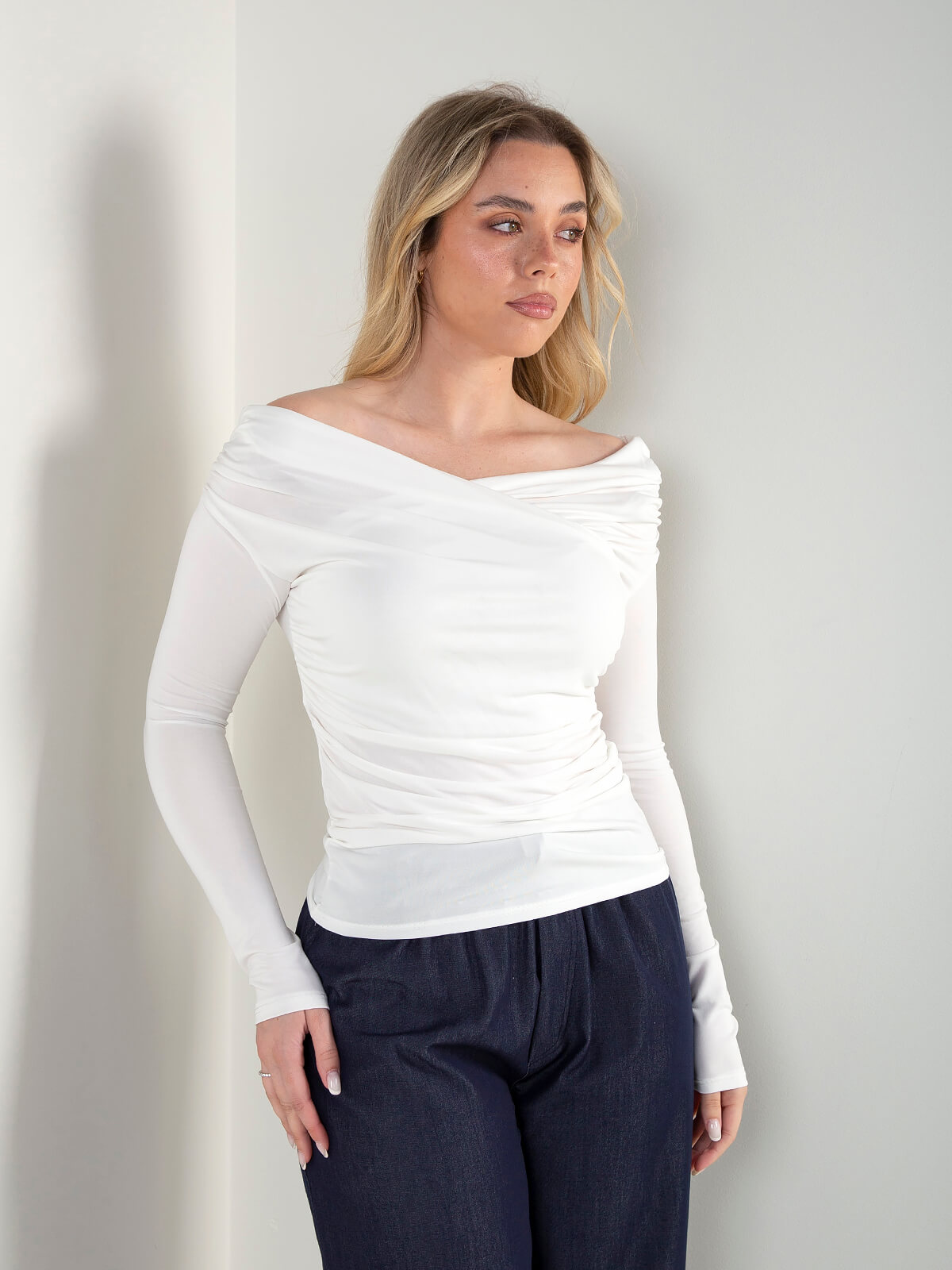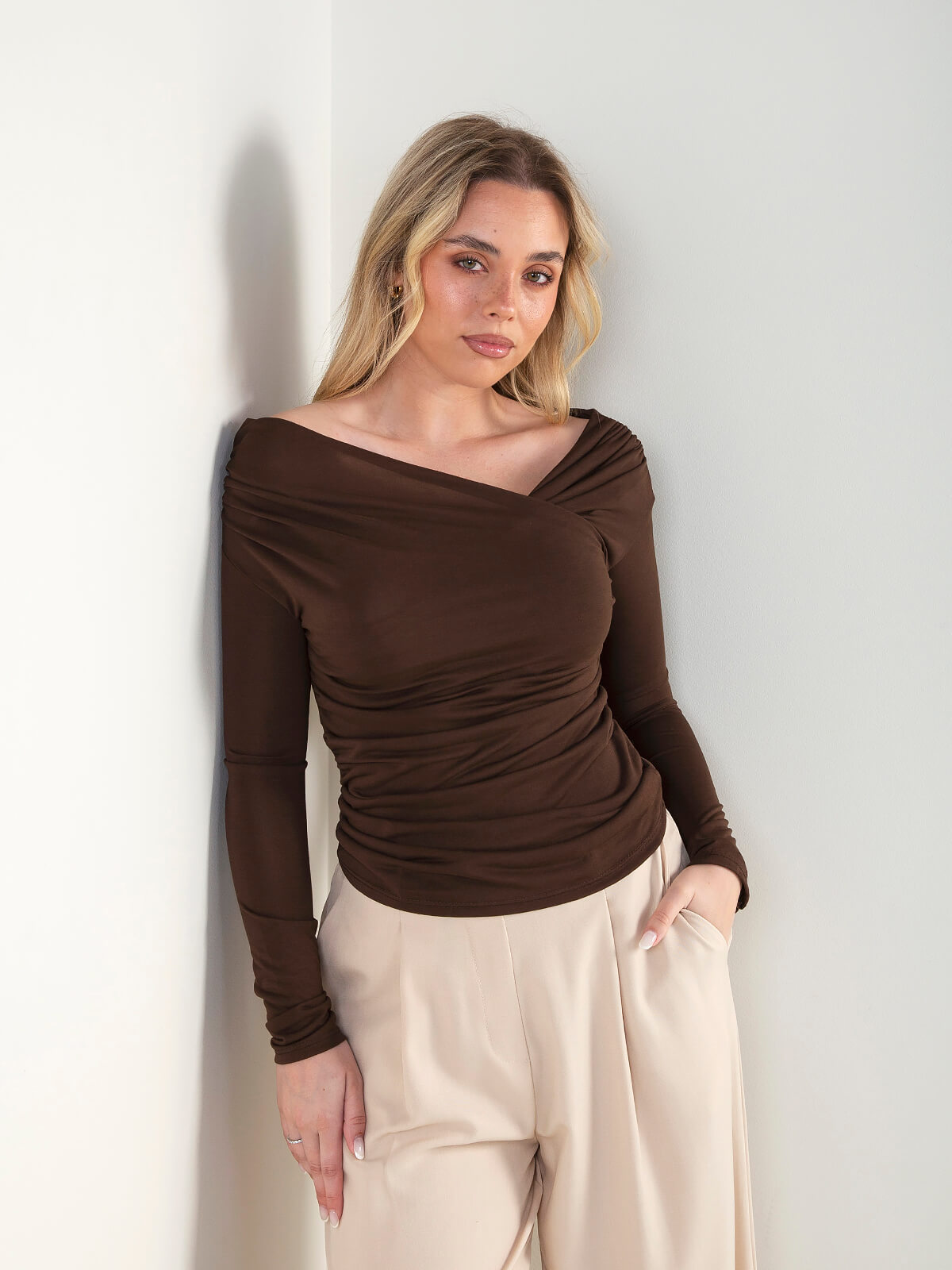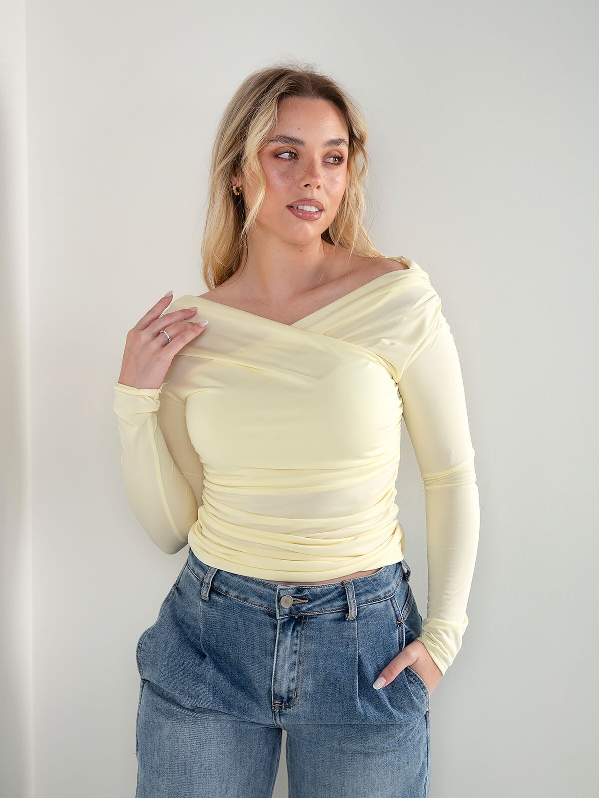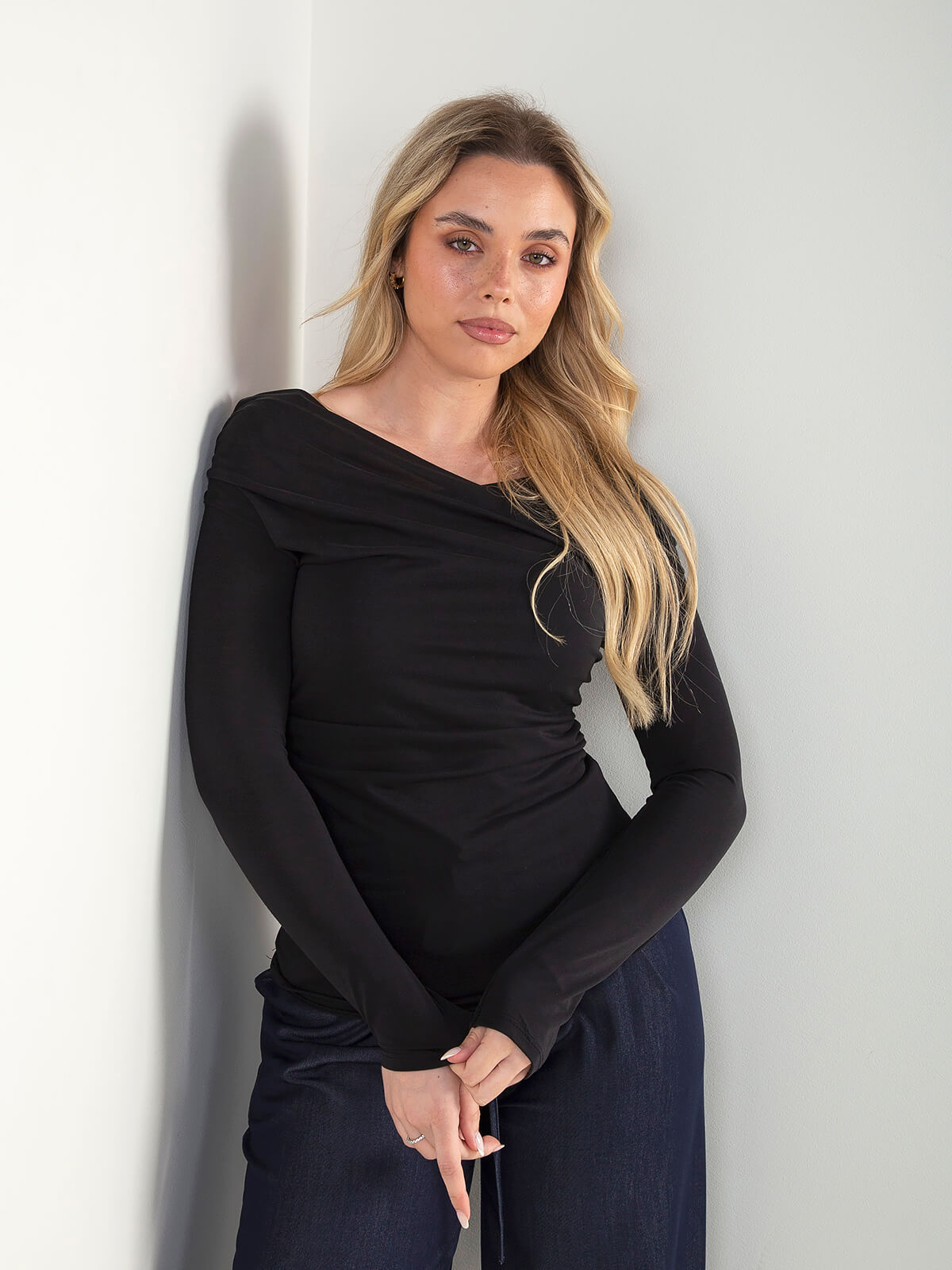 Camisola de manga comprida com decote assimétrico e efeito drapeado que cria um look elegante e atual. Com corte ajustado e tecido confortável com elasticidade, adapta-se facilmente ao corpo e funciona tanto em looks mais sofisticados como no dia a dia.