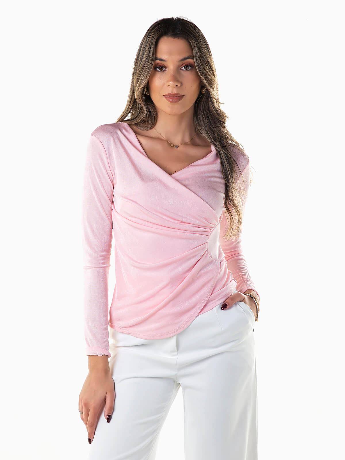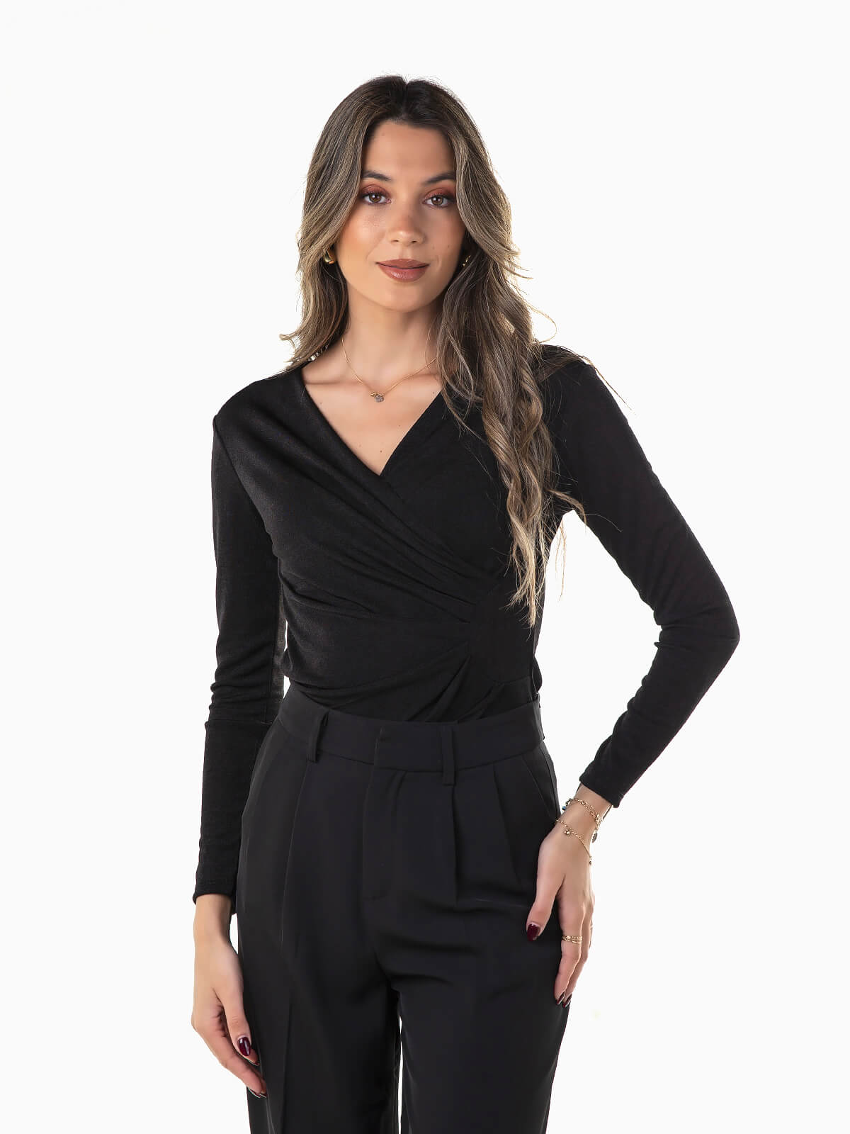 Camisola em tecido elástico com decote cruzado e efeito drapeado. Camisola justa de manga comprida.