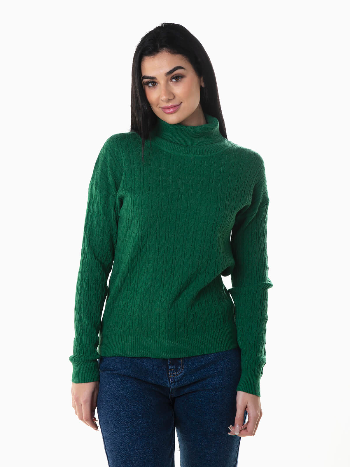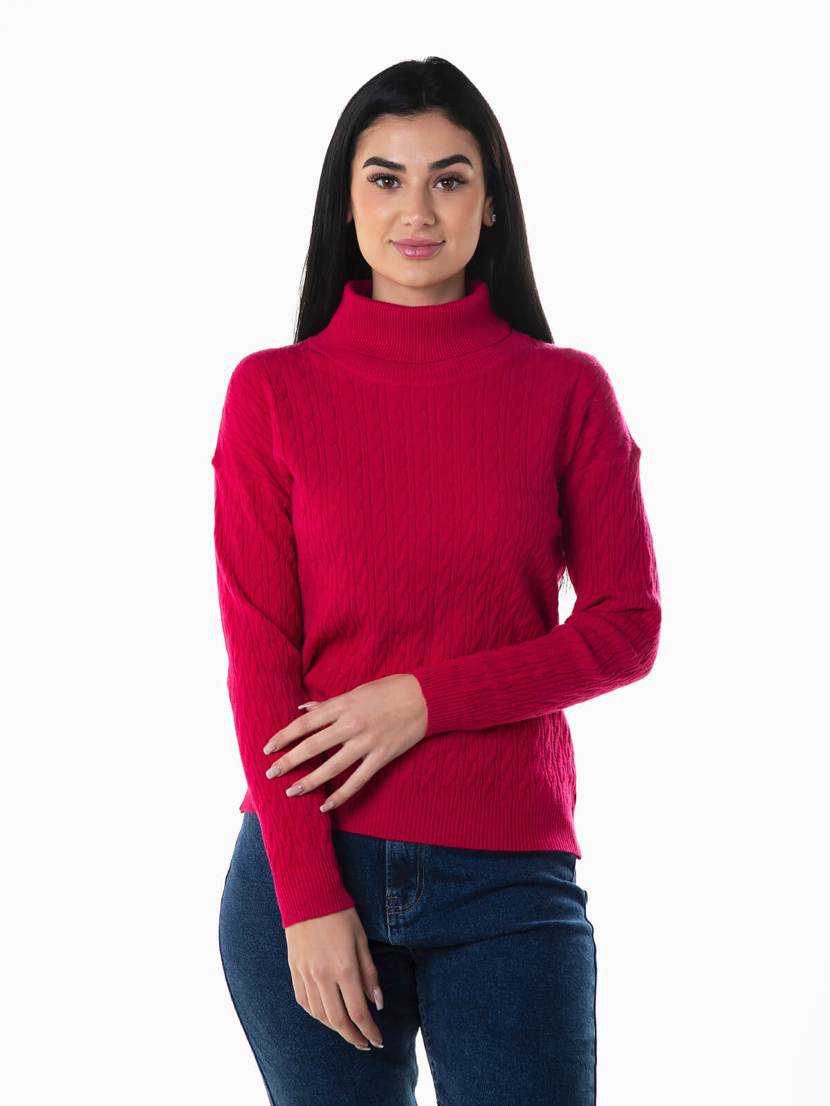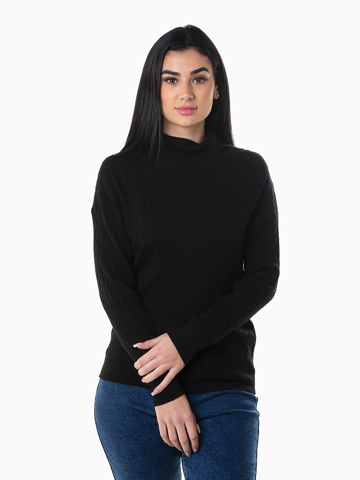 Camisola gola alta dobrada em malha de cabo para senhora. Camisola manga comprida com acabamentos canelados.