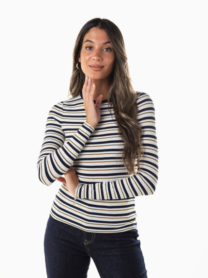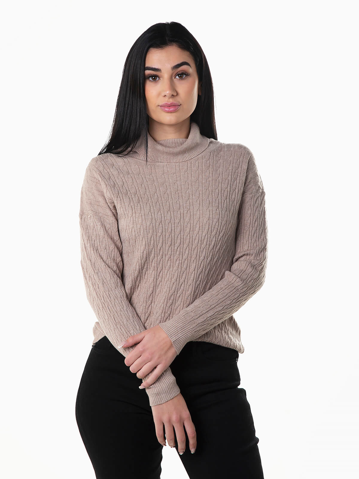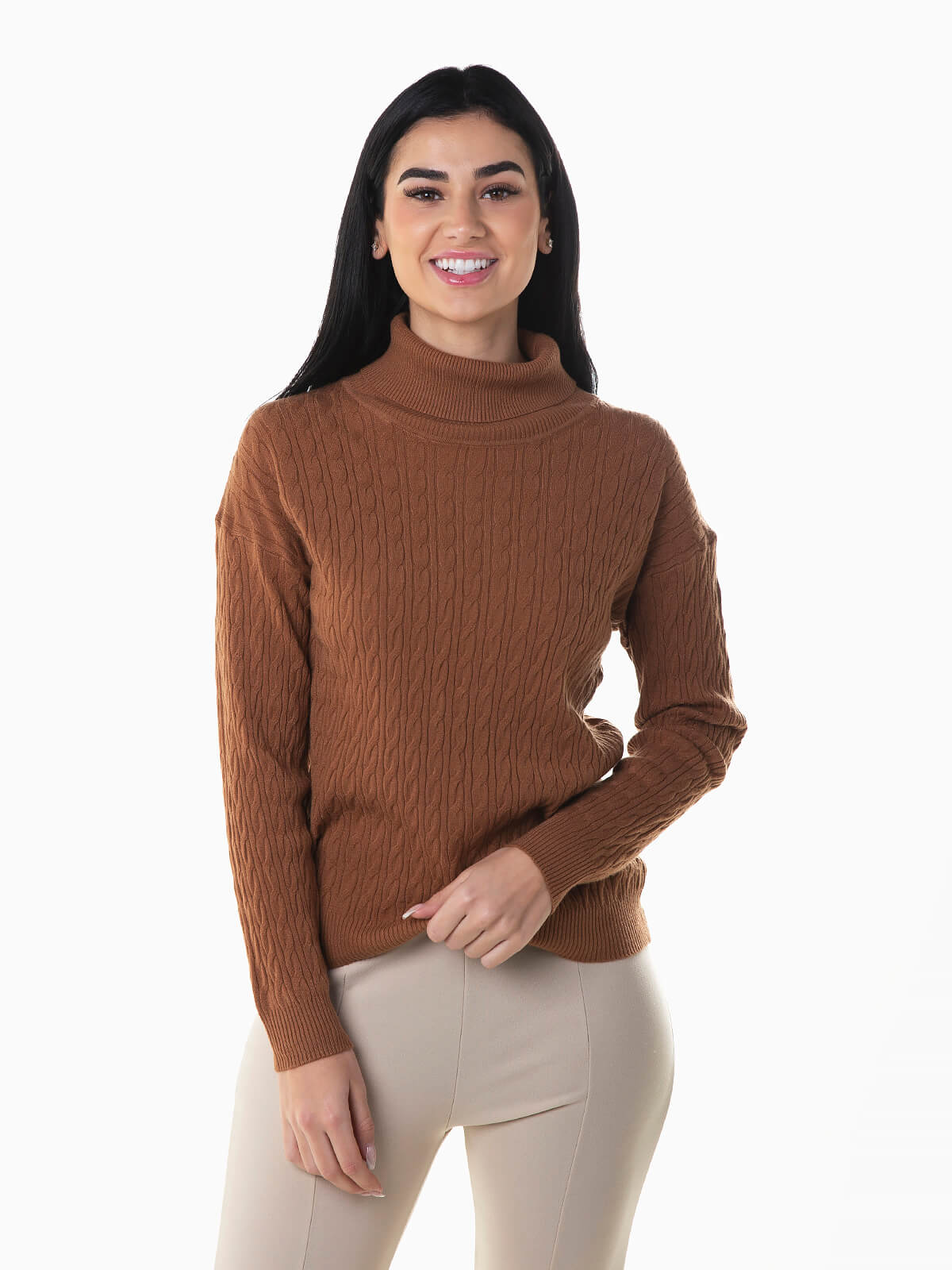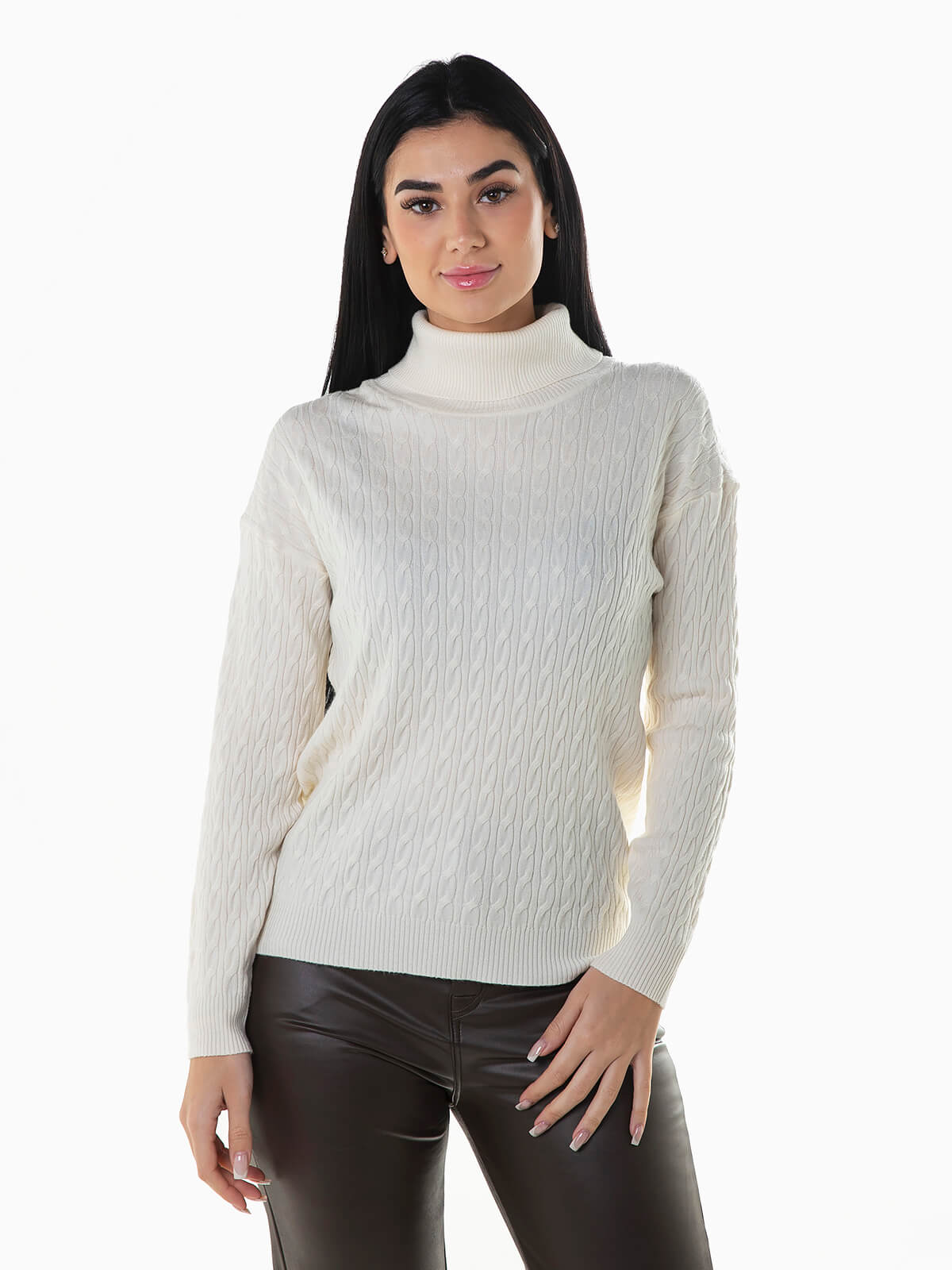 Camisola gola alta dobrada em malha de cabo para senhora. Camisola manga comprida com acabamentos canelados.