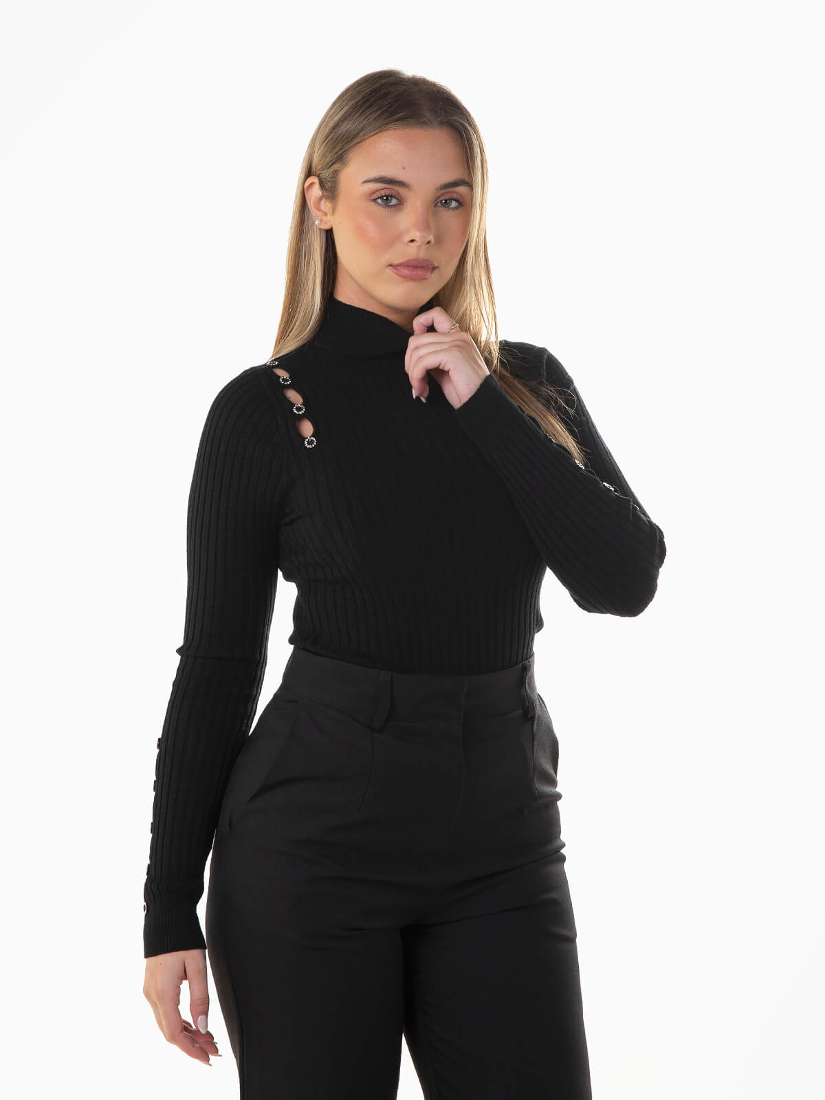 Camisola gola alta em malha canelada com pormenores cut out. Camisola justa de manga comprida com botões aplicados e acabamentos estriados.