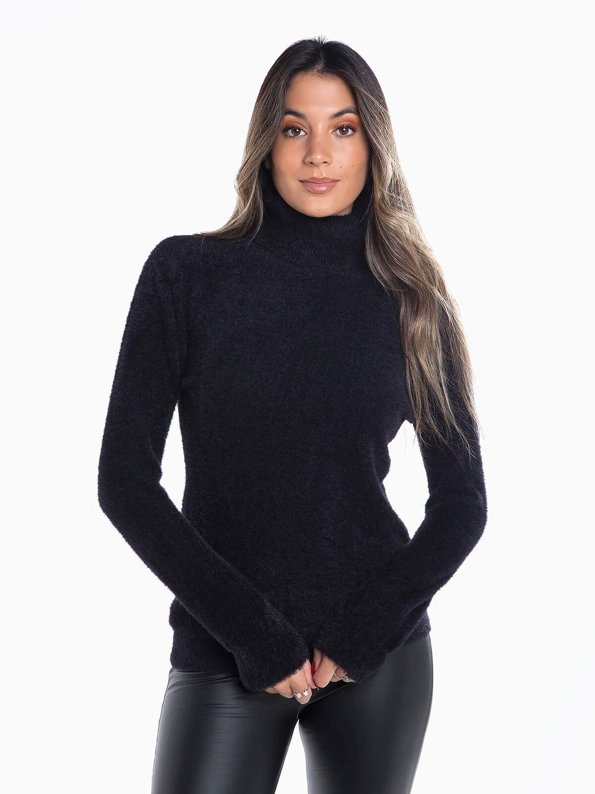 Camisola de gola alta em malha com pelo de toque suave. Camisola manga comprida com acabamentos caneladas.