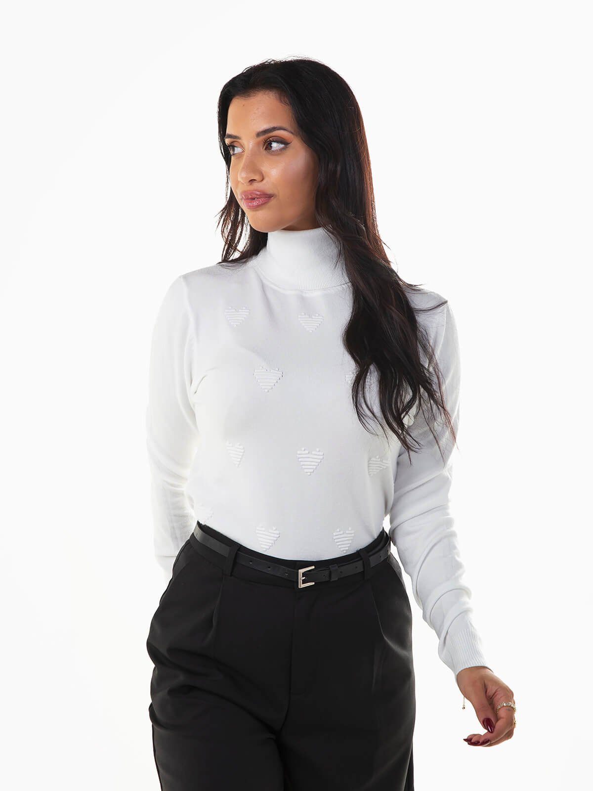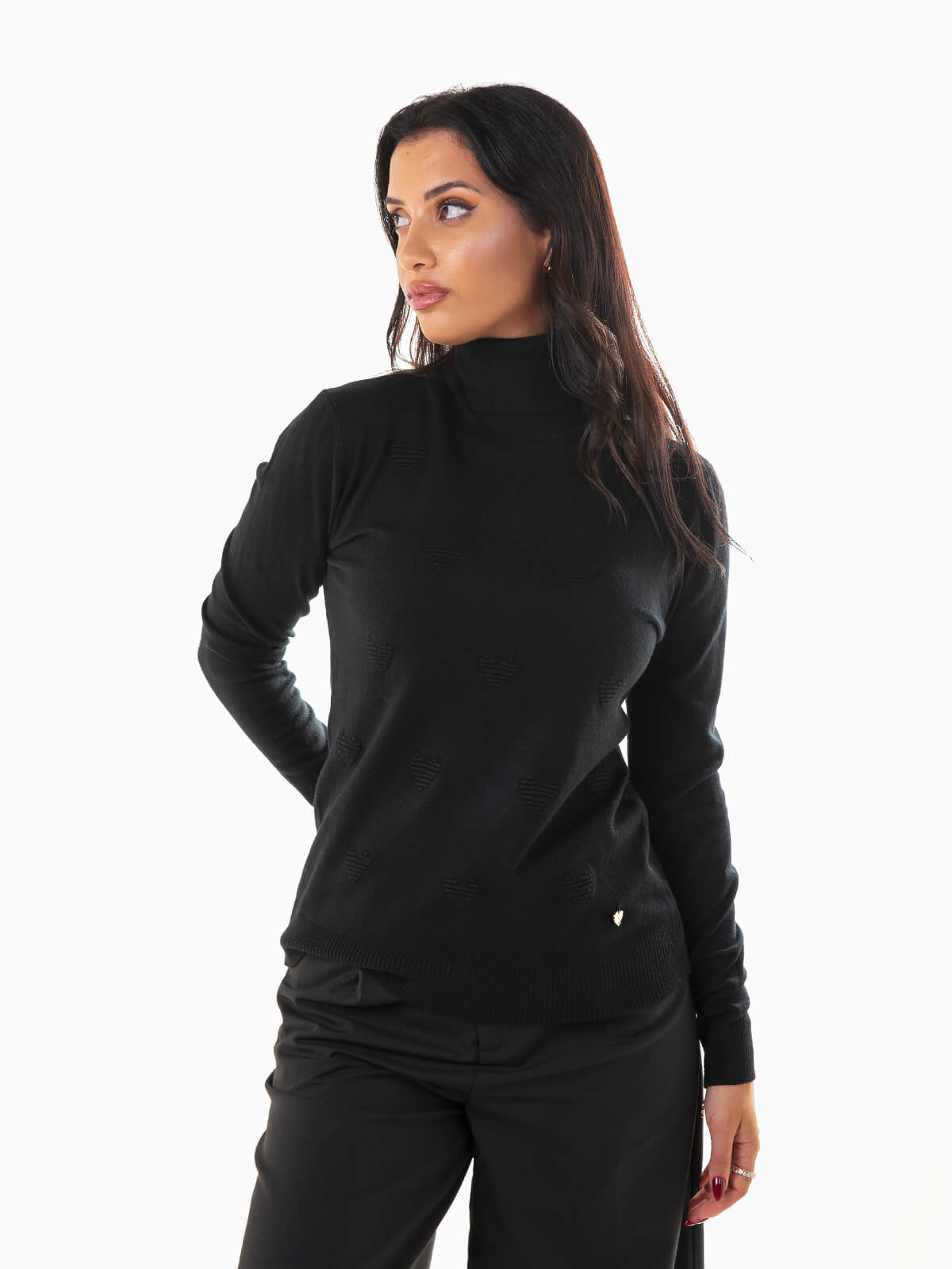 Camisola de gola alta em malha com corações em relevo. Camisola manga comprida com acabamentos canelados.