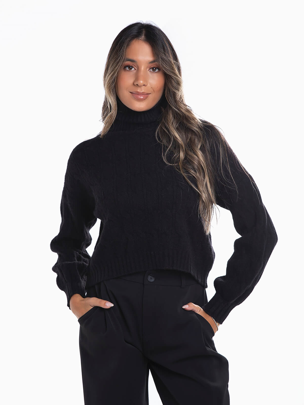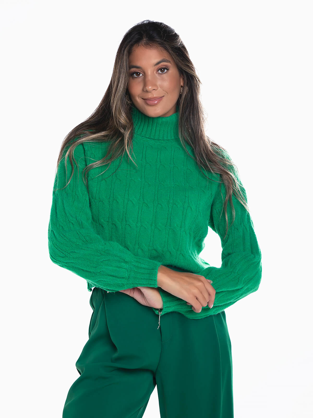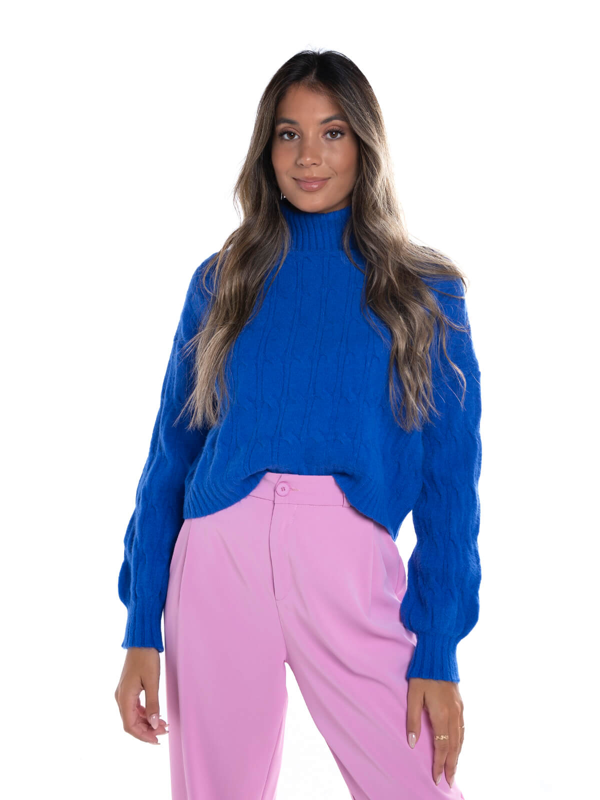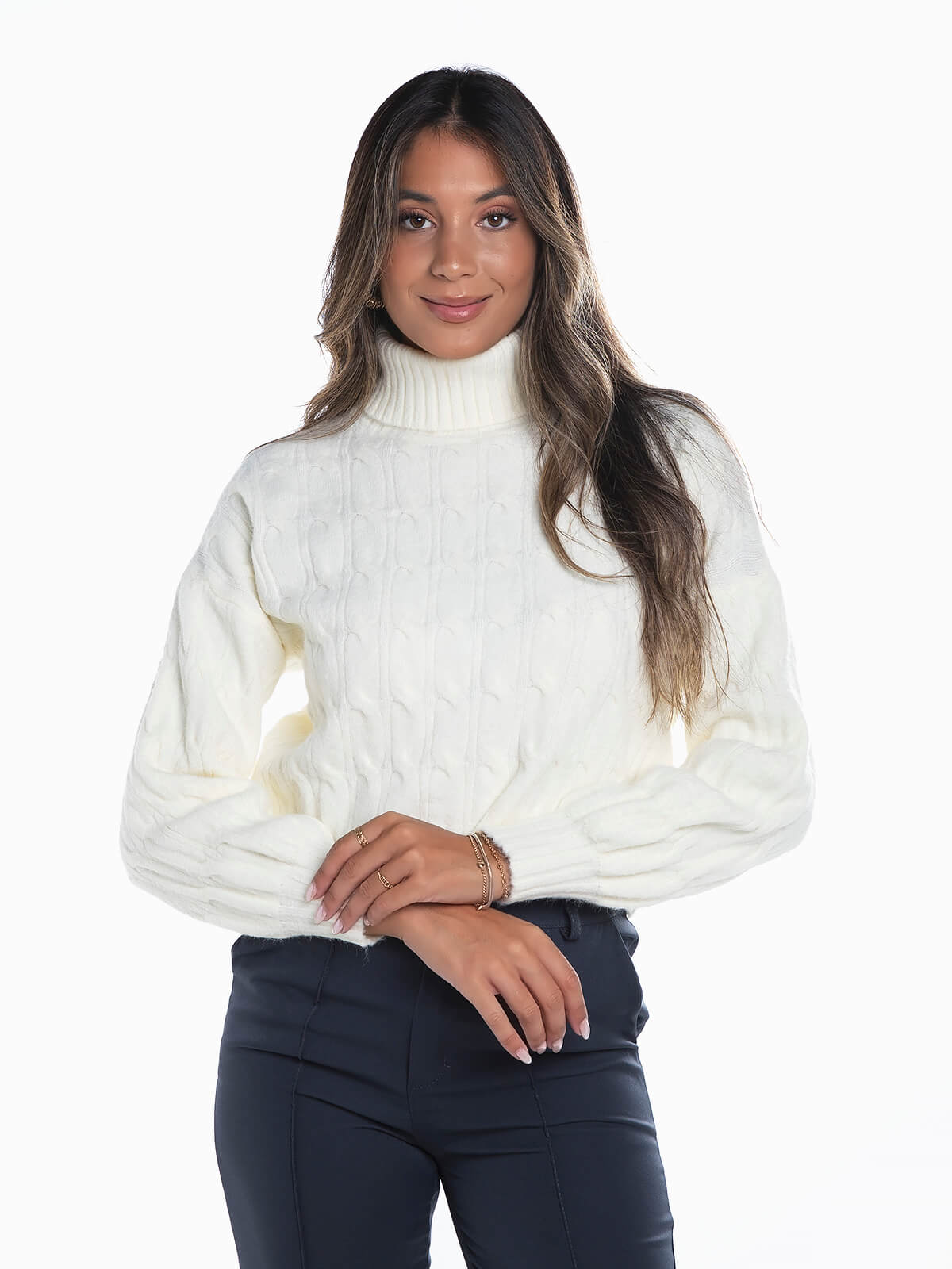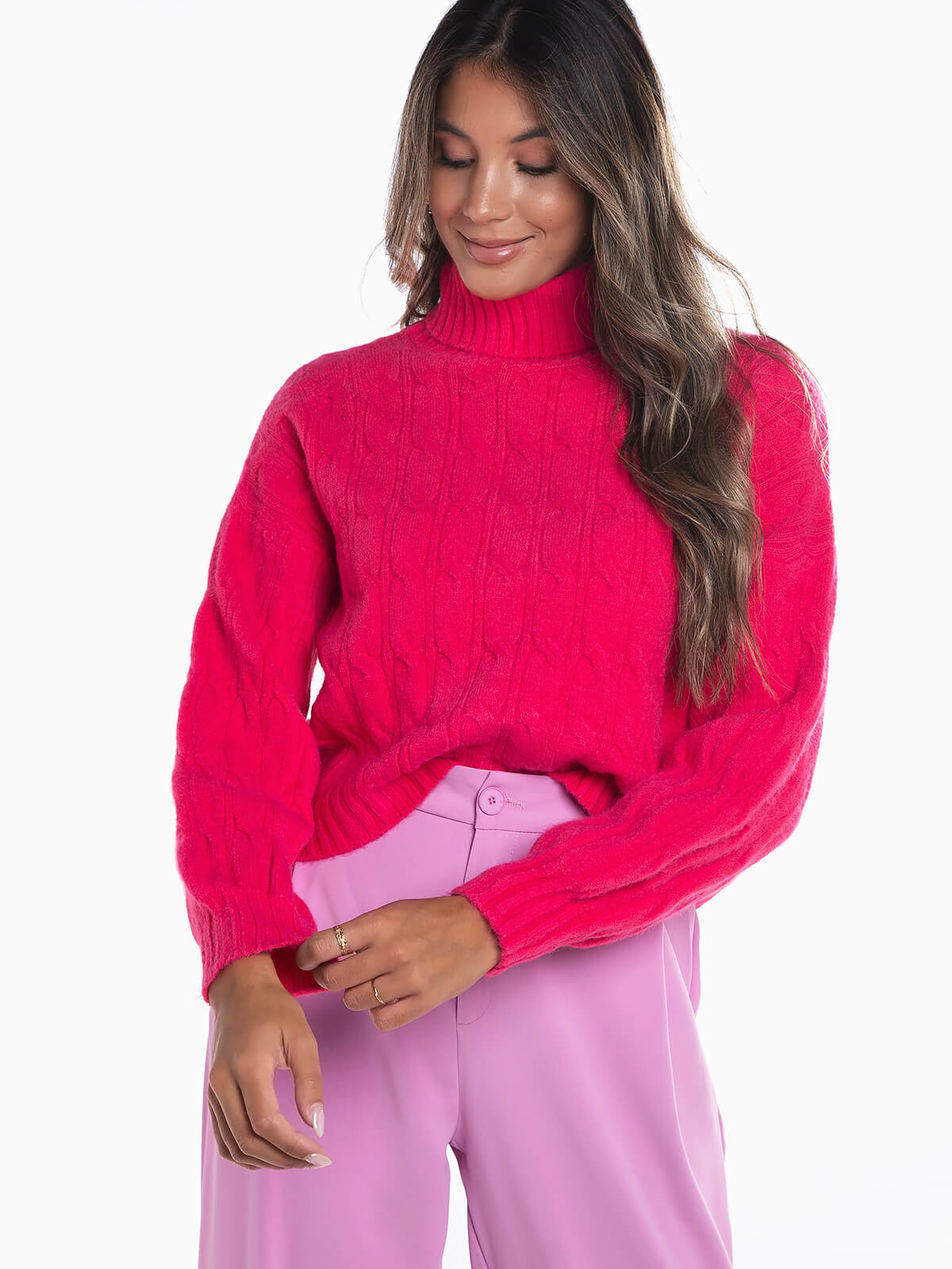 Camisola de gola alta dobrada em malha entrançada para senhora. Camisola oversize manga comprida com acabamentos canelados.