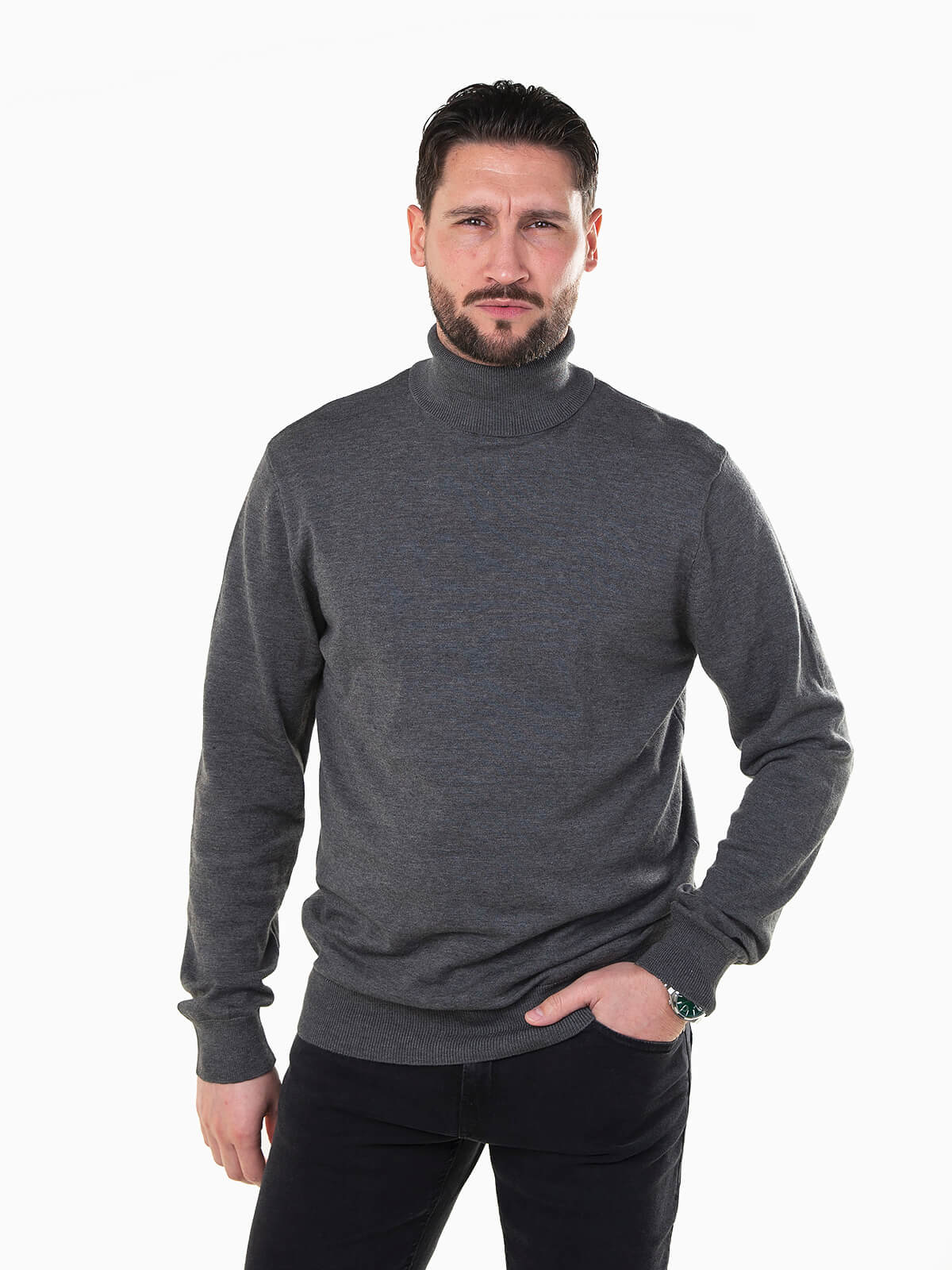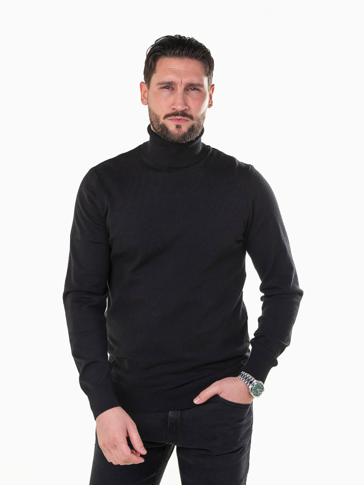 Camisola de malha fina para homem com gola alta de toque suave e corte confortável. Modelo versátil, perfeito para combinar com calças de alfaiataria ou jeans escuros.