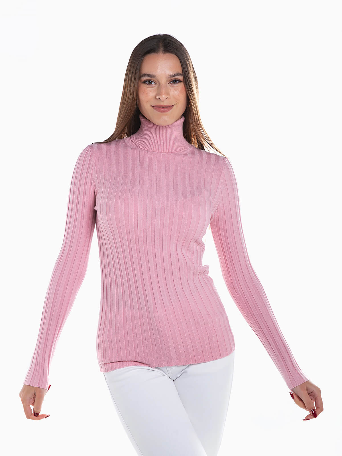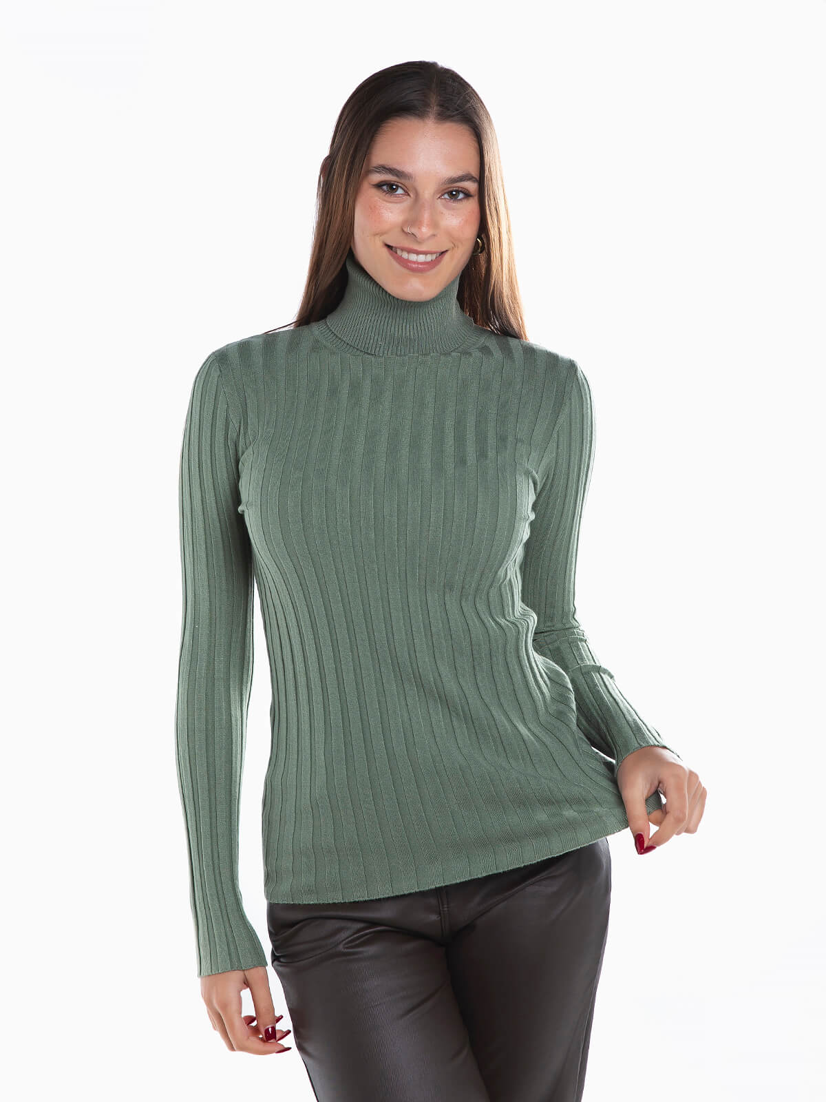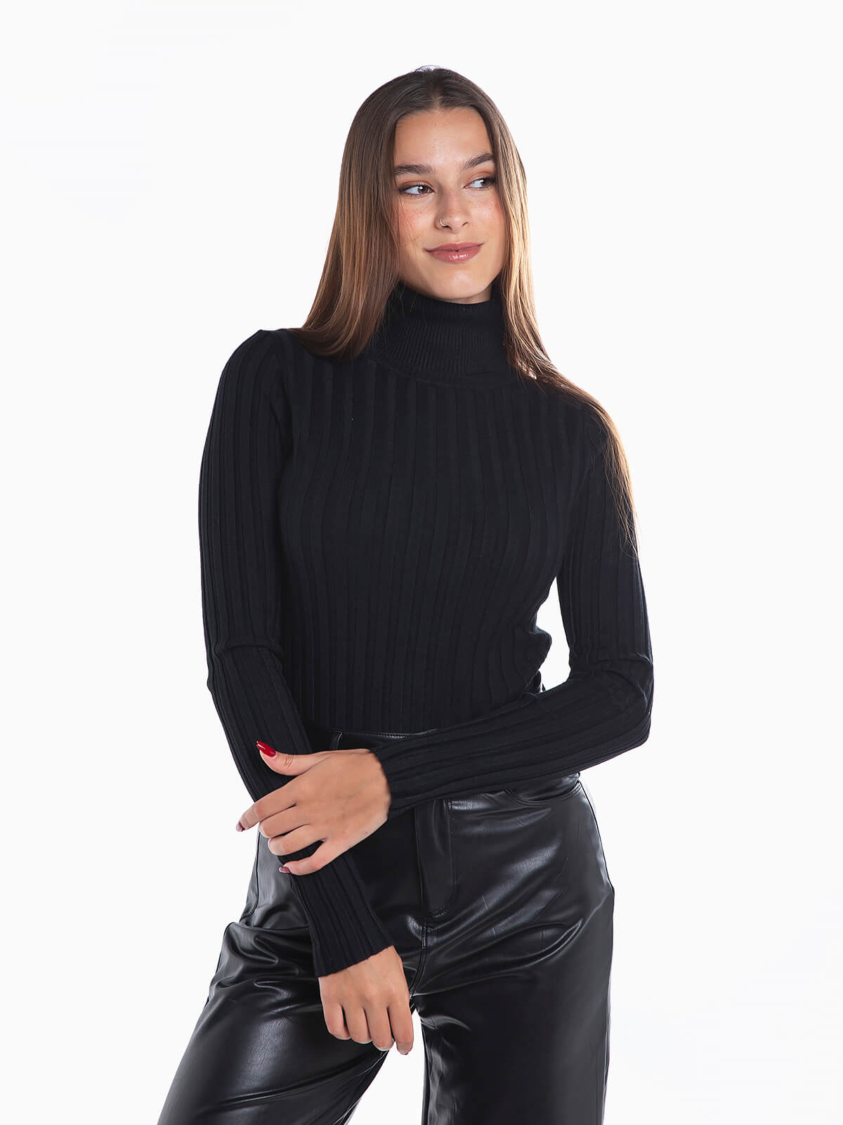Camisola de gola alta dobrada em malha canelada com mistura de lã para maior conforto térmico. Camisola manga comprida.