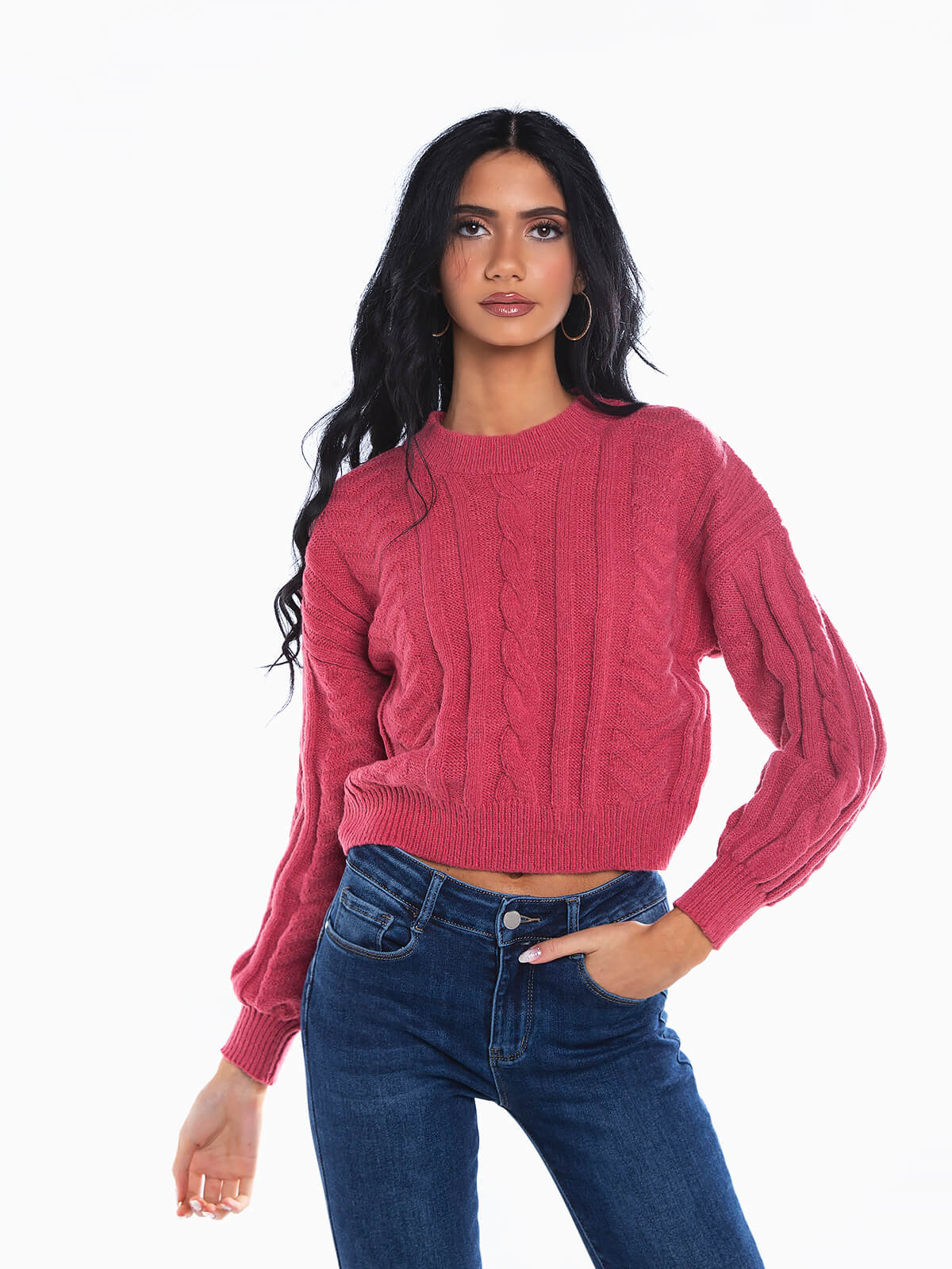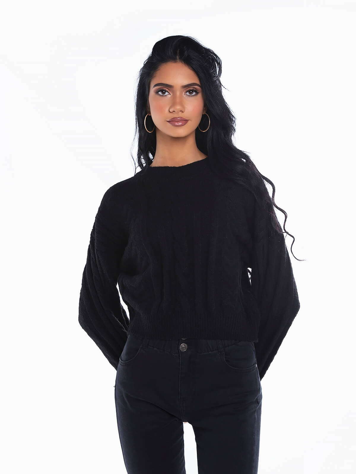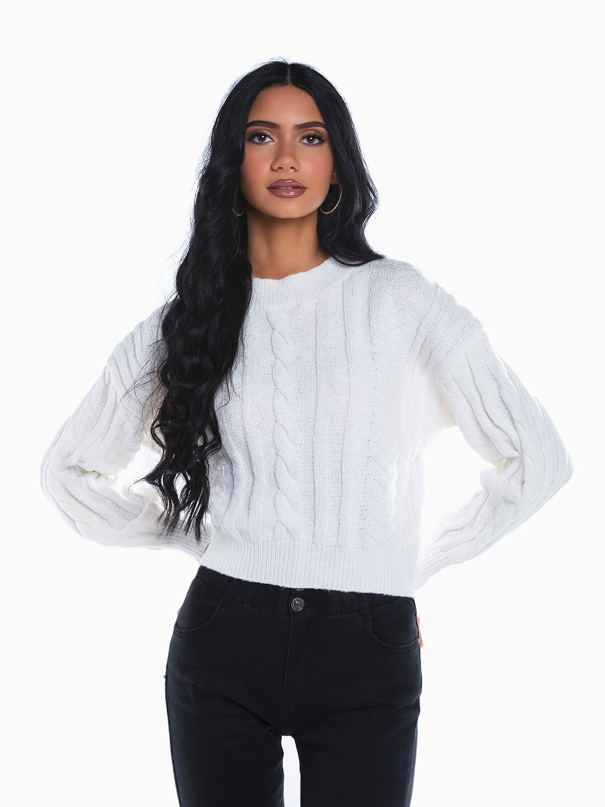 Camisola com gola perkins em malha estruturada para senhora. Camisola manga comprida larga com extremidades caneladas. Ombros descaídos.
