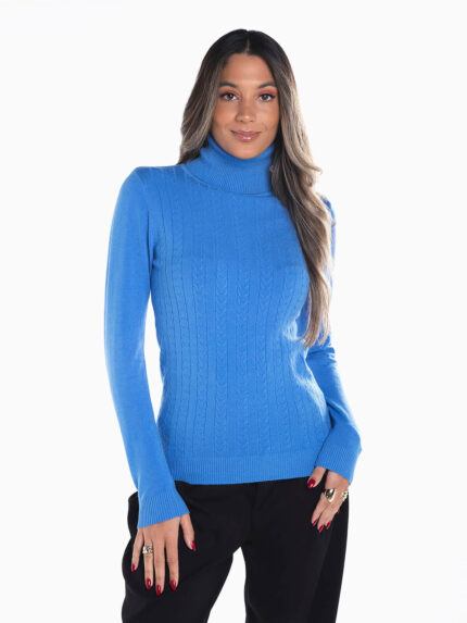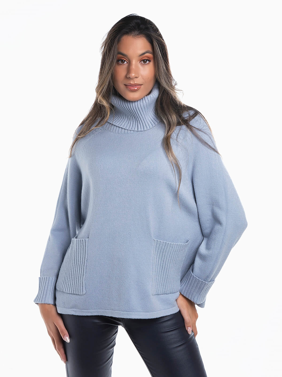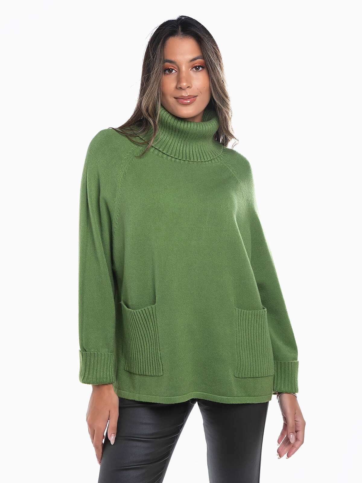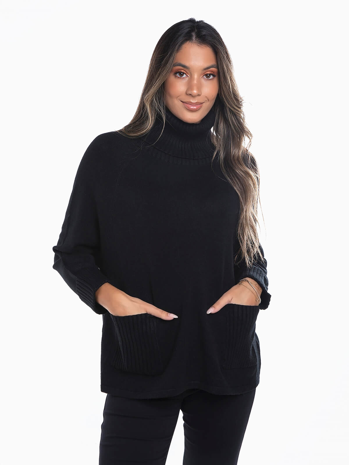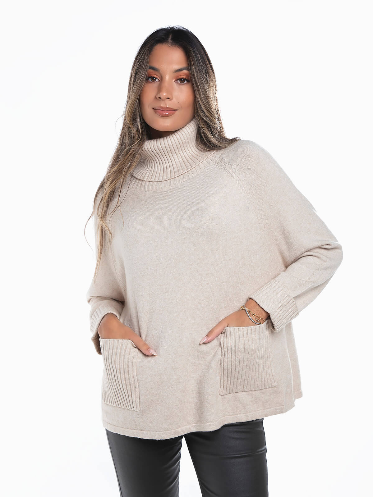 Camisola larga de malha combinada com detalhes canelados. Camisola manga raglan comprida com gola alta dobrada e 2 bolsos à frente.