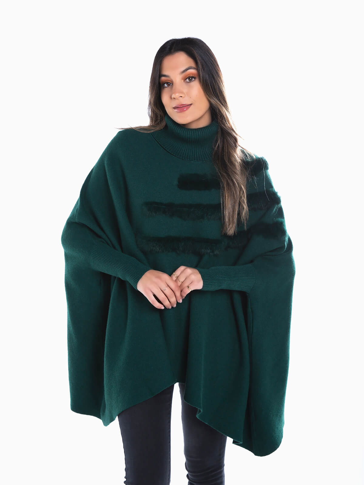 Camisola larga em malha com pelo aplicado. Camisola de manga comprida com gola alta. Punhos canelados.