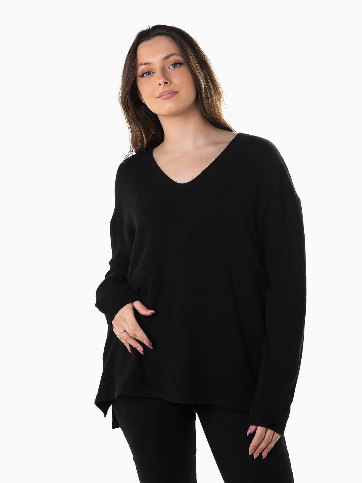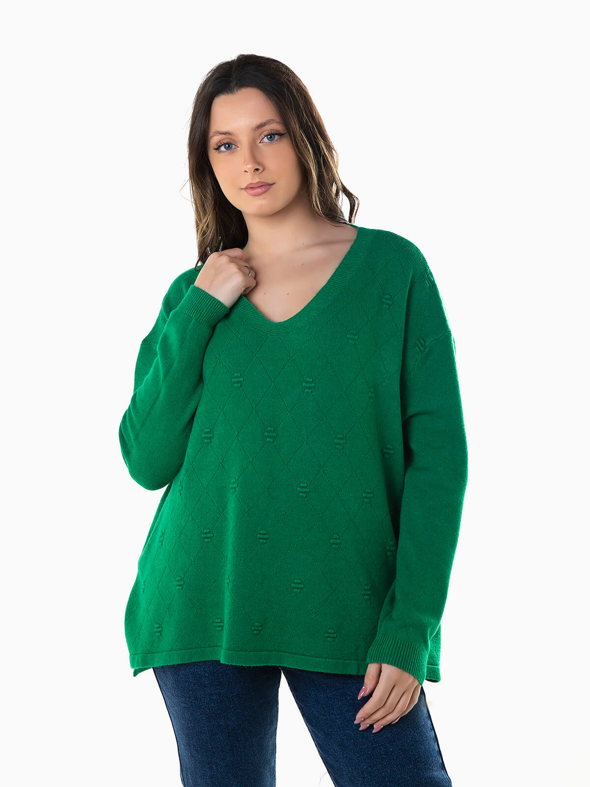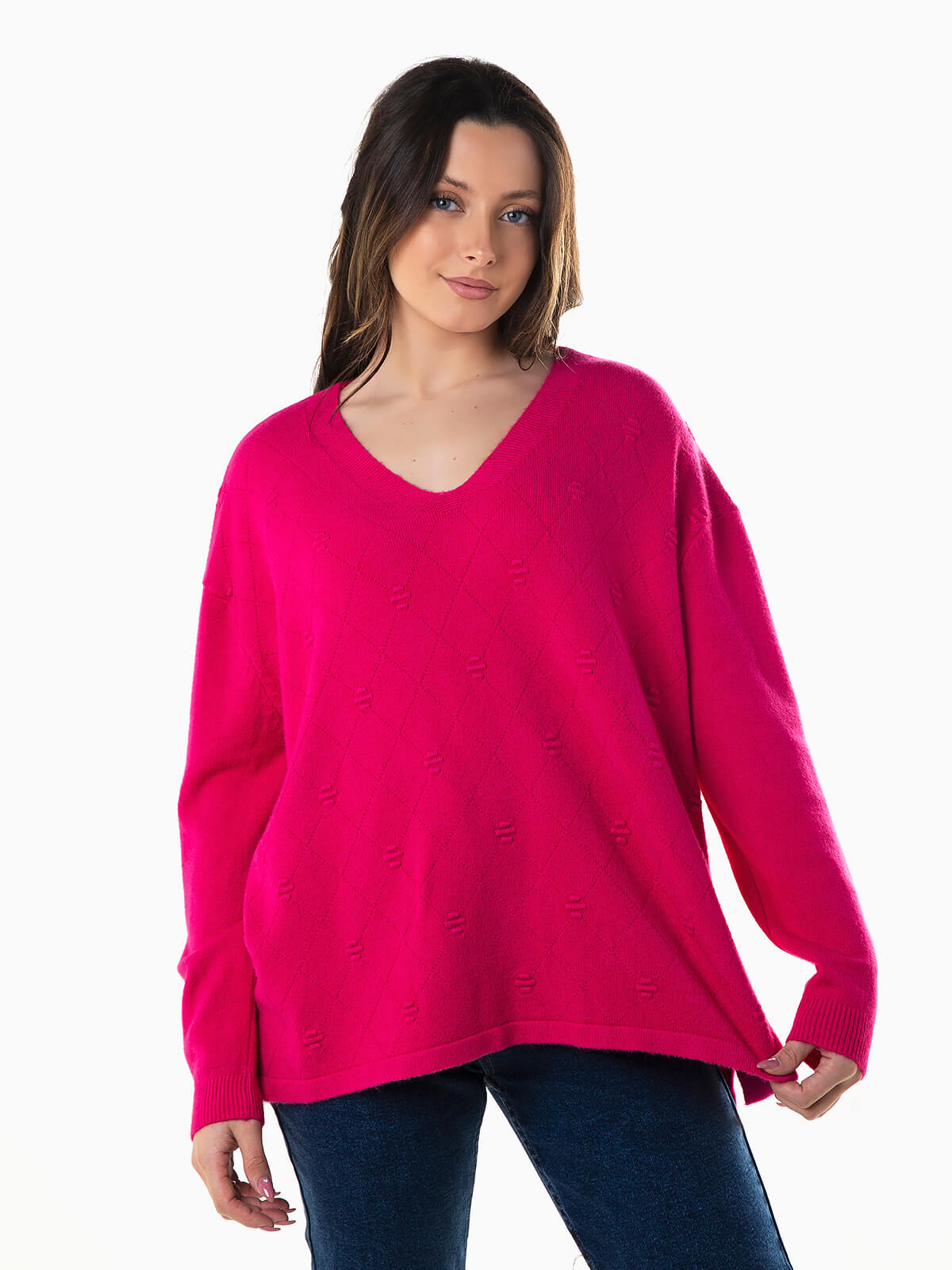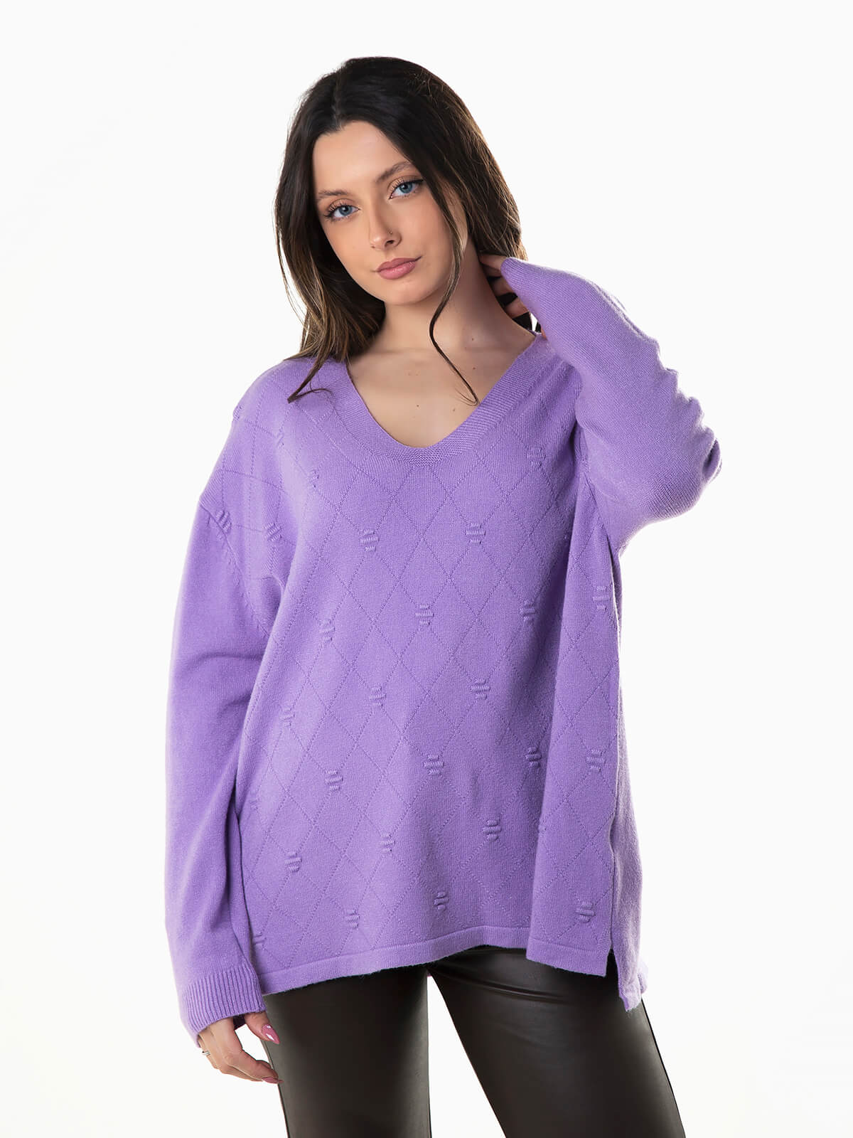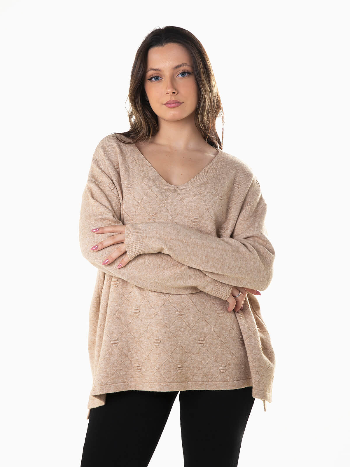 Camisola larga malha trabalhada em losangos. Camisola com relevo e decote em bico. Manga comprida. Acabamentos canelados.
