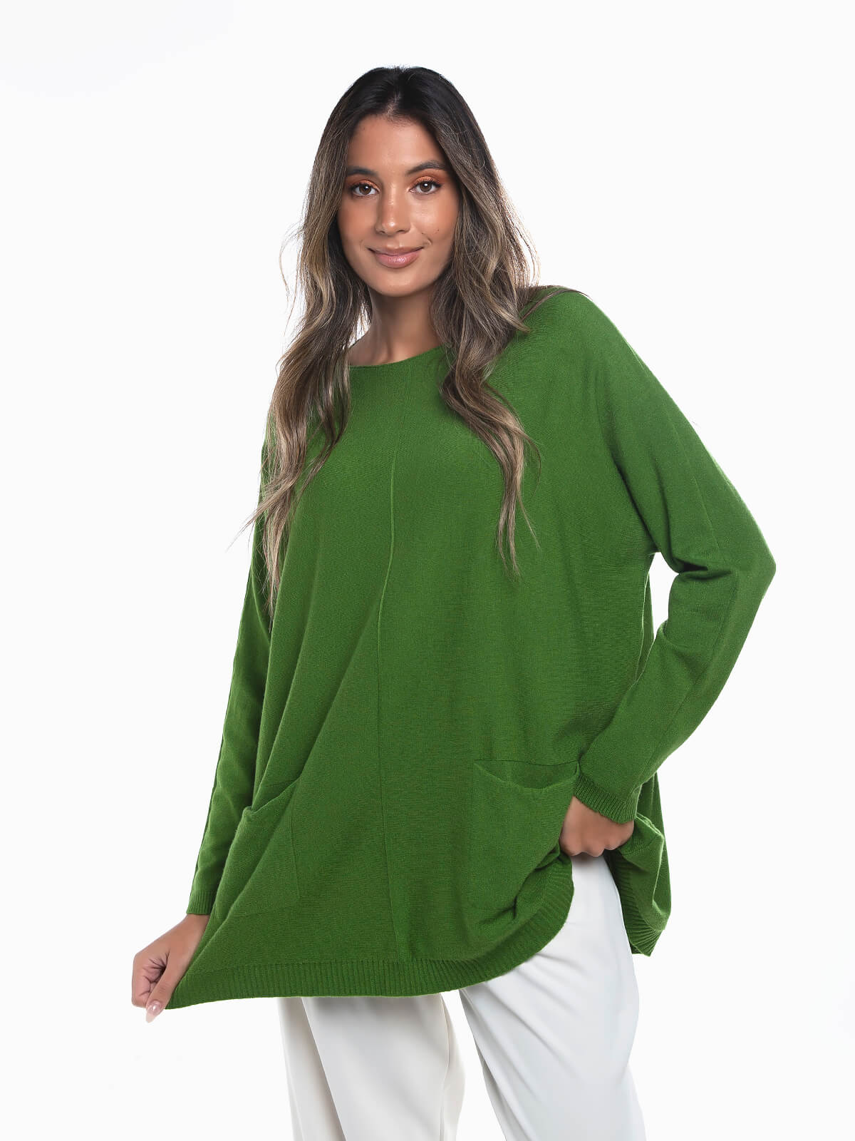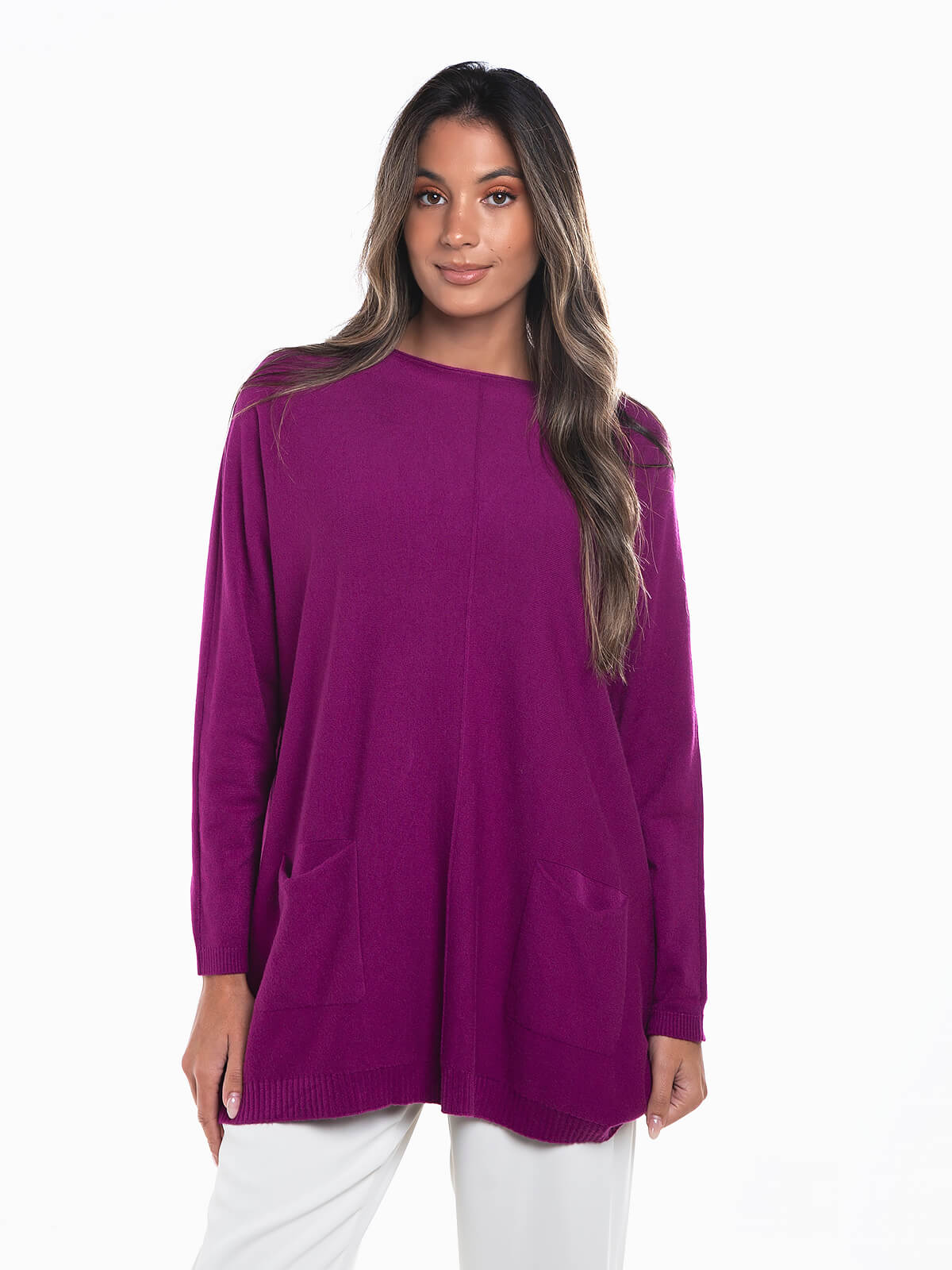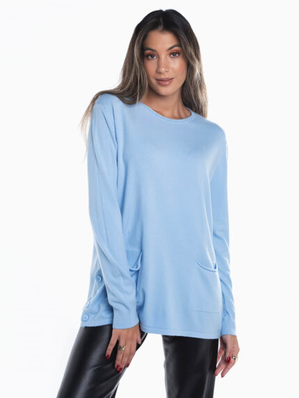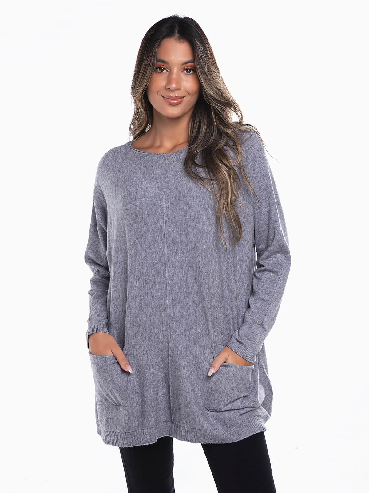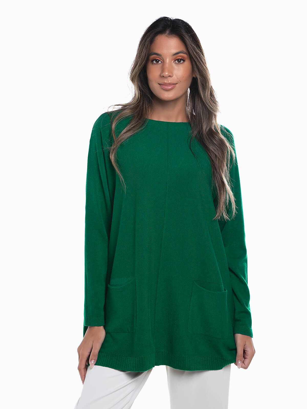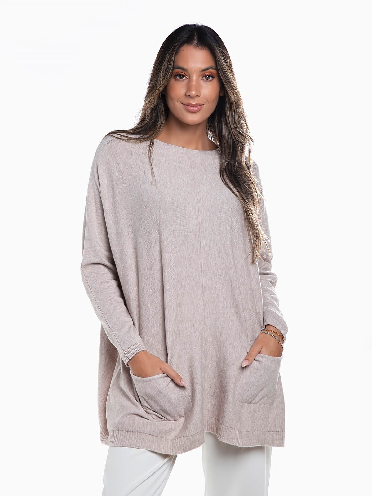 Camisola de malha com 2 bolsos à frente. Camisola larga manga comprida com decote redondo.