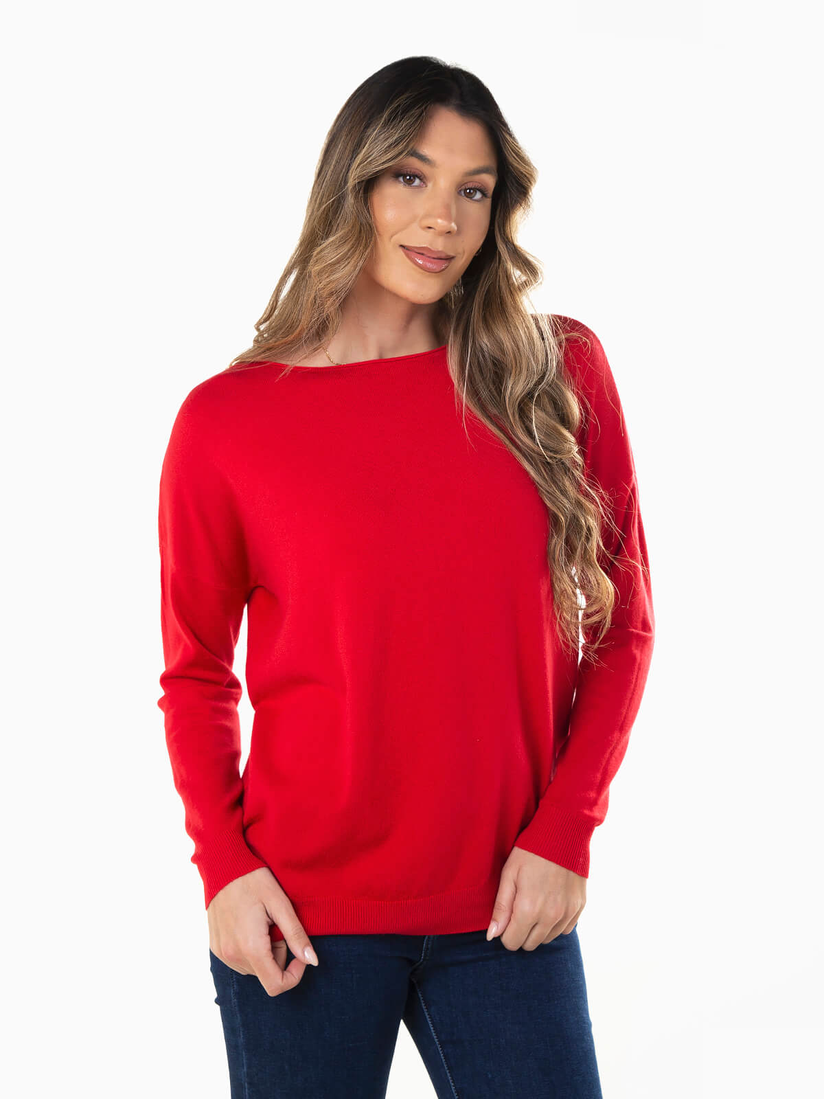 Camisola de malha com acabamento rolling para senhora. Camisola de manga comprida com decote barco e extremidades caneladas.