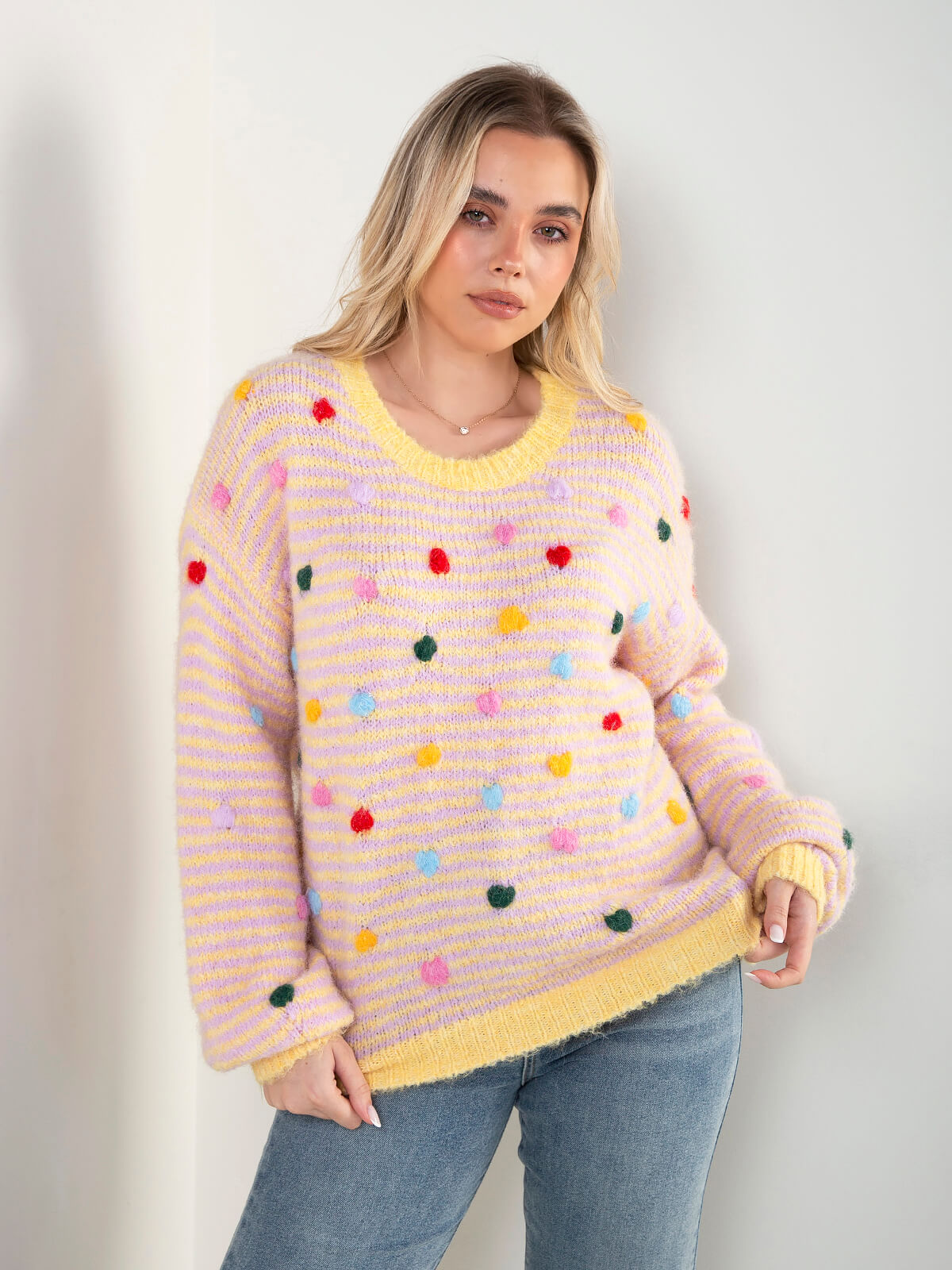 Camisola de malha macia em tom amarelo, com padrão às riscas e detalhes em pompons multicolor. Gola redonda e corte confortável, ideal para looks descontraídos com um toque divertido.
