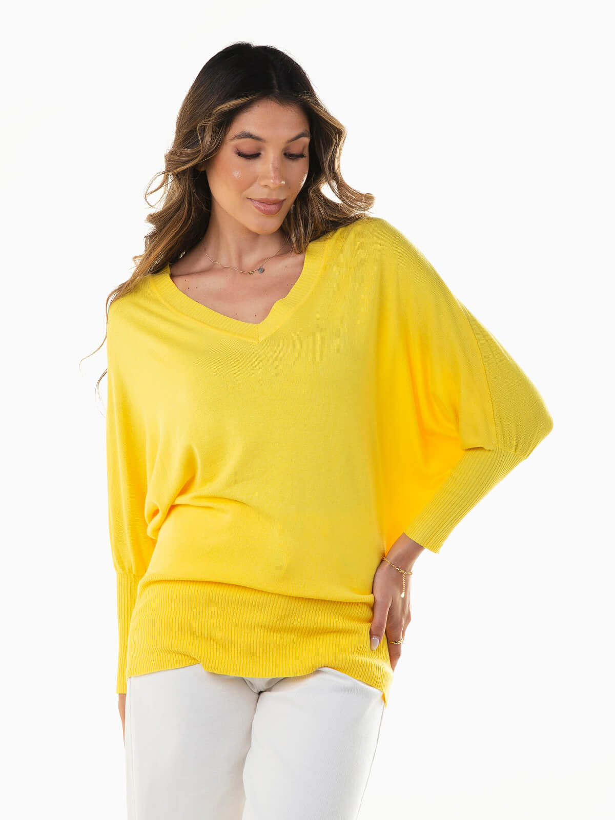 Camisola amarela em malha com mistura de viscose para maior conforto. Camisola de manga morcego com extremidades caneladas. Decote em V.