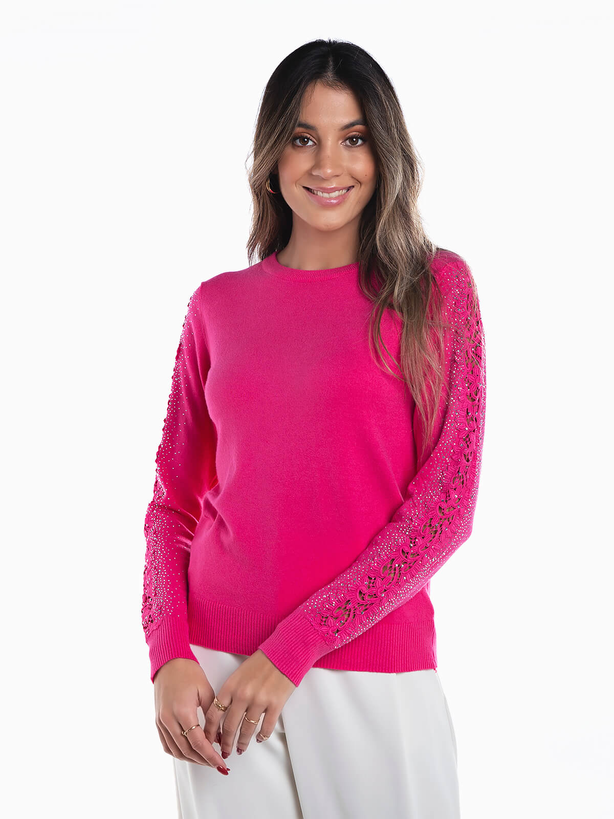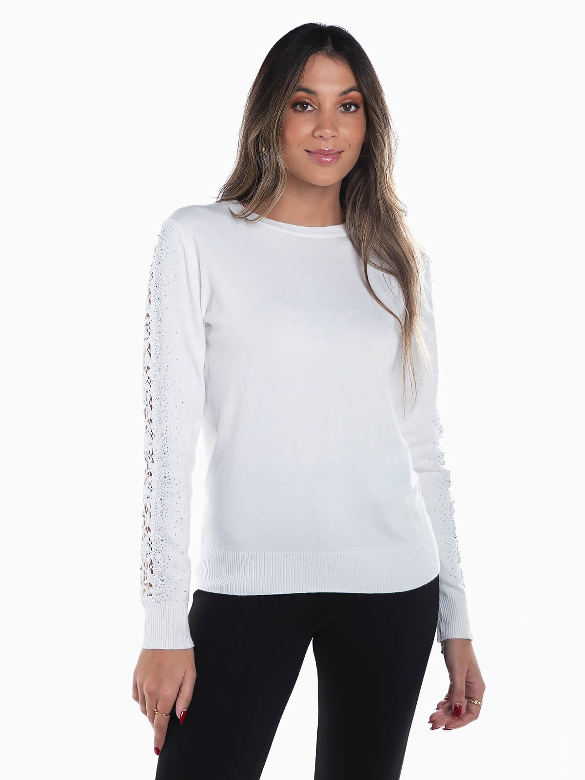 Camisola malha com aplicações de brilhos e encaixe renda nas mangas. Camisola com gola redonda e acabamentos em nervuras.