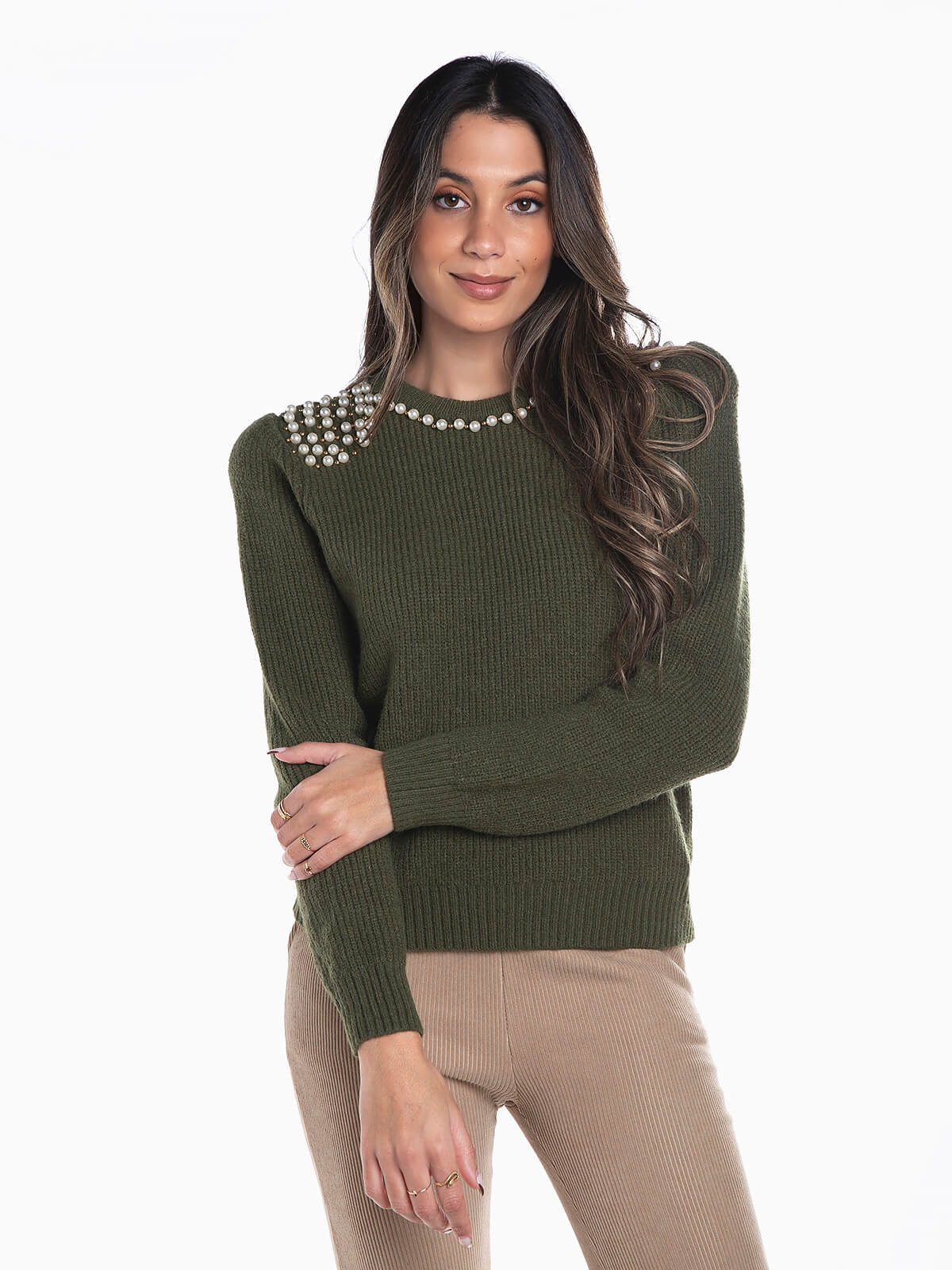Camisola em malha com aplicação de pérolas para senhora. Camisola manga comprida com ombreiras. Decote redondo. Acabamentos em nervuras.