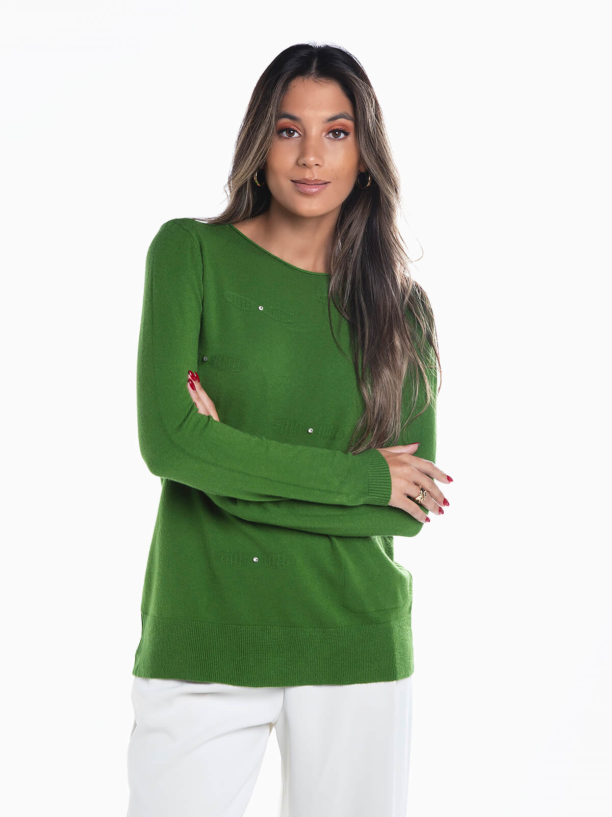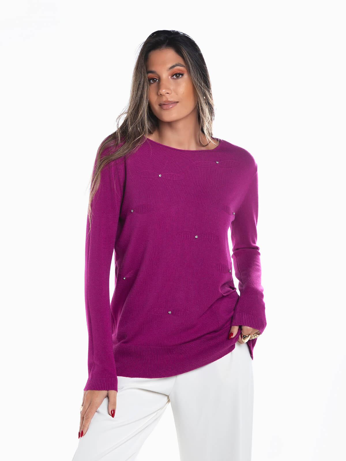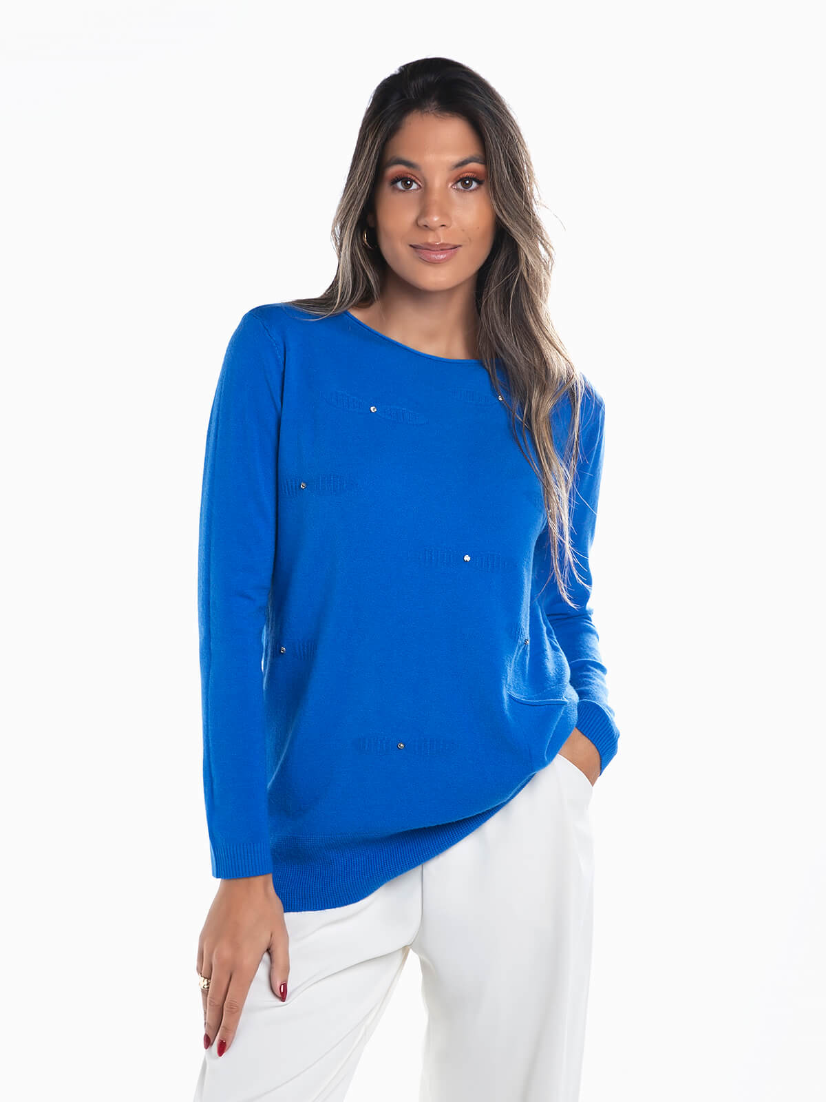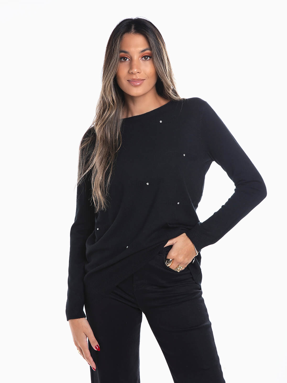Camisola de malha com aplicações de pedras brilhantes para senhora. Camisola manga comprida com decote redondo e 1 bolso. Acabamentos canelados.