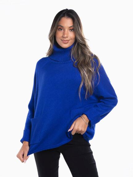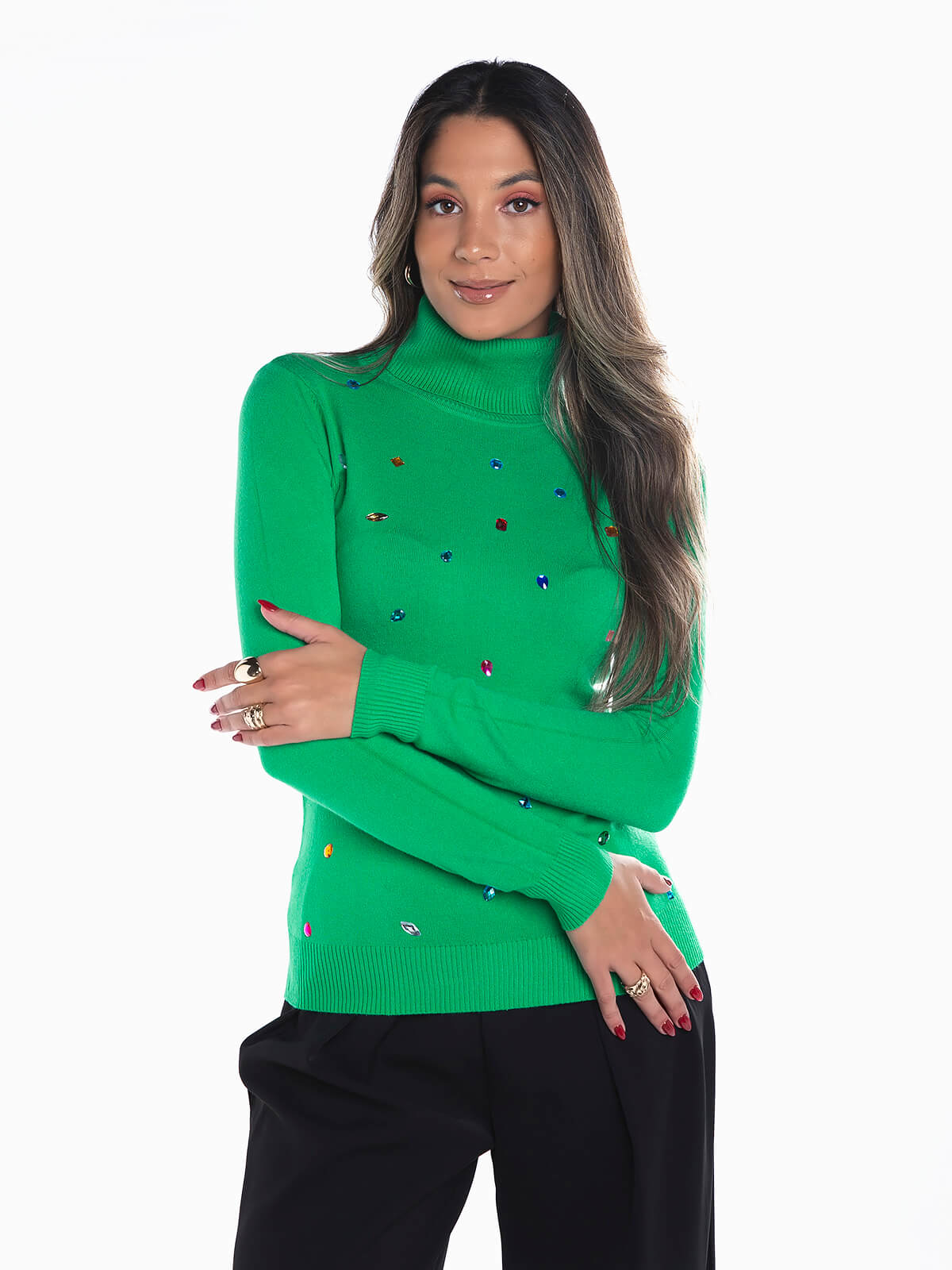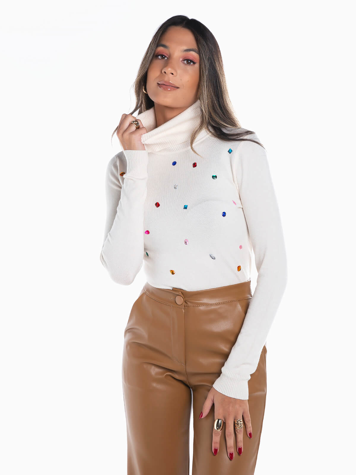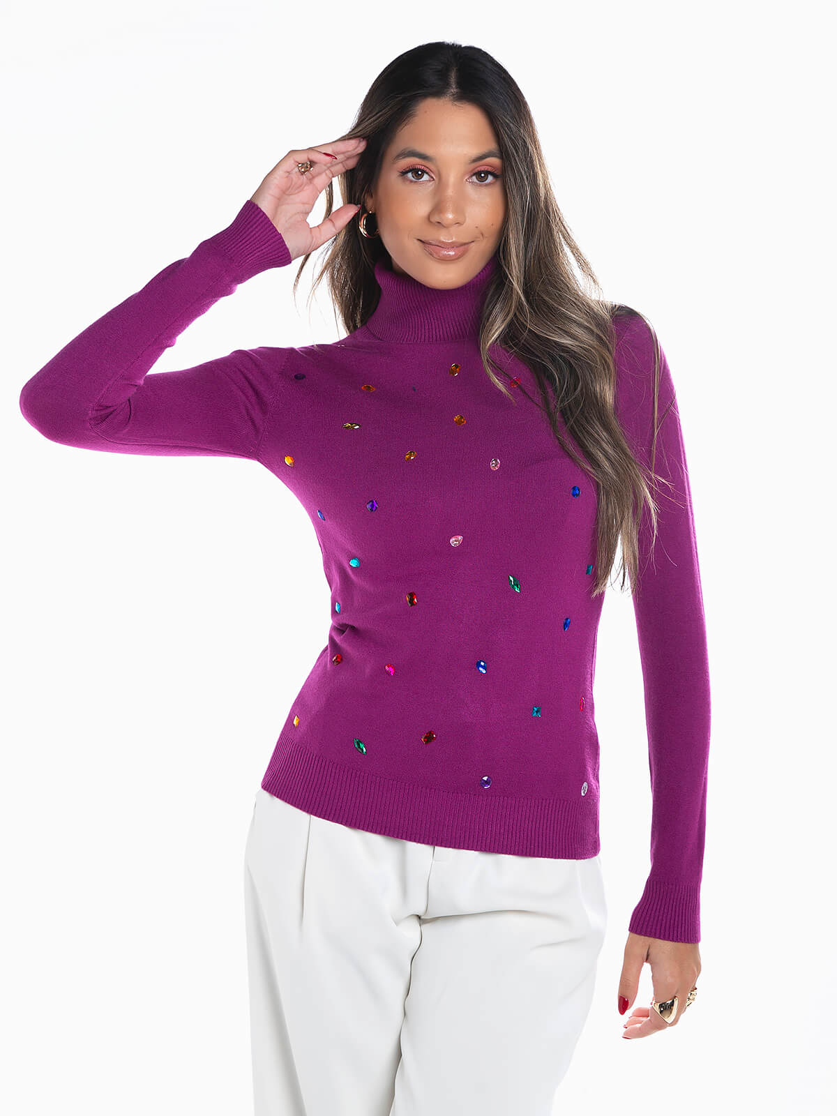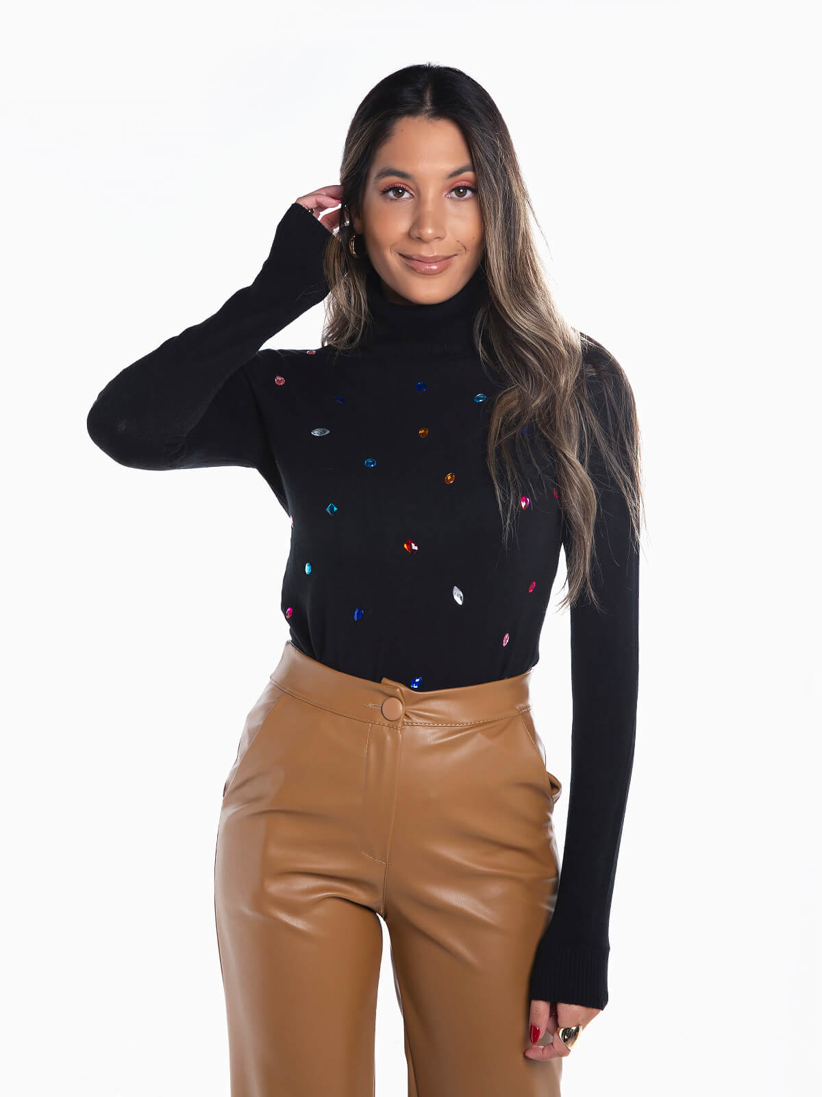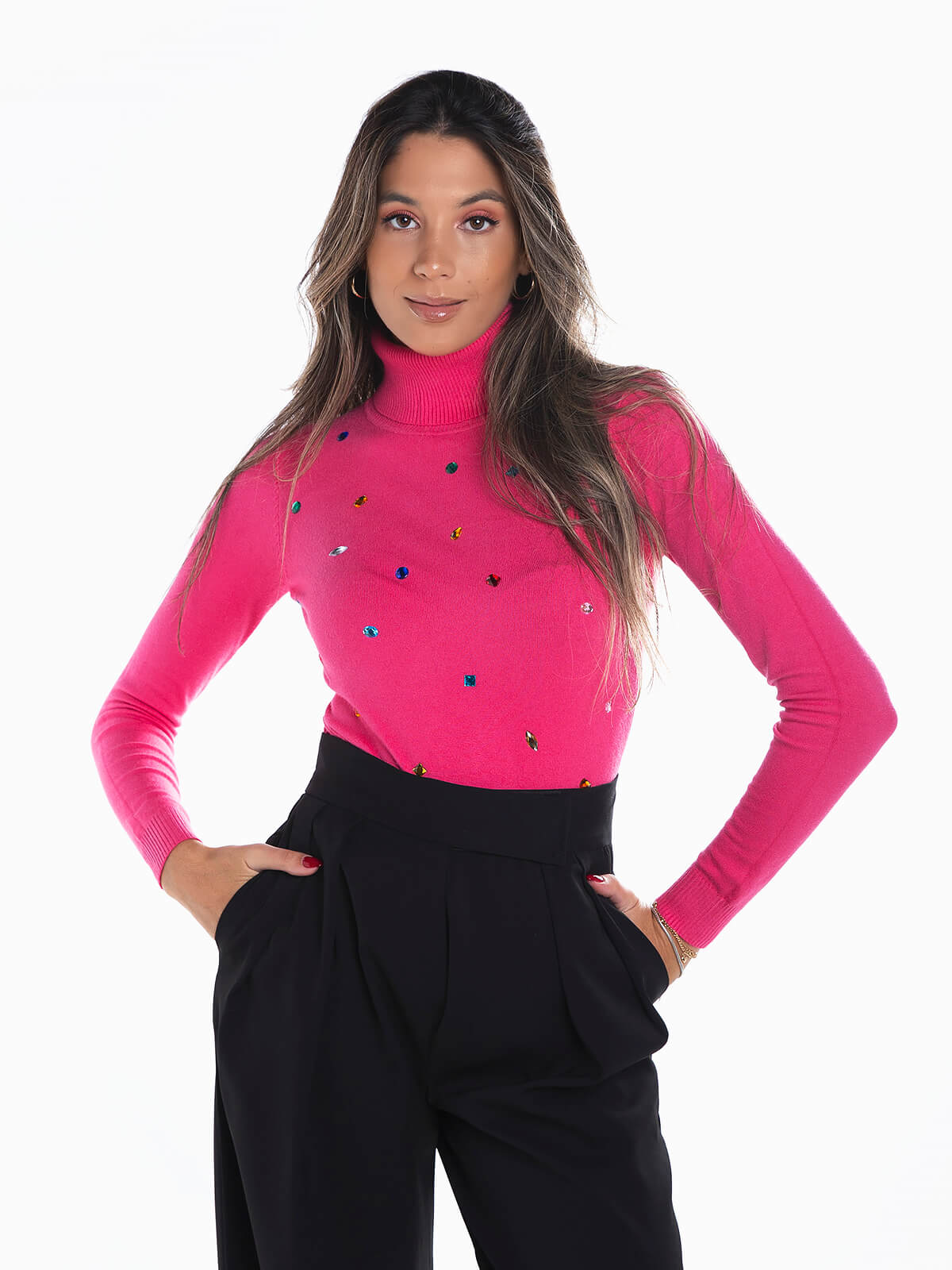 Camisola malha com aplicações de pedras coloridas. Camisola gola alta com manga comprida e acabamentos canelados.