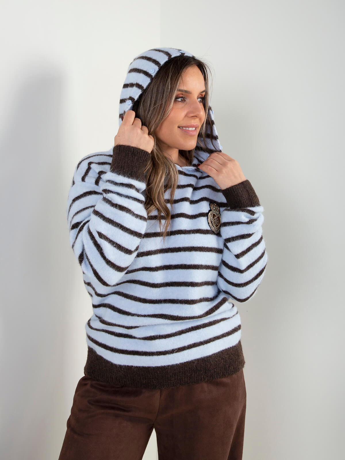 Camisola malha às riscas com capuz e pelo