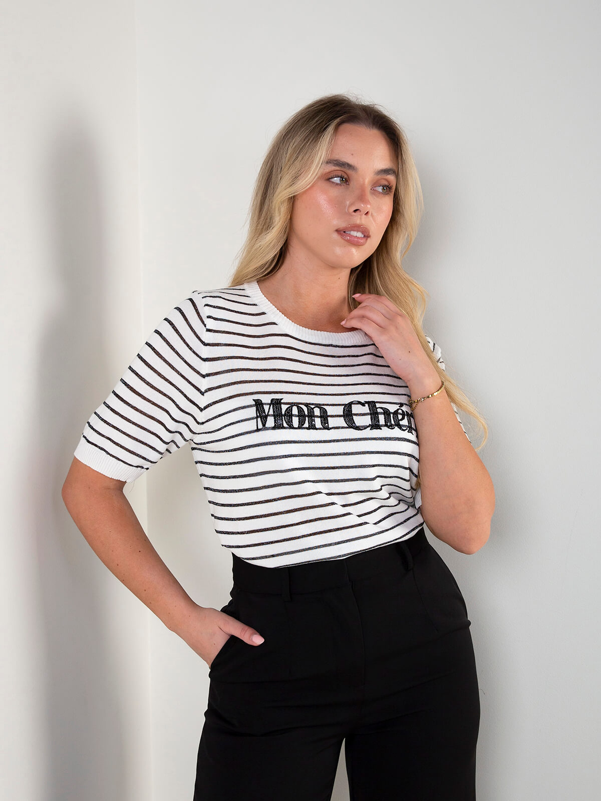 Camisola de malha às riscas com manga curta e detalhe de lantejoulas na frente. Confortável e atual, ideal para looks urbanos com um toque de brilho.