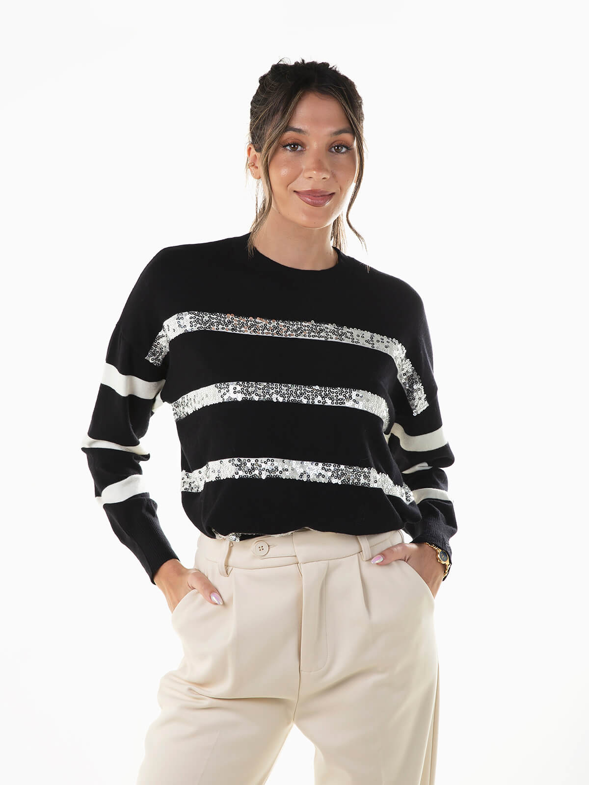 Camisola malha às riscas com lantejoulas brilhantes aplicadas à frente. Camisola de manga comprida com ombros descaídos e acabamentos canelados. Decote redondo.
