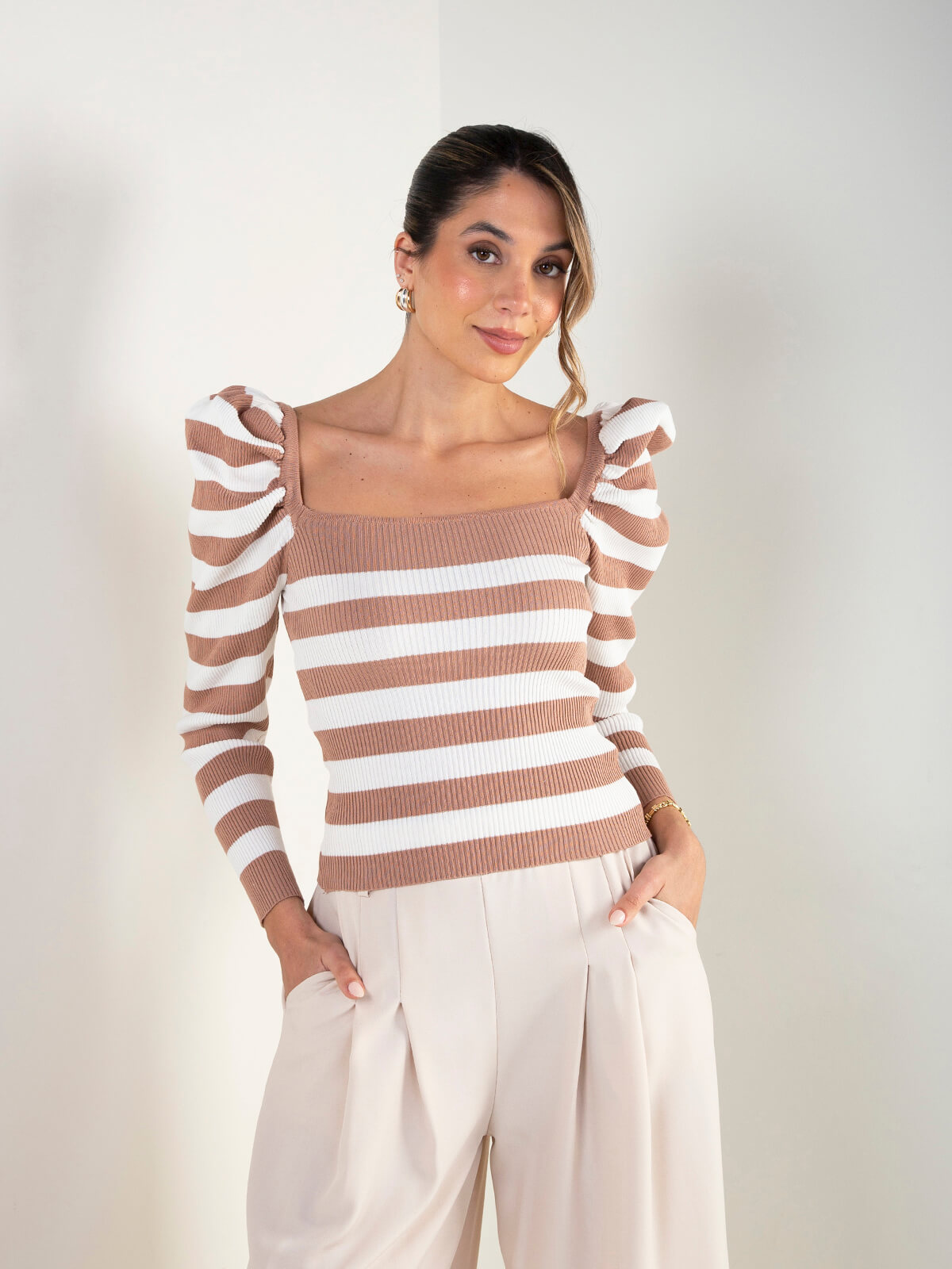 Camisola de malha canelada às riscas, com decote quadrado e mangas abalonadas. Um modelo feminino, atual e fácil de conjugar.