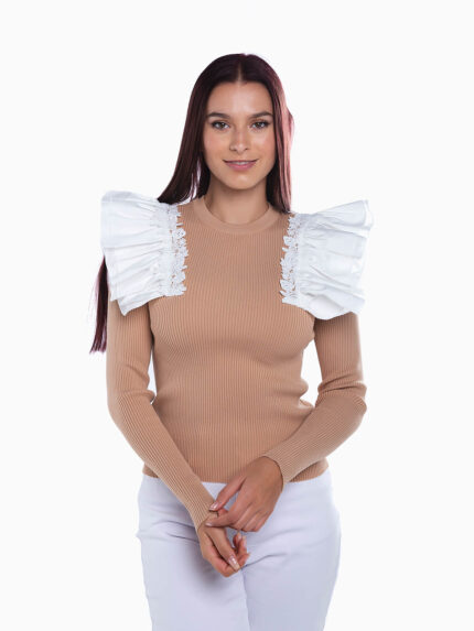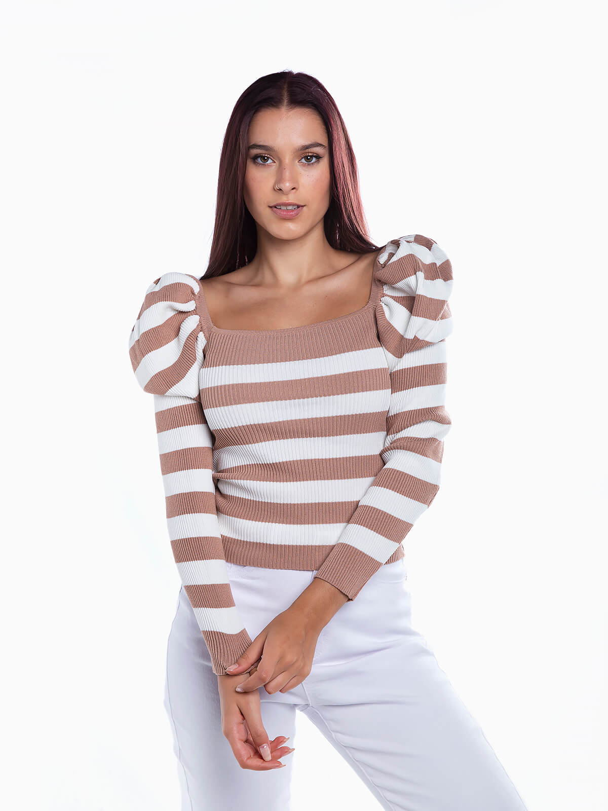 Camisola de malha canelada às riscas brancas e bege com manga balão. Camisola manga comprida com decote quadrado.