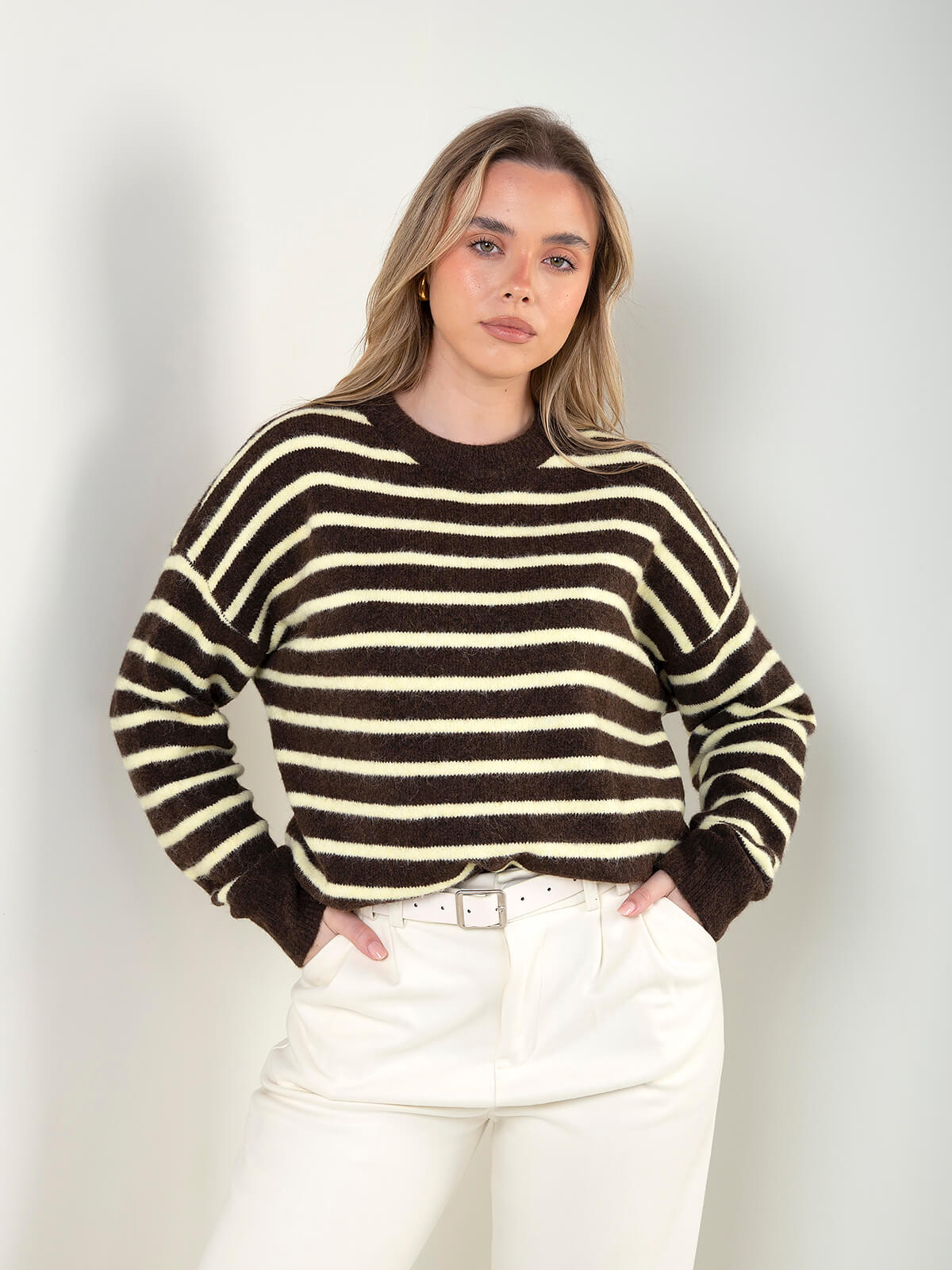 Camisola de malha com padrão às riscas, ideal para looks de inverno práticos e atuais. Modelo oversized, com gola redonda e acabamento em malha canelada nos punhos e na bainha. Perfeita para combinar com jeans ou calças de malha no dia a dia.