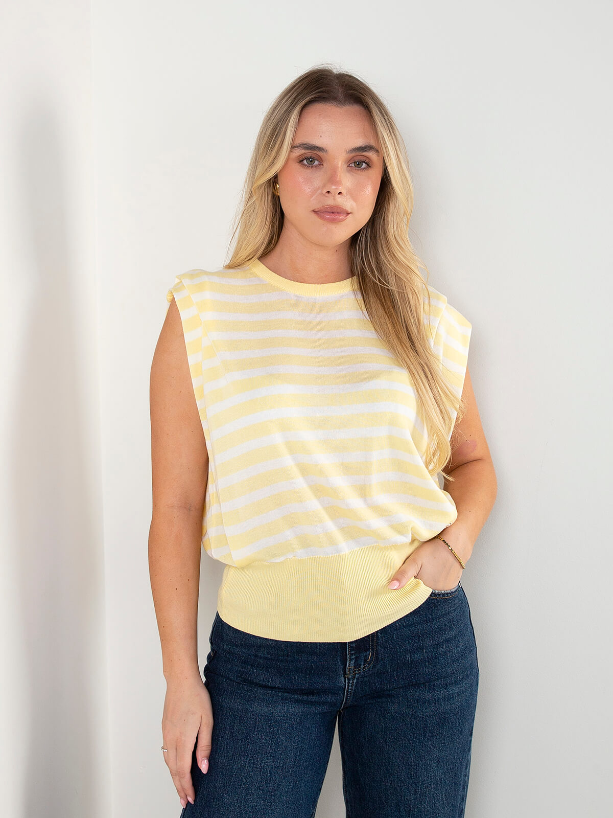 Camisola de malha leve às riscas sem mangas, com ombro estruturado que acrescenta volume ao look. Decote redondo e acabamento canelado na base. Um modelo confortável e atual, ideal para looks descontraídos com um toque tendência.