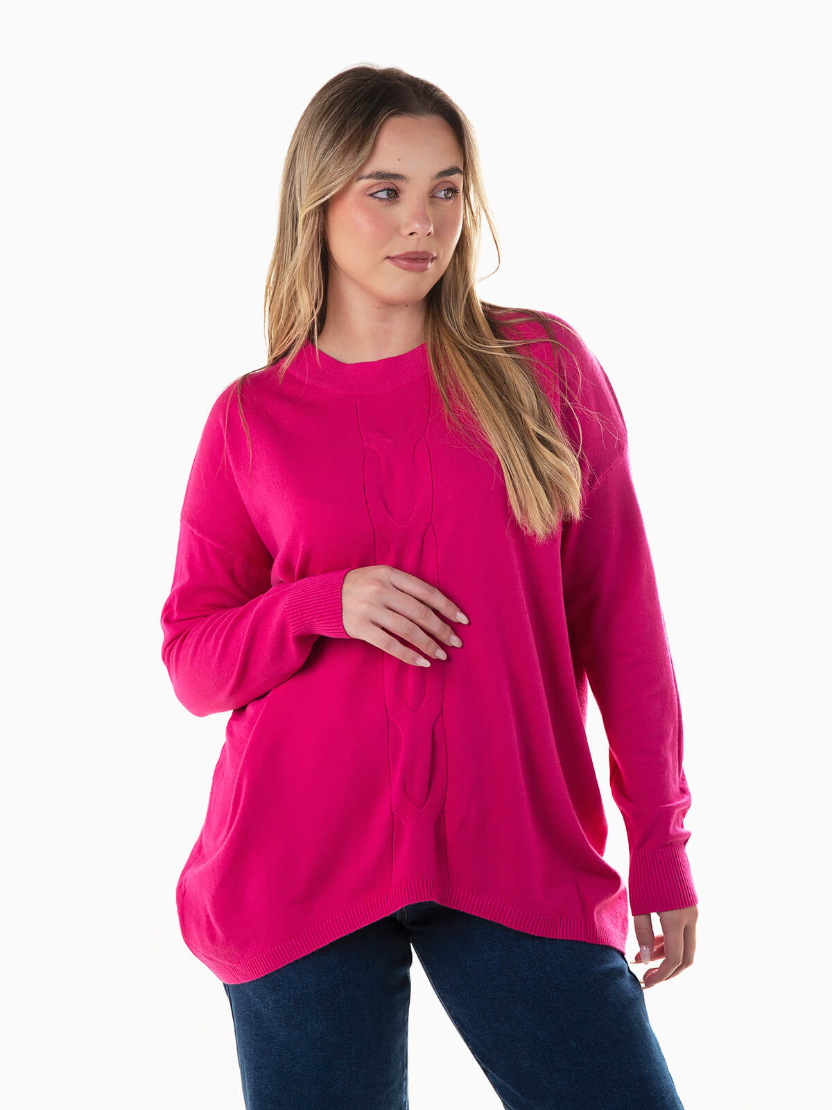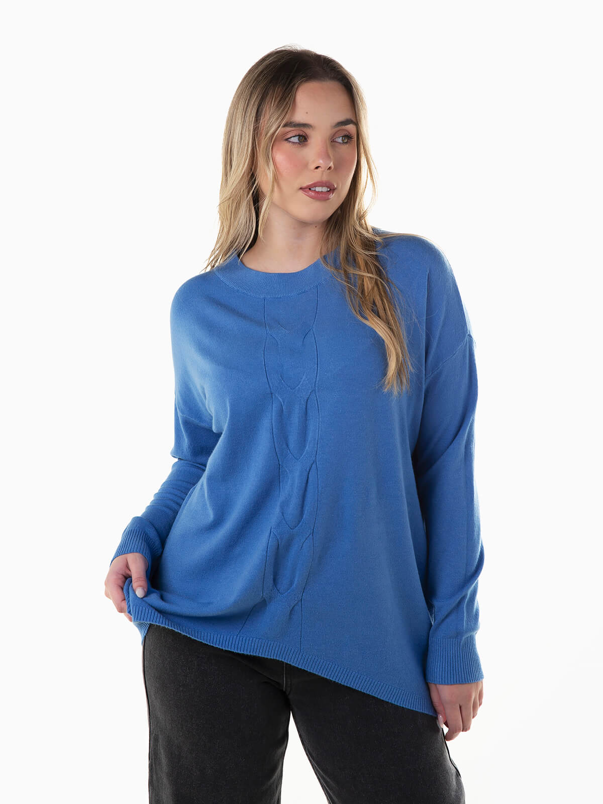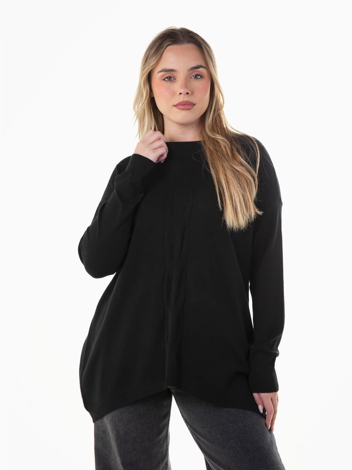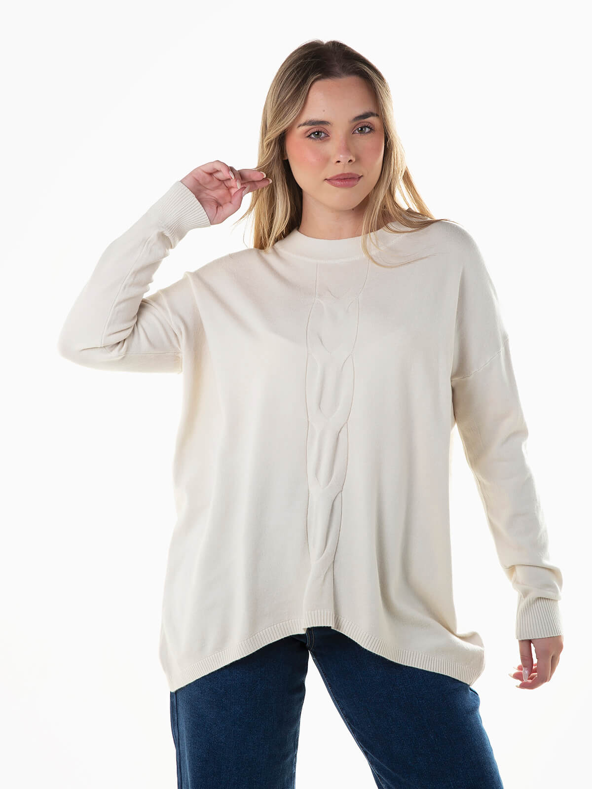 Camisola malha com corte assimétrico para mulher. Camisola larga de manga comprida com pormenor trançado à frente. Decote redondo com nervuras.