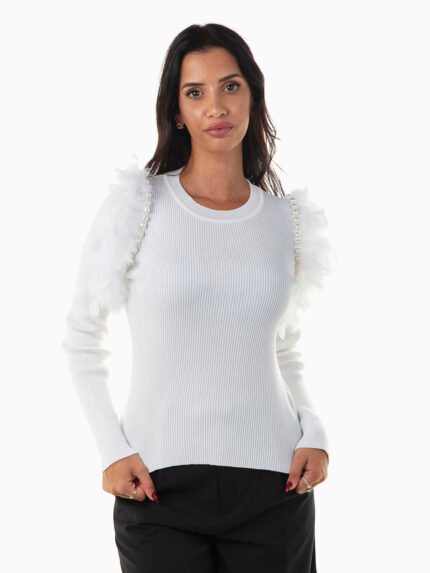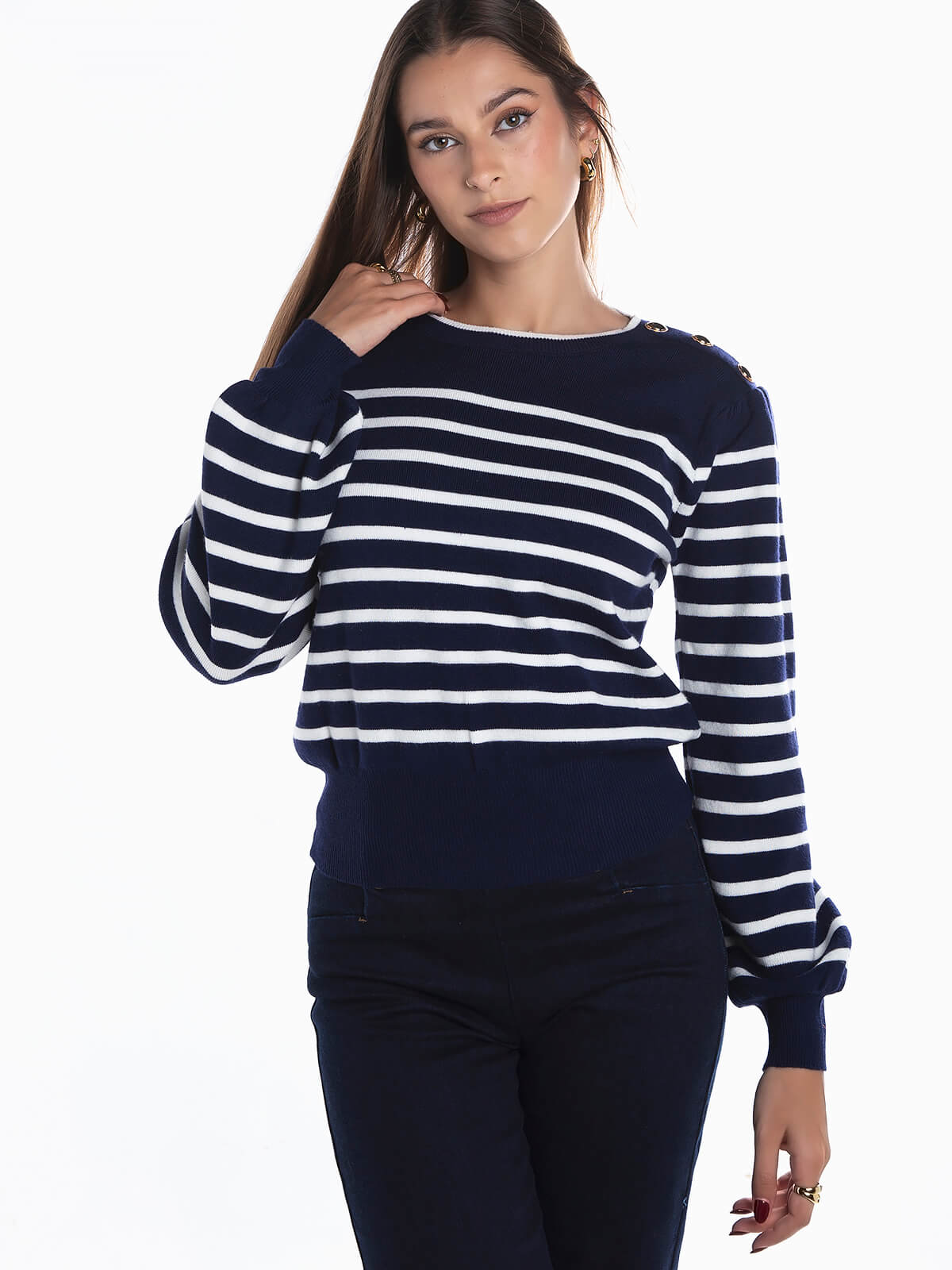 Camisola malha azul marinho às riscas para senhora. Camisola manga comprida abalonada com extremidades caneladas. Decote redondo e pormenor de botões dourados.